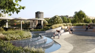 На крыше стилобата создали уютный двор-парк, где приятно расслабиться от шума мегаполиса, посидеть с книжкой или встретиться с другом.