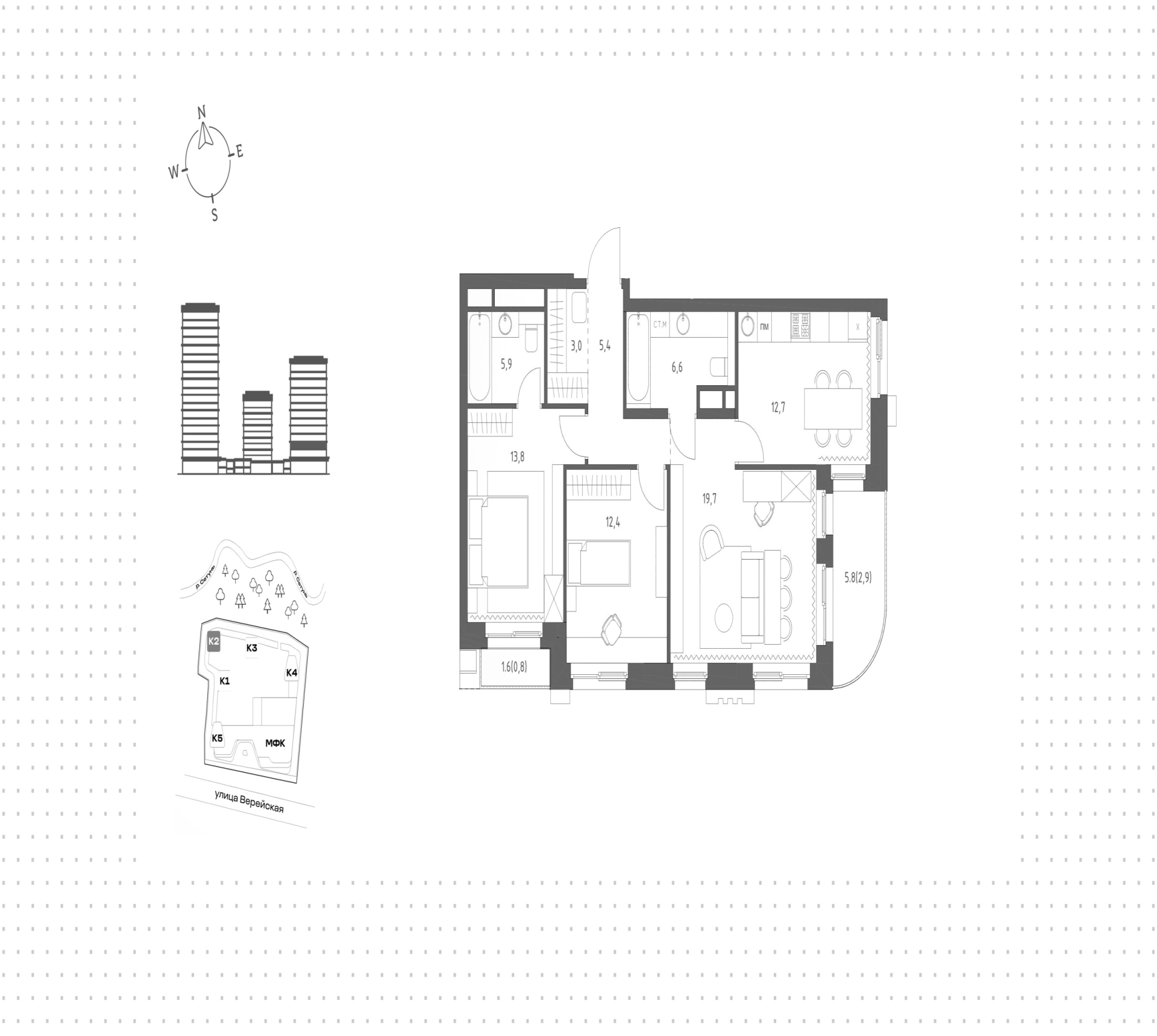 В комплексе доступны квартиры разных площадей и двухуровневые таунхаусы с террасами и видом на природный заказник.