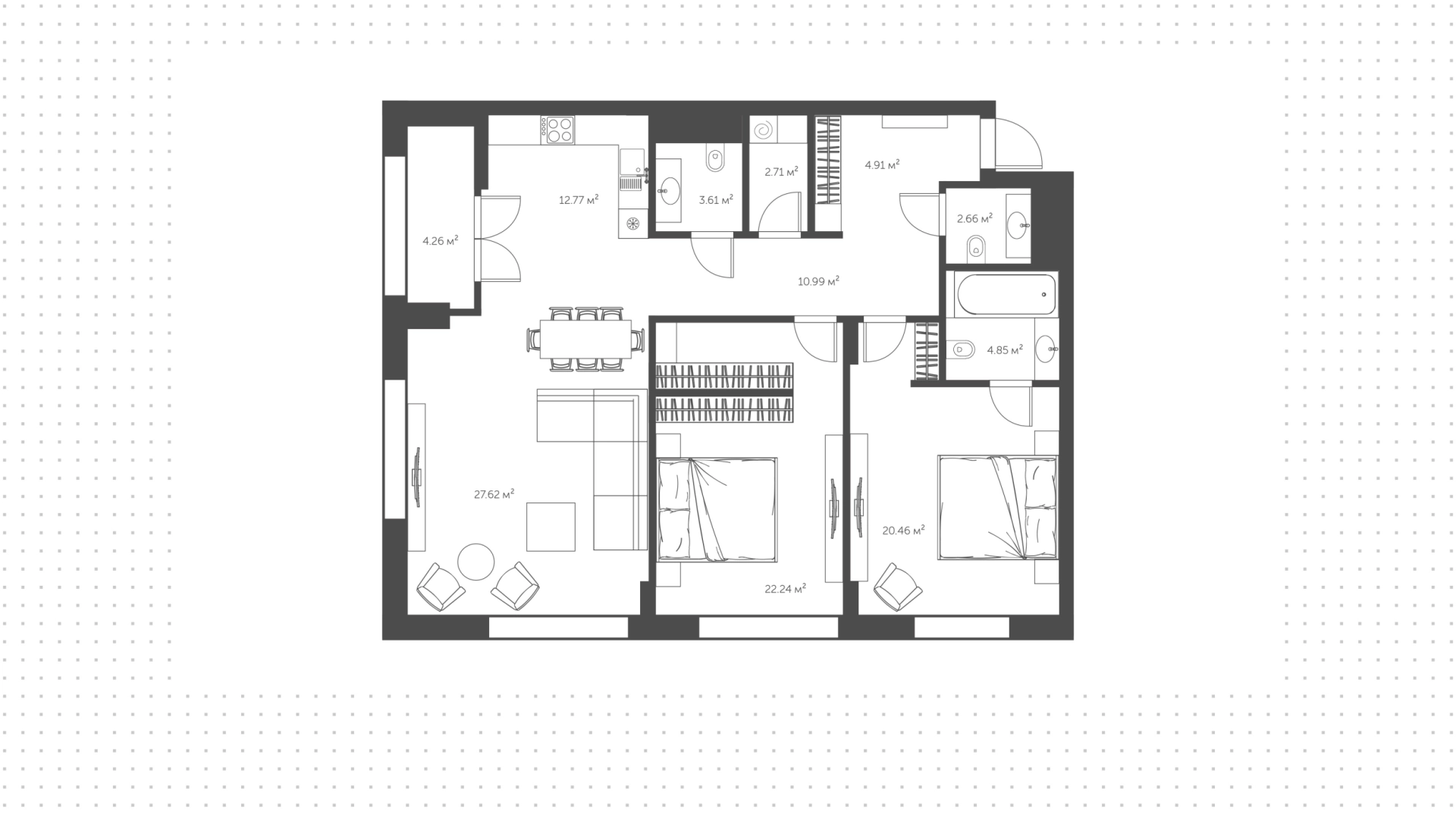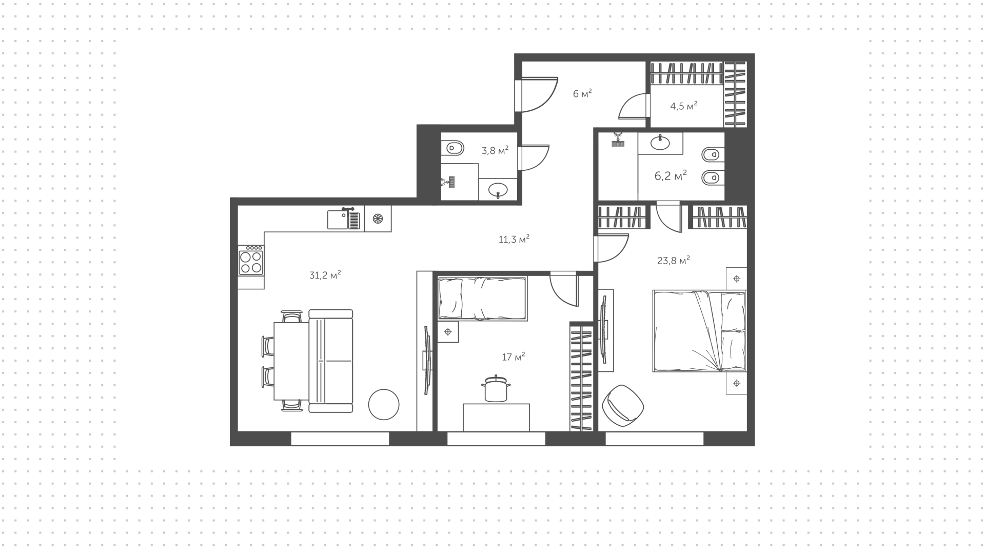 Вы можете выбрать квартиру с 1 спальней или просторную резиденцию с 2-4 спальнями. Во всех лотах — панорамные окна, эргономичные планировки, высота потолков до 4 метров. Площадь квартир — от 30 до 598 м².