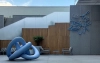 The facade is clad with anodized mesh aluminum panels, which create a weightless effect. In the evening, the house seems to glow from within thanks to architectural lighting, and the rounded balconies resemble stacks of coins.