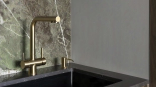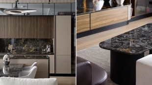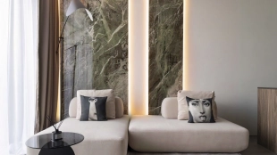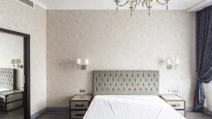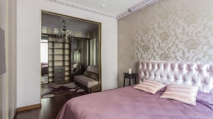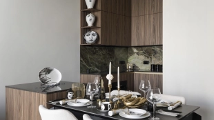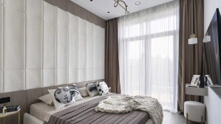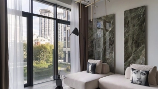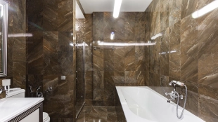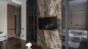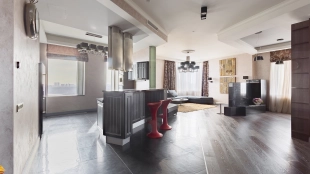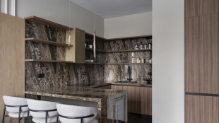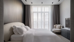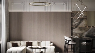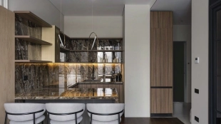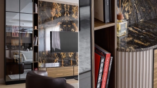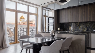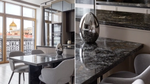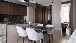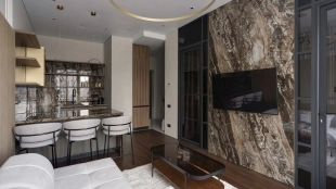 Two-bedroom apartment with a total area of 144 m² is located on the fourth floor of the deluxe-class complex "Residence on Vsevolozhskoye". Natural materials are used in the interior: stone, wood, American walnut veneer, Brazilian and Indian granite.