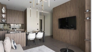 One bedroom apartment with a total area of 45 m² on the tenth floor of the West Garden business class residential complex. Panoramic windows fill the rooms with warm sunlight and open views of the lively city and landscaped courtyard.