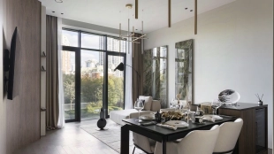 A 3-bedroom apartment with an area of 210 m² in the business class complex "House on Mosfilmovskaya" on the 21st floor. Modern finishing with the use of natural materials.