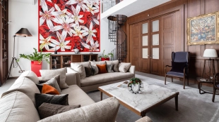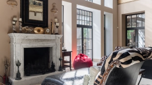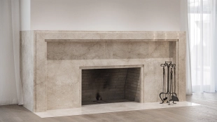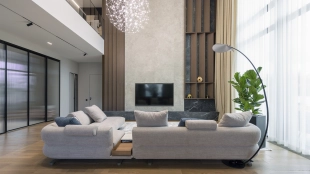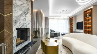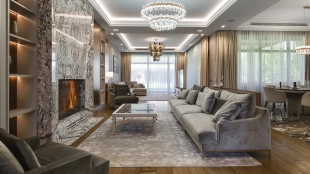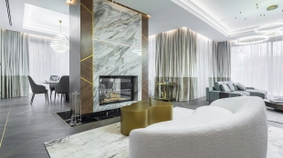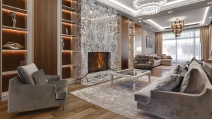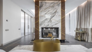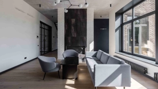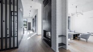 Country house with minimalistic interior and fireplace hall