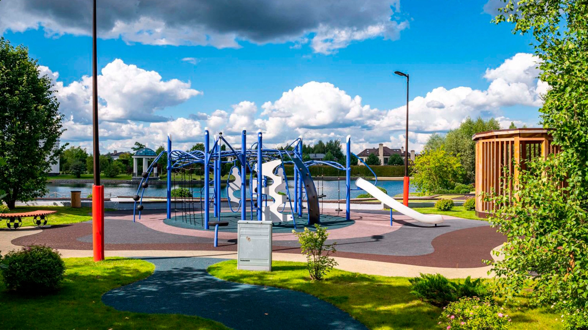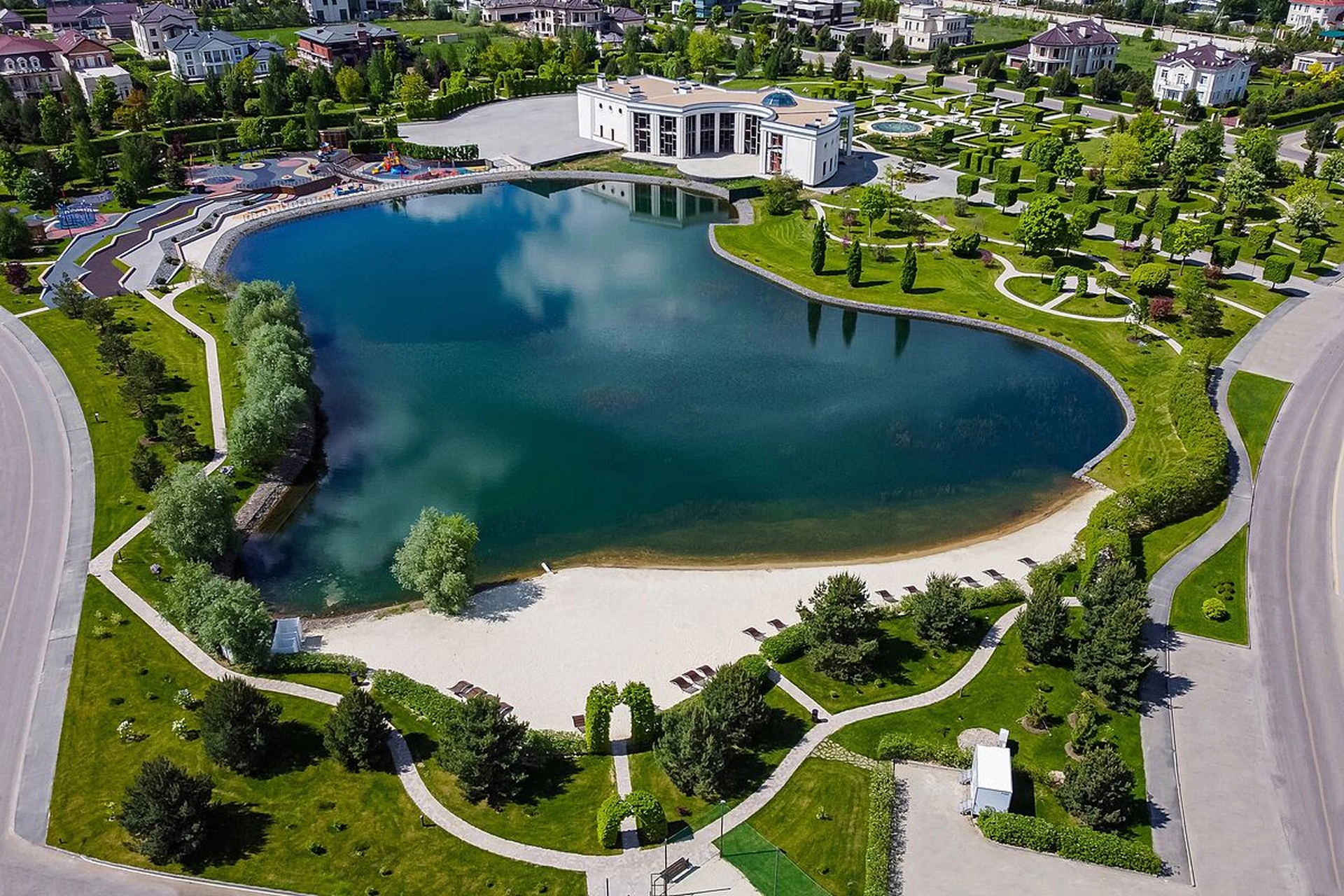 The central recreation area is a natural park with a lake and a beach. The territory is decorated with pavilions, rotundas, fountains, flower beds and decorative bridges. Wide illuminated streets and sidewalks are made of paving stones or asphalt, convenient routes for walking and cycling are provided. For the convenience of residents and guests of the village built a spacious guest parking lot.