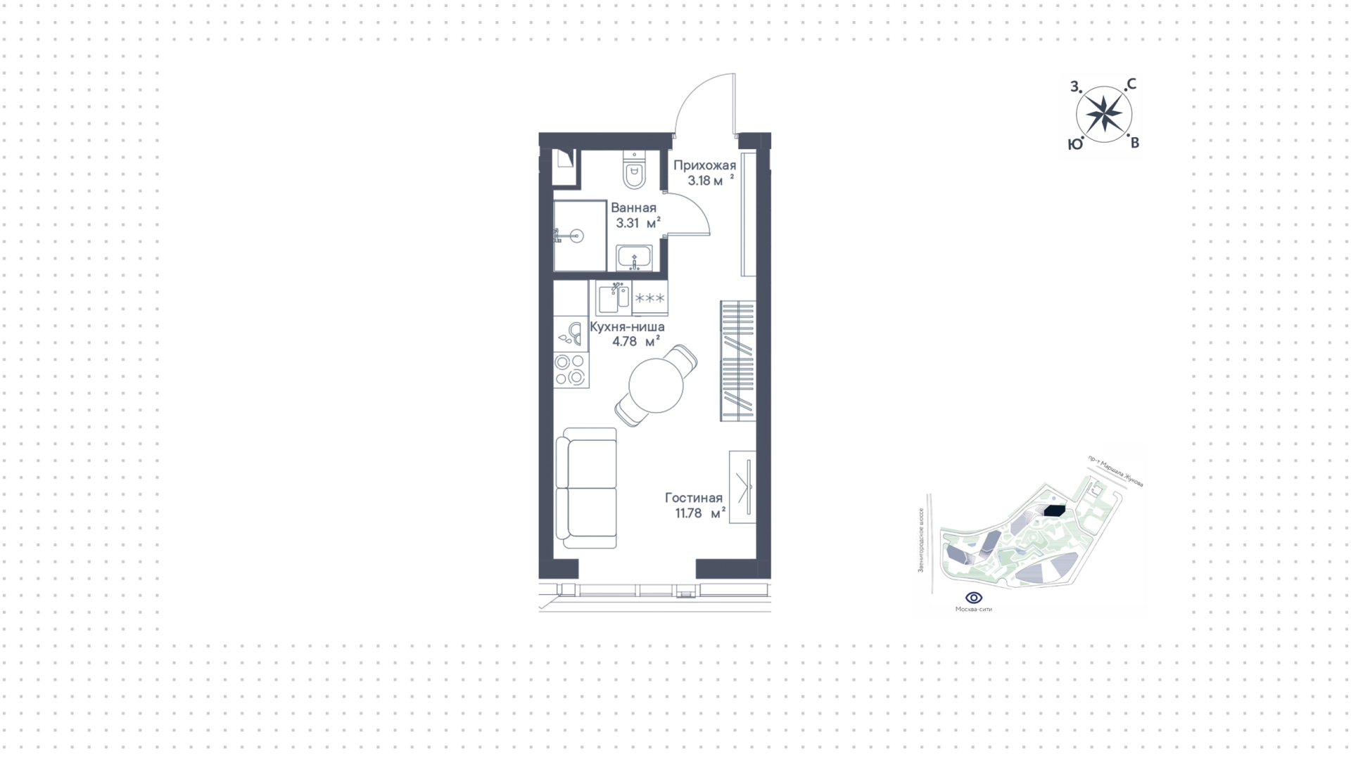 The price per meter starts at 401,386 ₽/m², a one-bedroom apartment can be bought for 15,682,330 ₽, a family three-bedroom for 37,455,619 ₽.