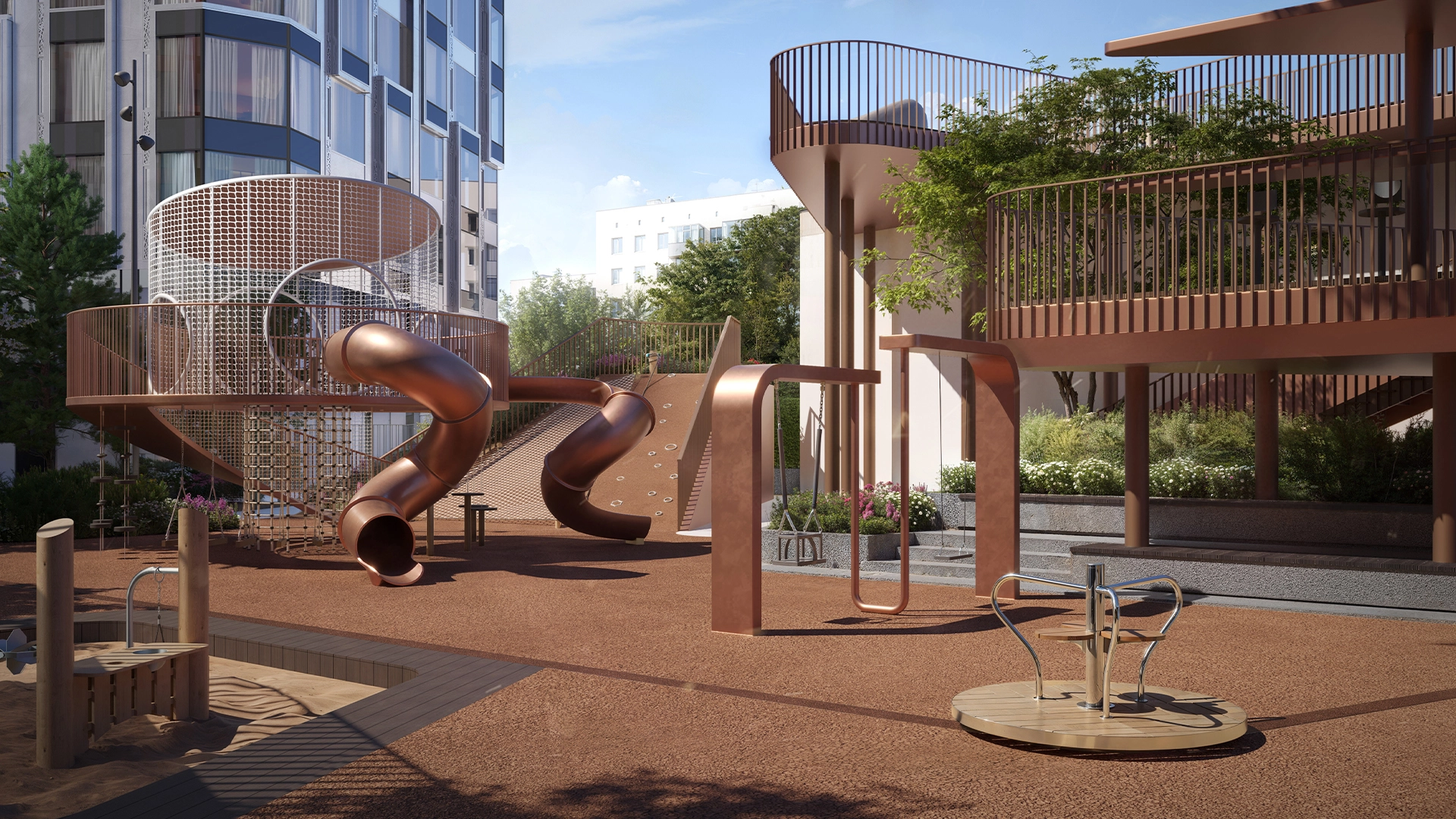 The complex offers 916 apartments with different layouts, including duplex apartments and apartments with corner glazing.