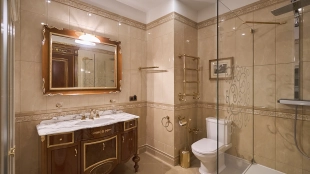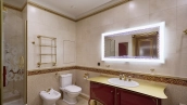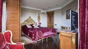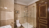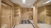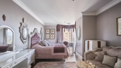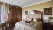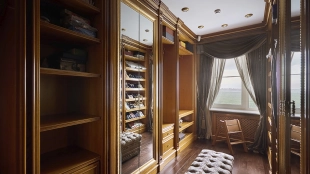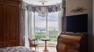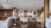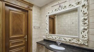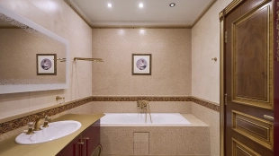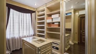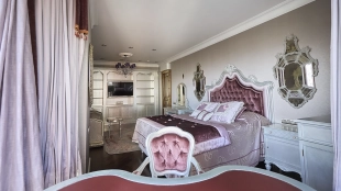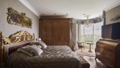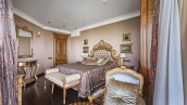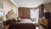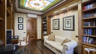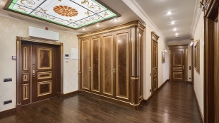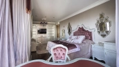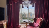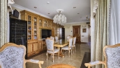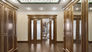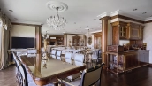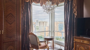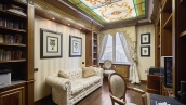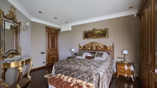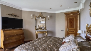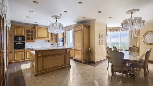 A 6-bedroom apartment in the premium class complex "Mirax Park". The apartment with an area of 440 m² is located on the 22nd floor in the building 1. It is finished in palace style using natural materials. The interiors are decorated with stained glass on the ceilings, designer chandeliers, crowning cornice, stucco details and gilded fittings. Individual air conditioning system is installed.