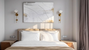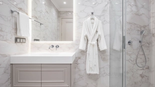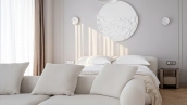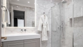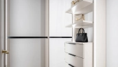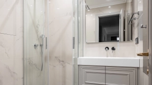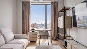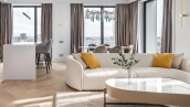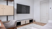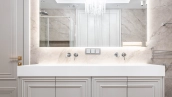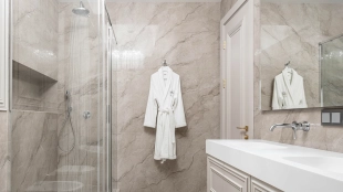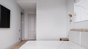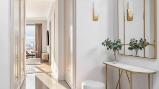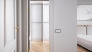 The apartment has a kitchen-living room, 2 master bedrooms with their own bathrooms and dressing rooms, 2 bedrooms, two bathrooms, a laundry room and a hallway. Thanks to panoramic glazing and 3.1 meters high ceilings, the space is filled with air and natural light. The windows offer views of Moscow City, Khodynsky Boulevard and Aviapark.