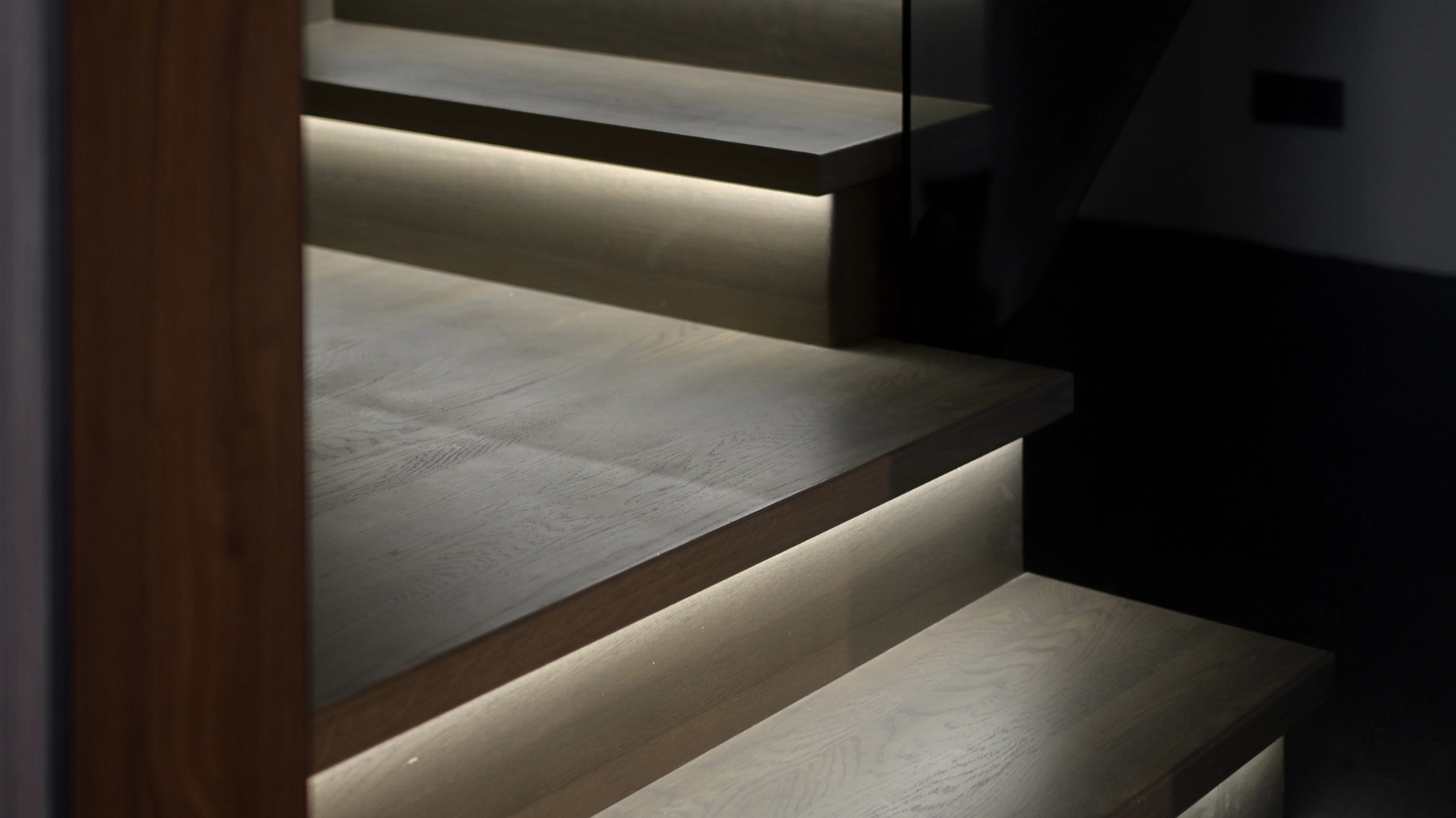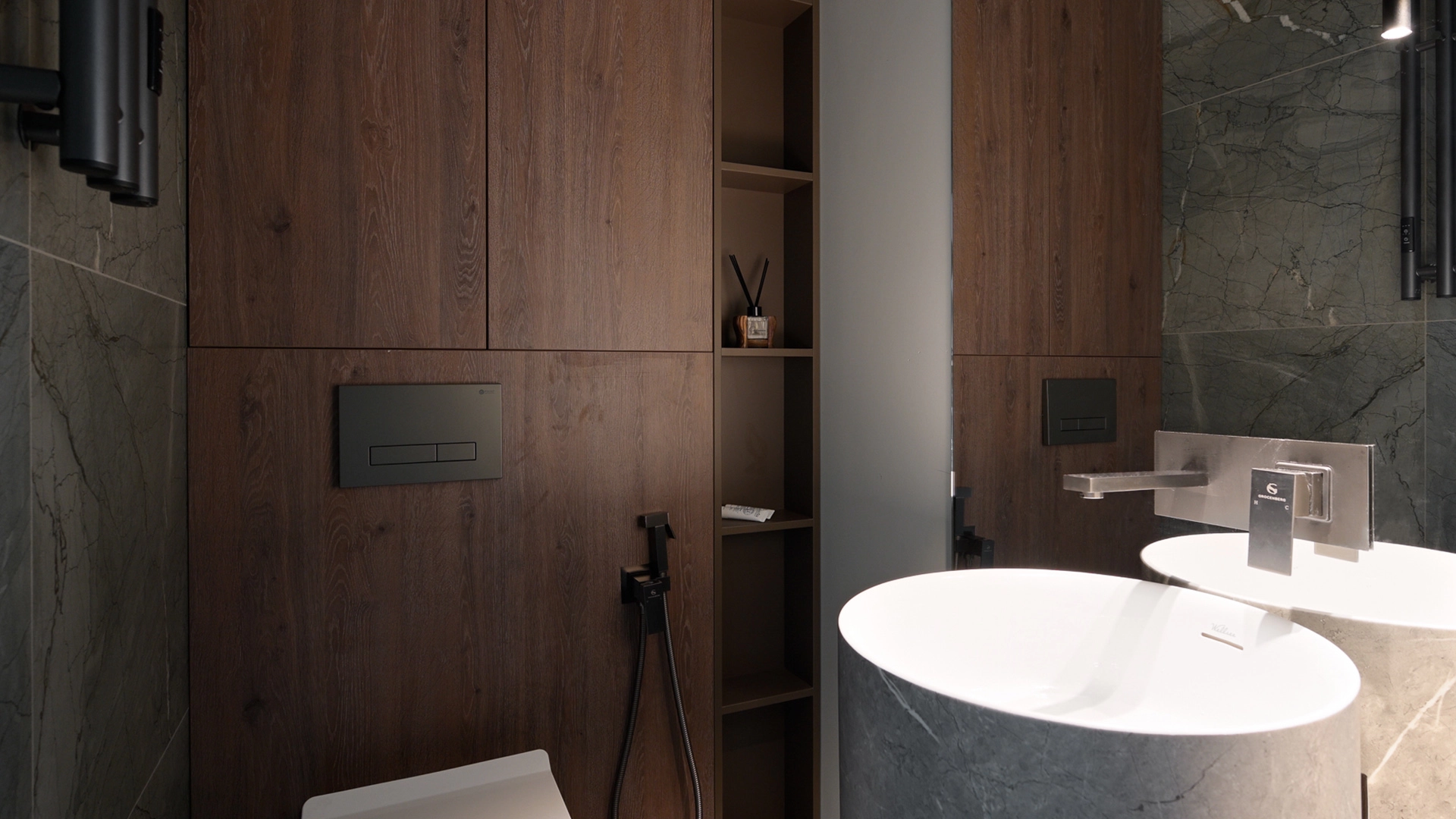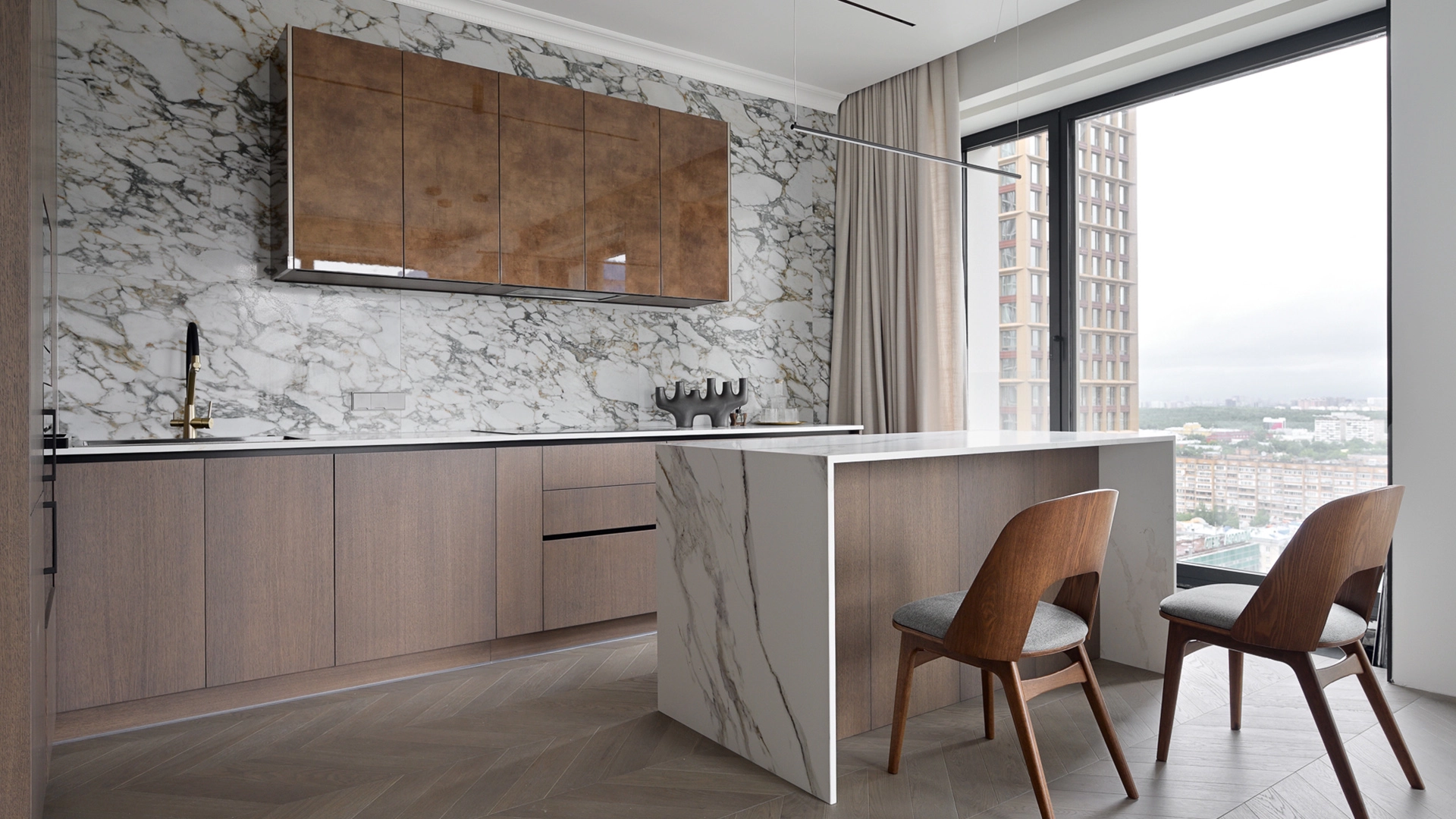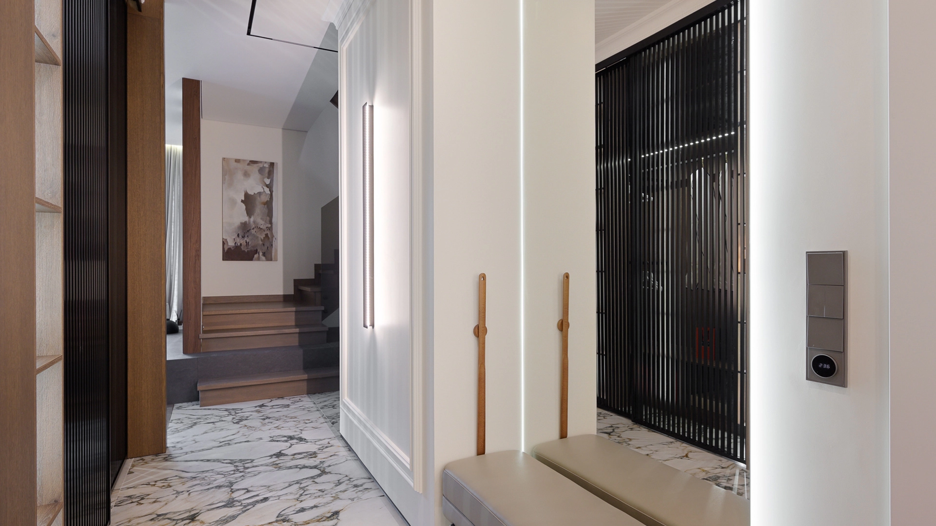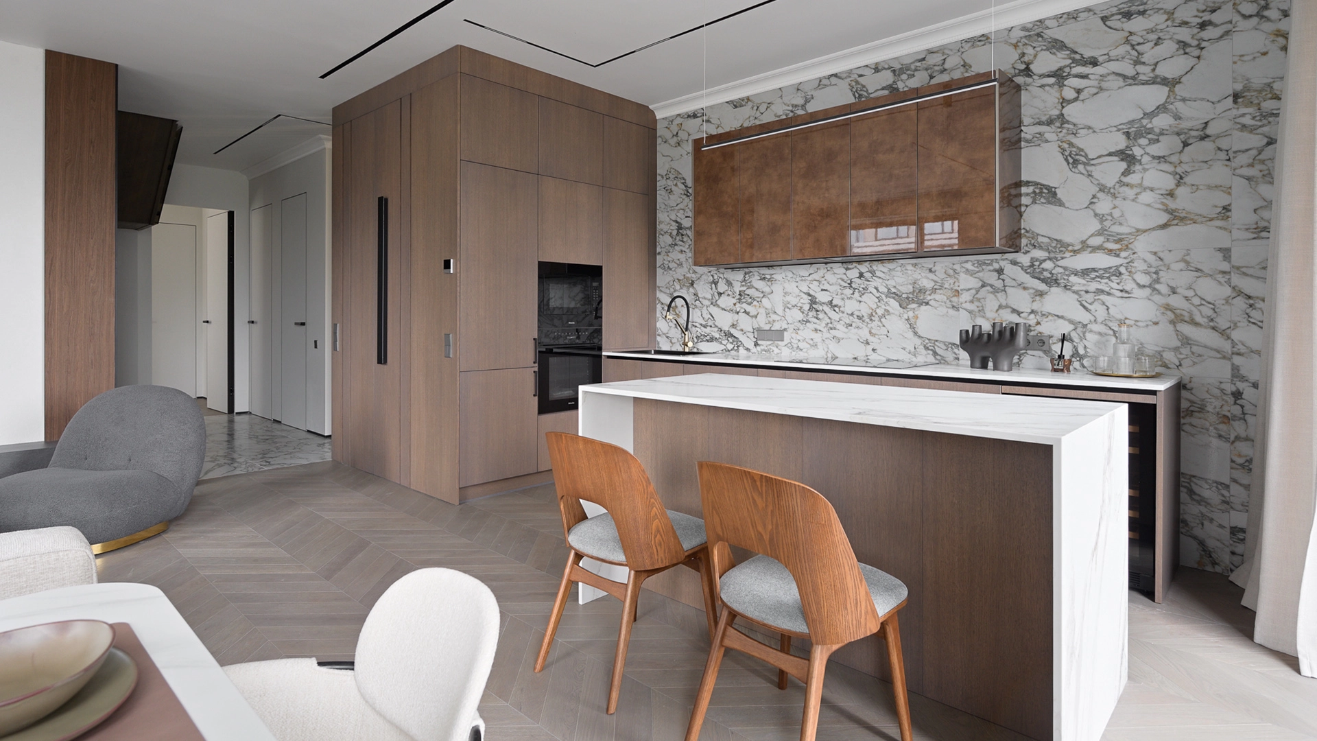 According to the design project, the floor is laid with engineering board in the form of "French herringbone", window sills are made of porcelain stoneware, the staircase has built-in "smart" lighting with motion sensors. The kitchen with an island is equipped with a set of veneer and enamel, as well as all necessary appliances of Miele and Asko brands. Union veneer doors with a height of 2.3 meters have been installed, the bathrooms are equipped with Villeroy & Boch sanitary ware, premium appliances Asko, Bosch.