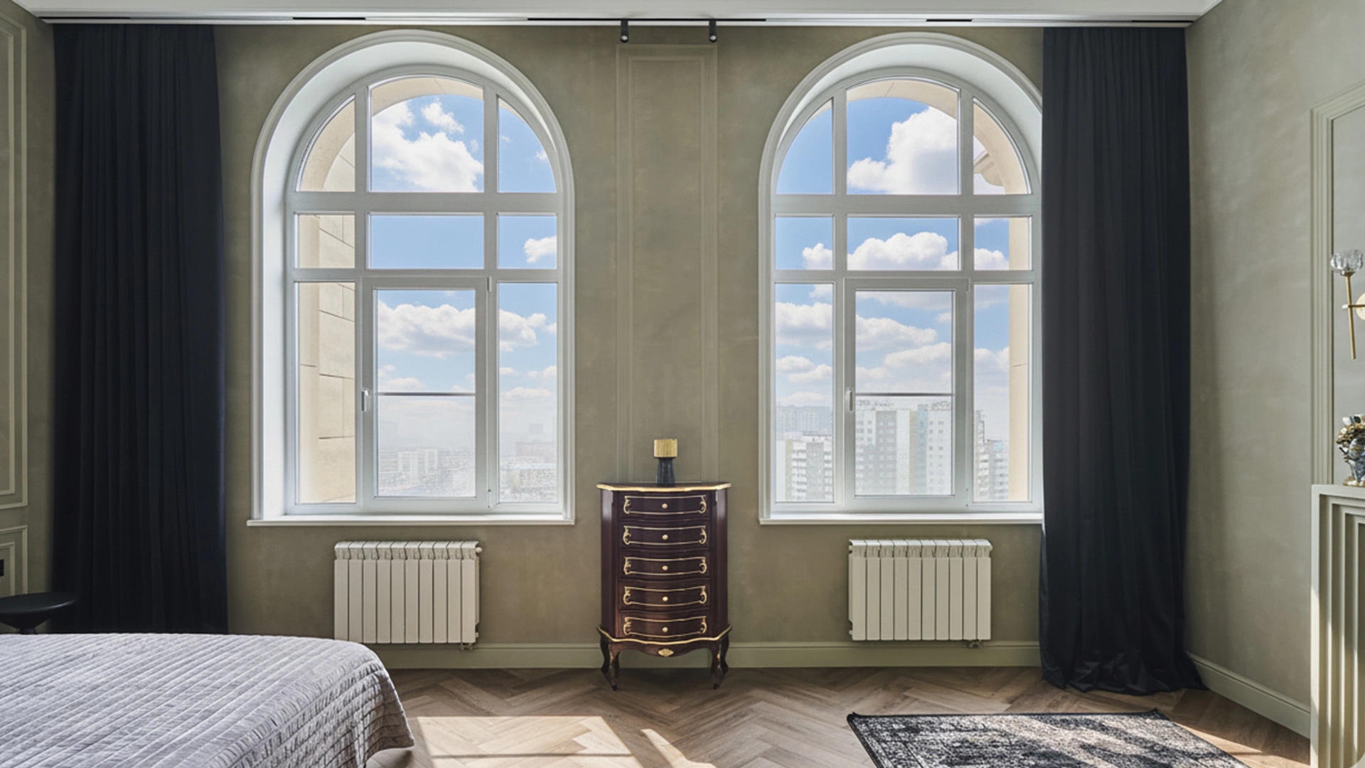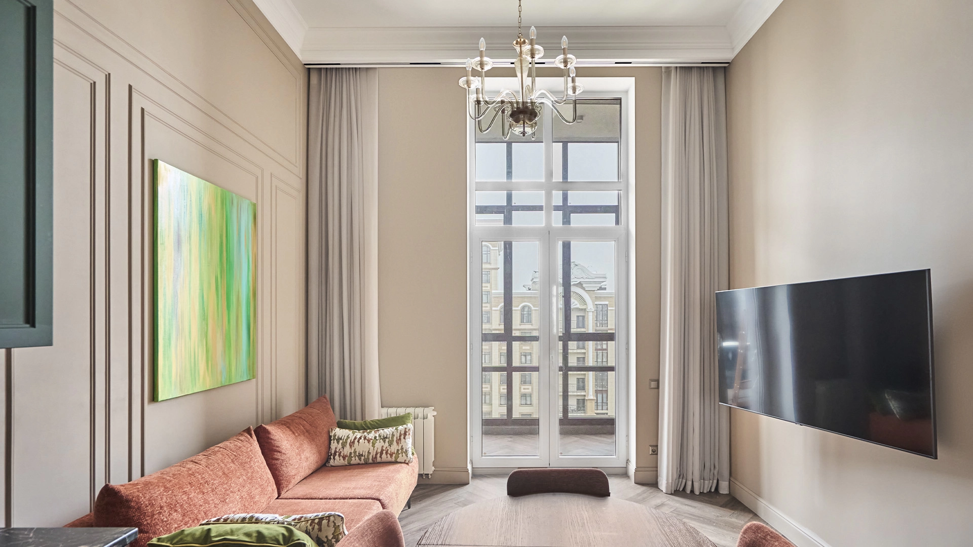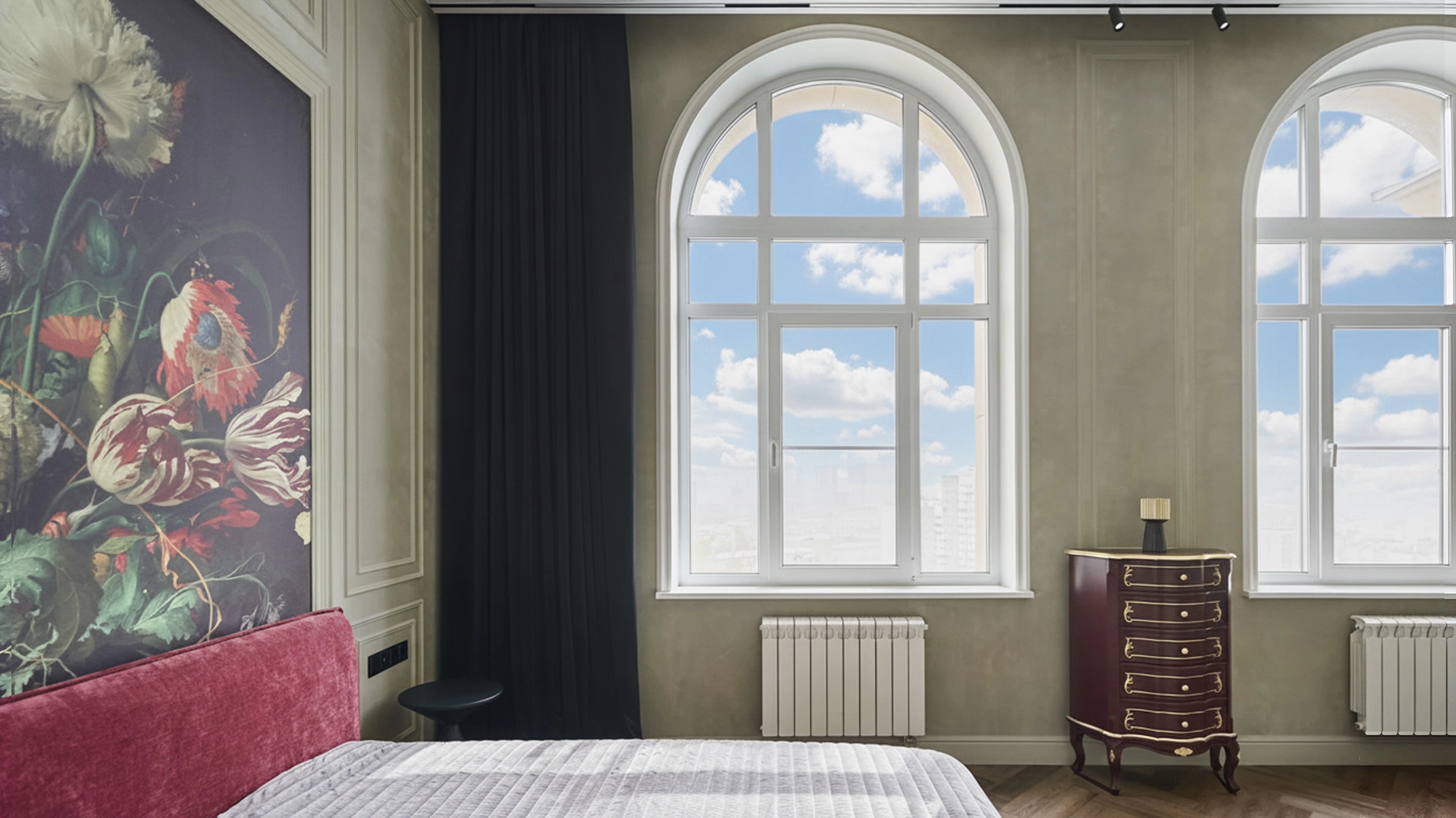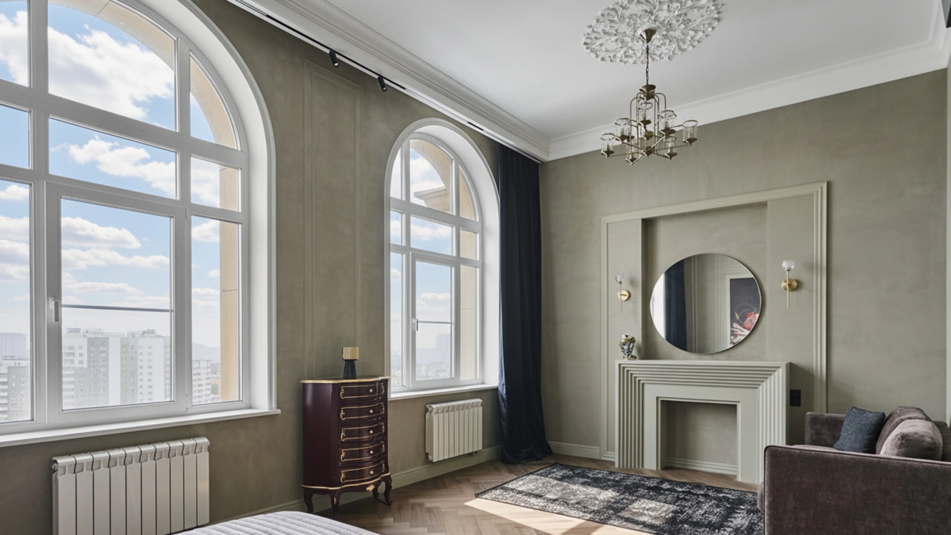 View apartment with 1 bedroom with total area of 71 m² in the complex "Dynasty". Designer renovation in the style of modern classics. The apartment has a lot of natural light due to large windows and 4 meters high ceilings. Layout: living room-dining room-kitchen, spacious bedroom with two arched windows, hall, bathroom with shower, dressing room, loggia with panoramic glazing. The apartment is fully equipped with furniture and modern appliances. The windows overlook the city and the landscaped courtyard. There is a parking place in the underground parking.