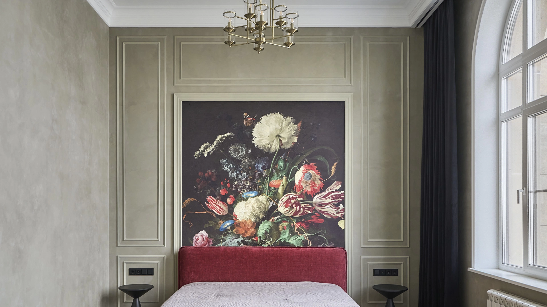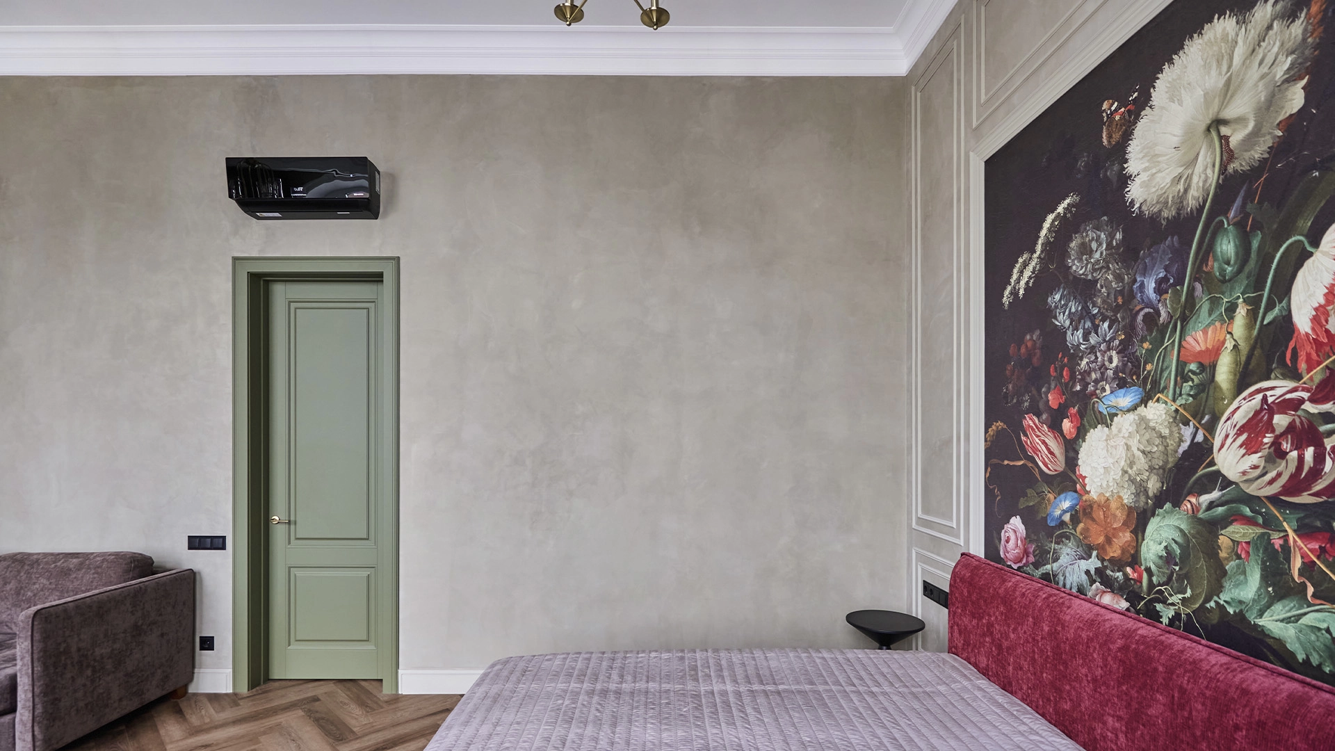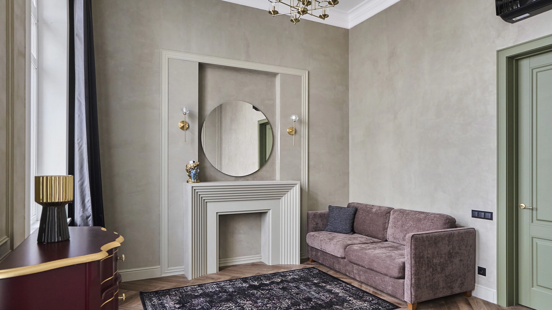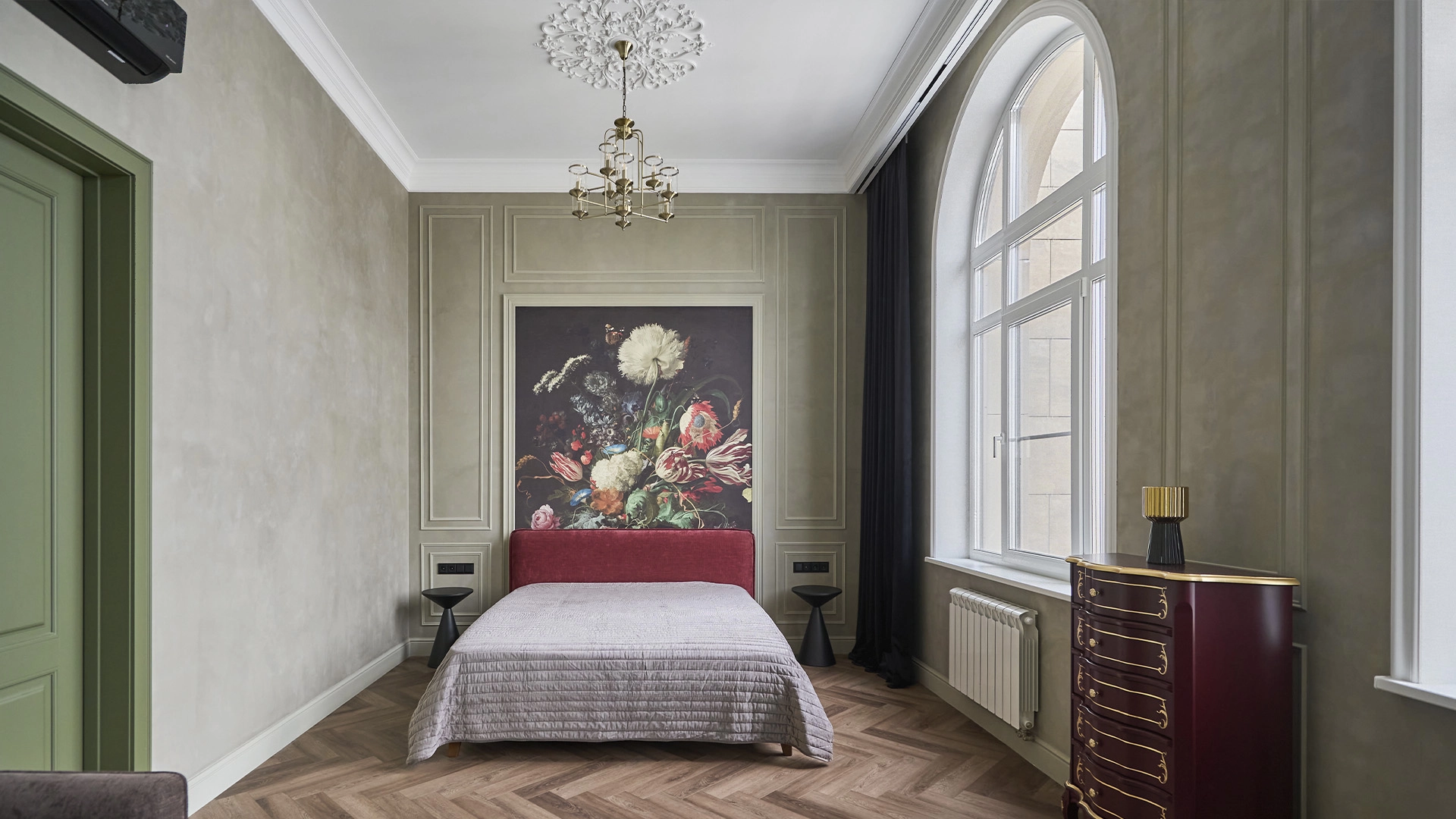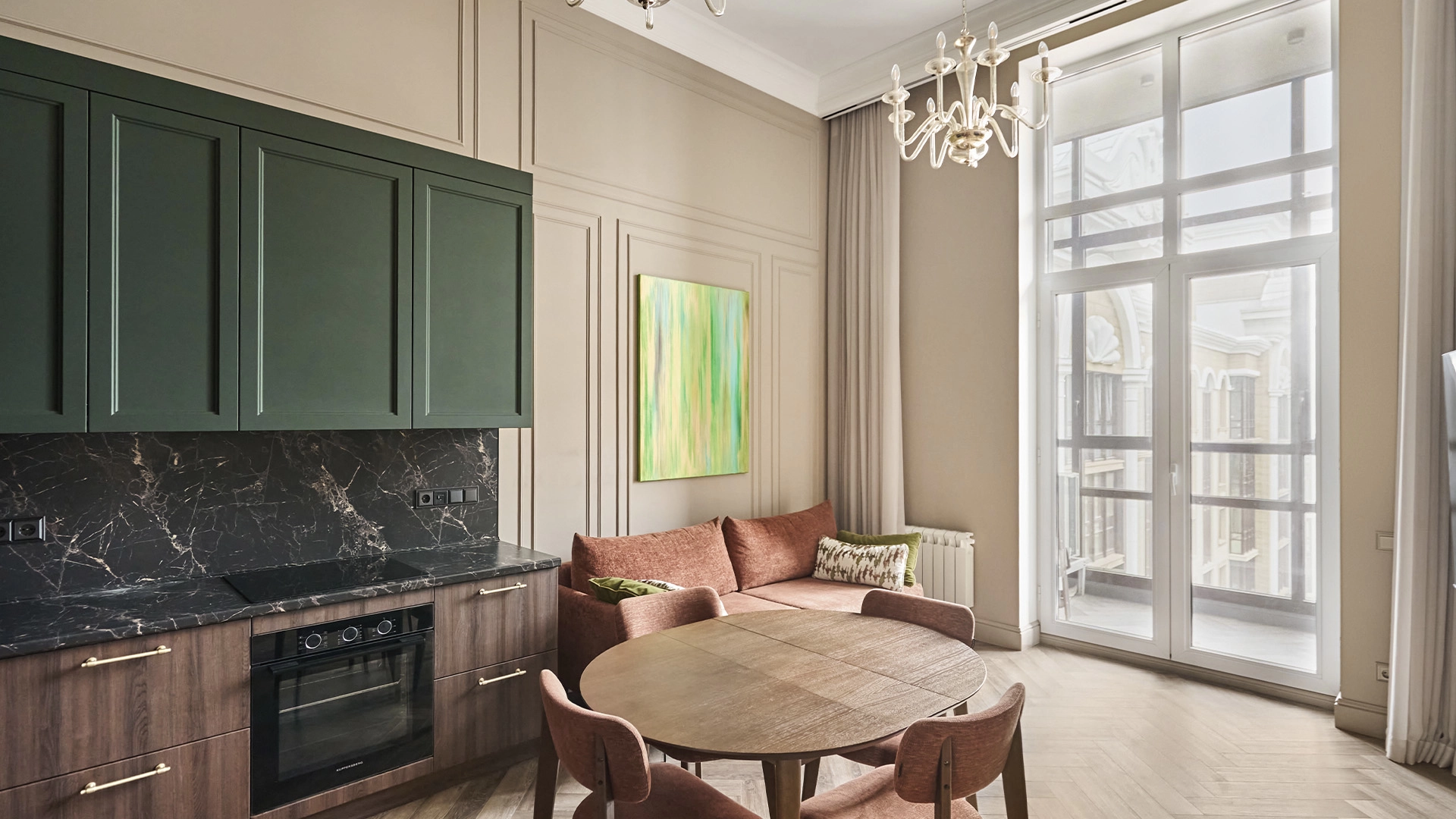 View apartment with 1 bedroom with total area of 71 m² in the complex "Dynasty". Designer renovation in the style of modern classics. The apartment has a lot of natural light due to large windows and 4 meters high ceilings. Layout: living room-dining room-kitchen, spacious bedroom with two arched windows, hall, bathroom with shower, dressing room, loggia with panoramic glazing. The apartment is fully equipped with furniture and modern appliances. The windows overlook the city and the landscaped courtyard. There is a parking place in the underground parking.