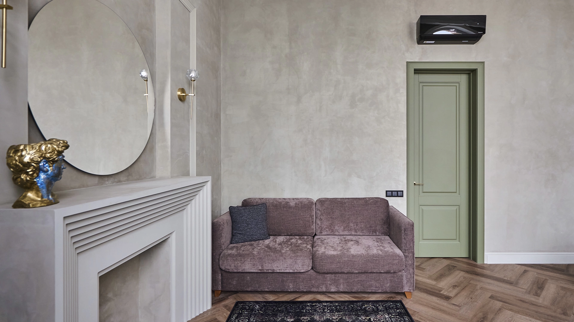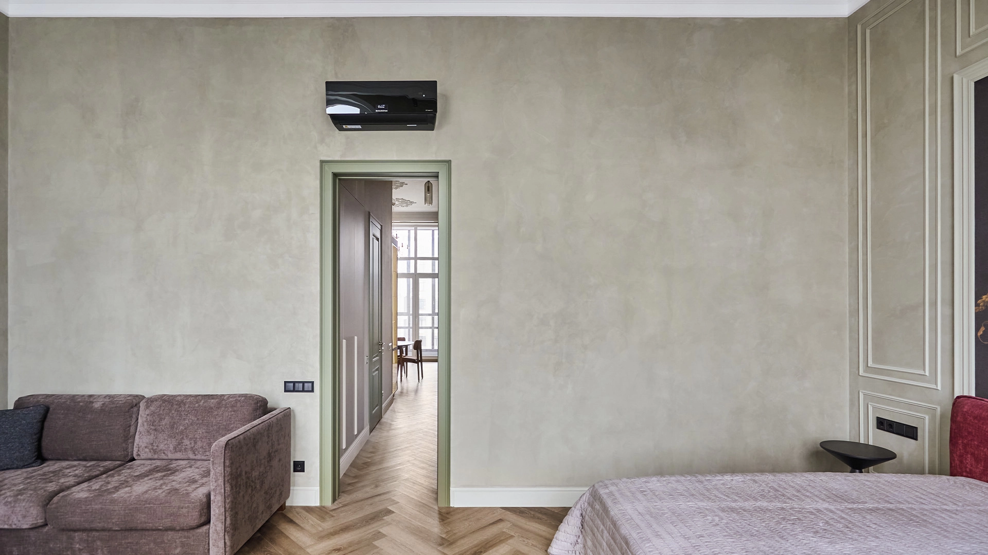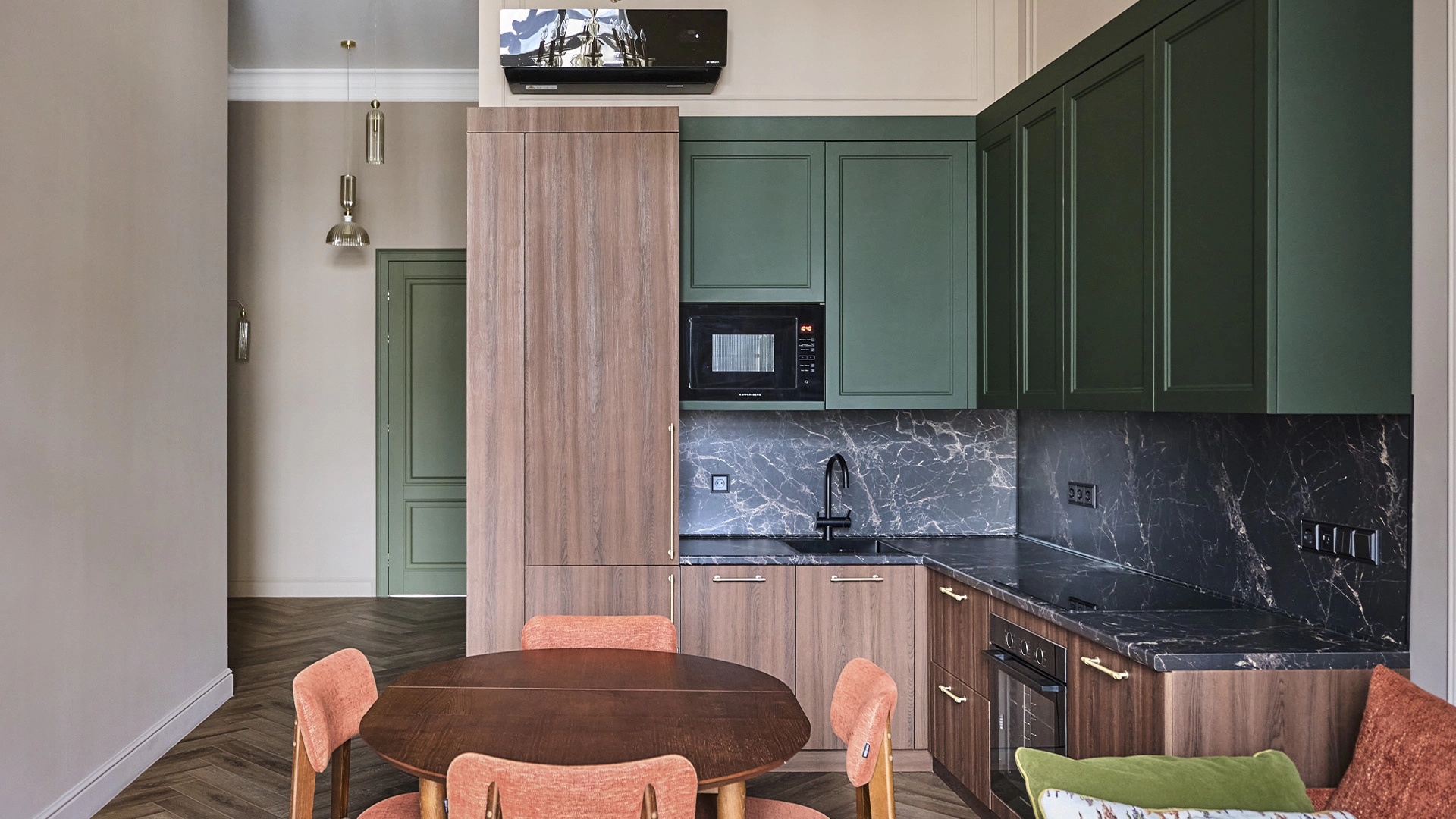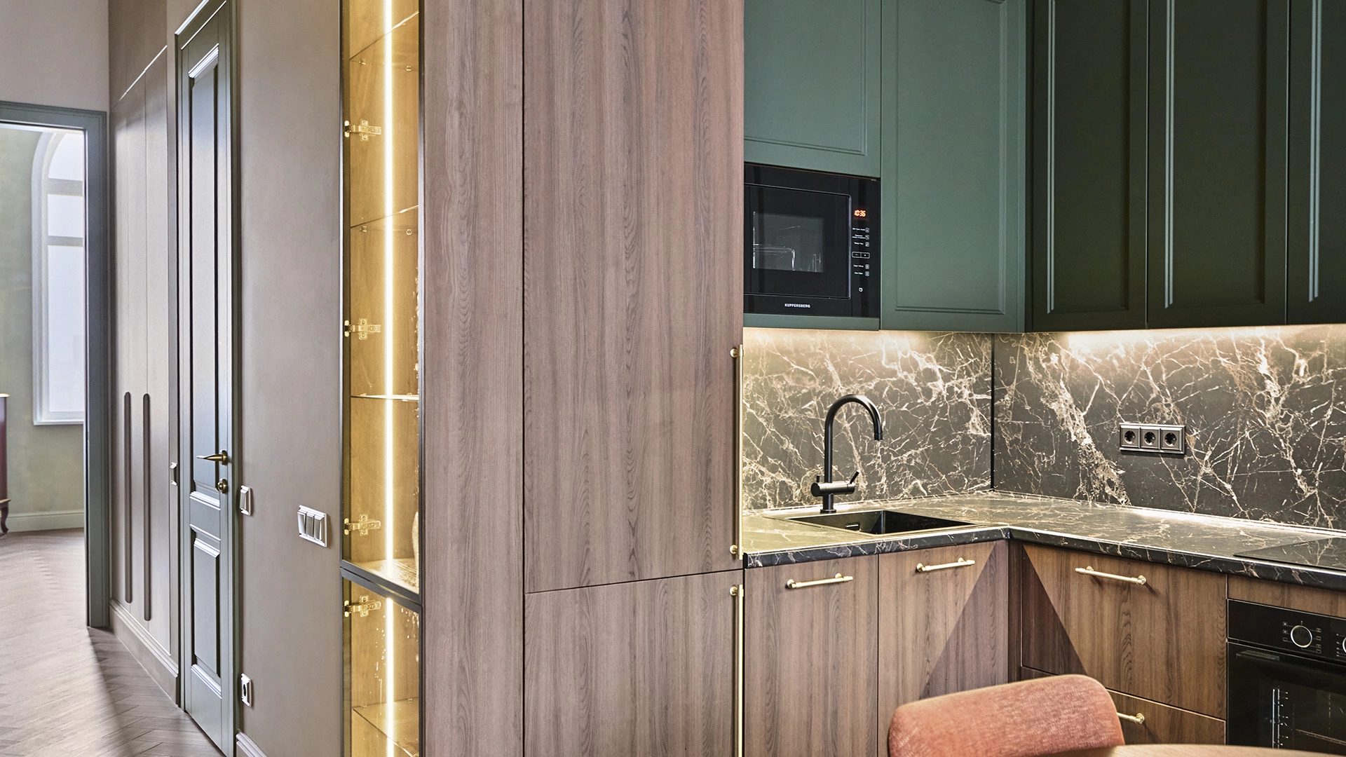 View apartment with 1 bedroom with total area of 71 m² in the complex "Dynasty". Designer renovation in the style of modern classics. The apartment has a lot of natural light due to large windows and 4 meters high ceilings. Layout: living room-dining room-kitchen, spacious bedroom with two arched windows, hall, bathroom with shower, dressing room, loggia with panoramic glazing. The apartment is fully equipped with furniture and modern appliances. The windows overlook the city and the landscaped courtyard. There is a parking place in the underground parking.