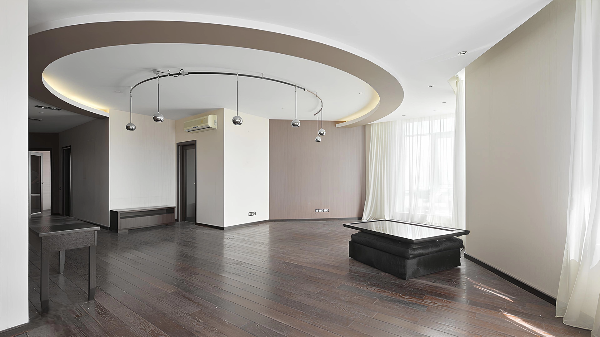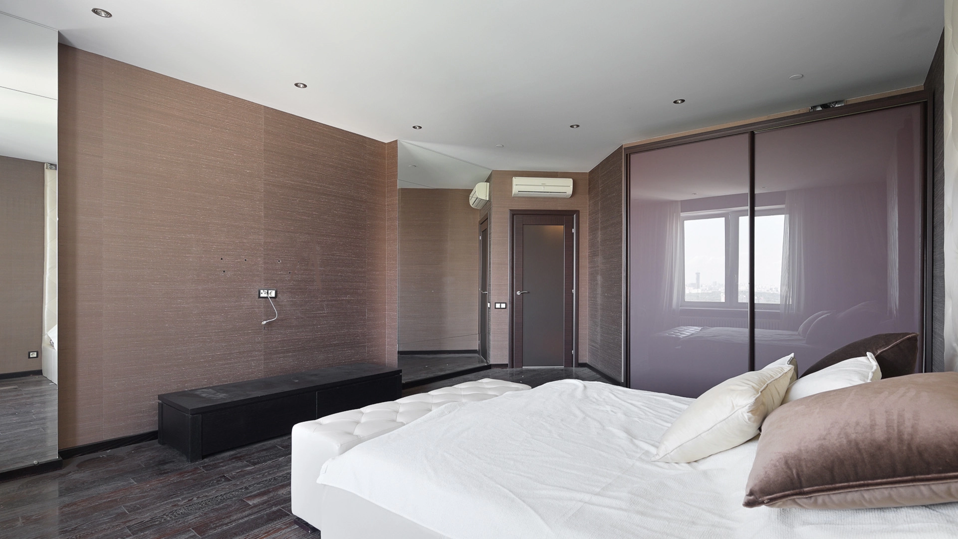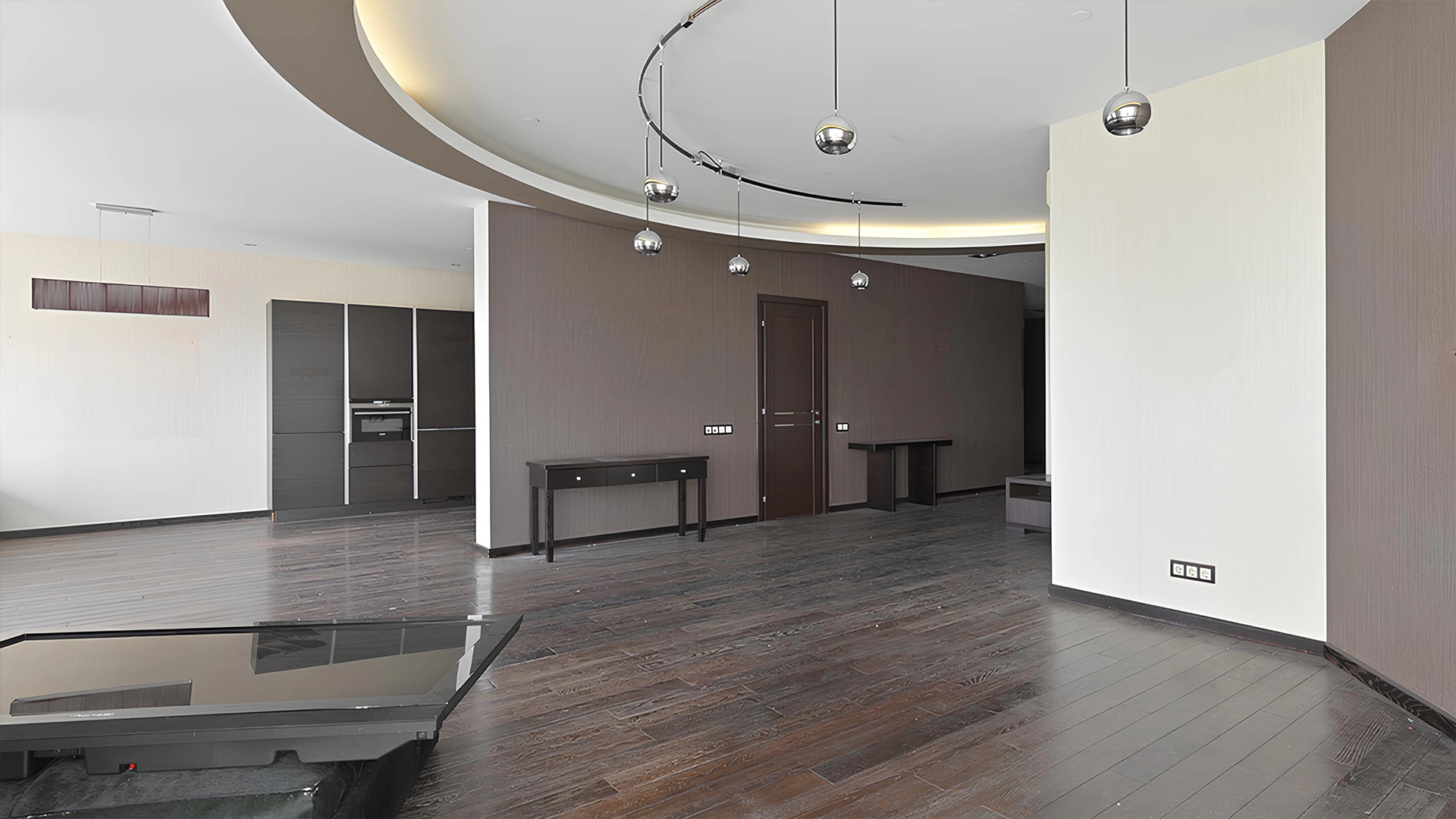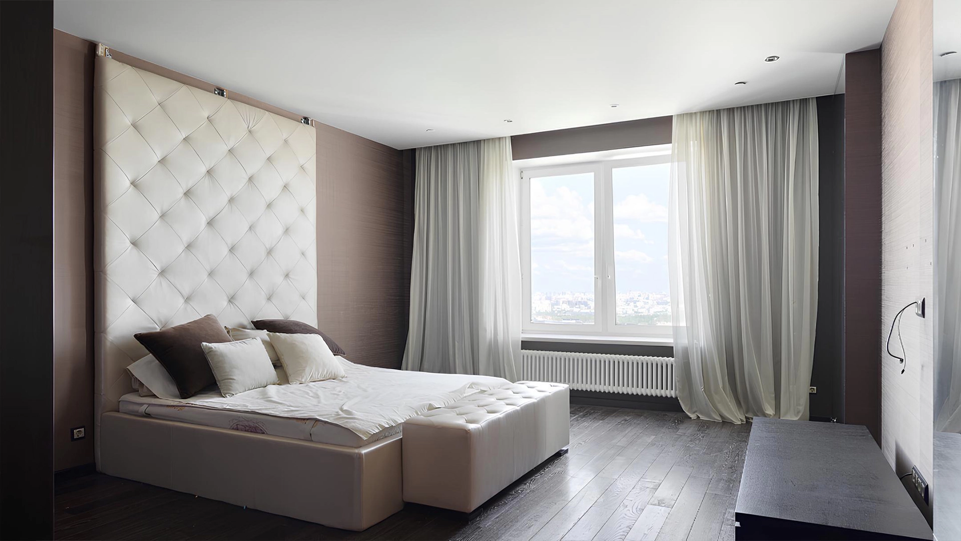 View apartment with 3 bedrooms in the premium class complex "Vorobyovy Gory". The apartment with an area of 188 m² is located on the 29th floor in the building 3. The renovation is done in shades of brown, pinkish and beige colors: modern parquet under dark wood is laid on the floor. Dark cabinets and interior doors look harmoniously against the background of light-colored walls. Air conditioners are installed in the living room and 2 bedrooms. Layout: spacious living room with kitchen area, 3 bedrooms, 2 bathrooms, dressing room, hall. Picturesque views of Moscow State University, lush park and the towers of the business center "Moscow City".
