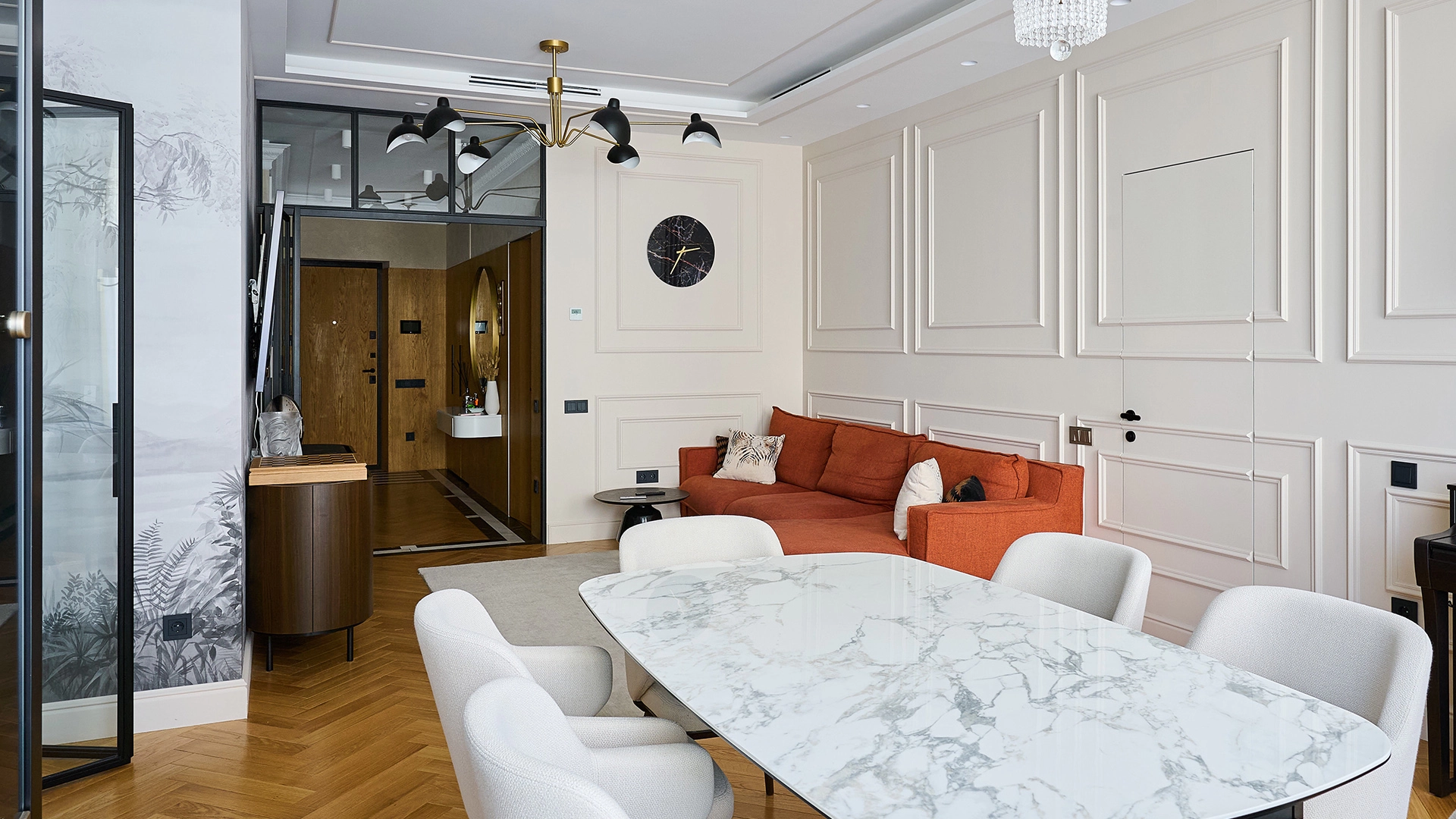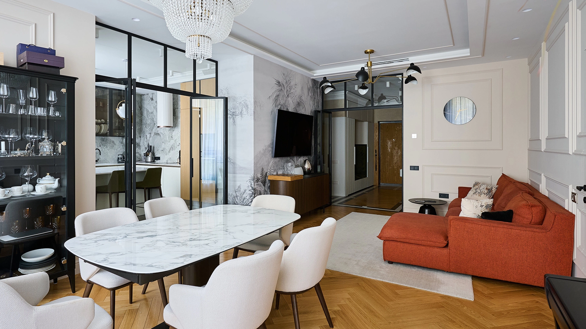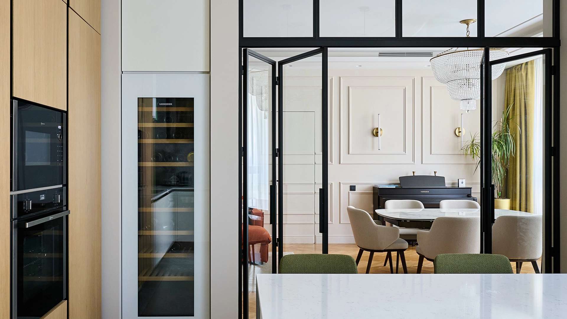 Spacious three-bedroom apartment with total area of 156 m² in the complex of premium class club houses Barrin House in Khamovniki. Bright modern interior, high ceilings, panoramic floor-to-ceiling windows. There is a living room with dining area, a kitchen with an island and a wine cabinet, a master bedroom with a large dressing room, an ironing room, a bathroom with a bathtub, a shower and two sinks. Second bedroom with three windows, office or additional bedroom, bathroom, laundry room, storage room, hall.