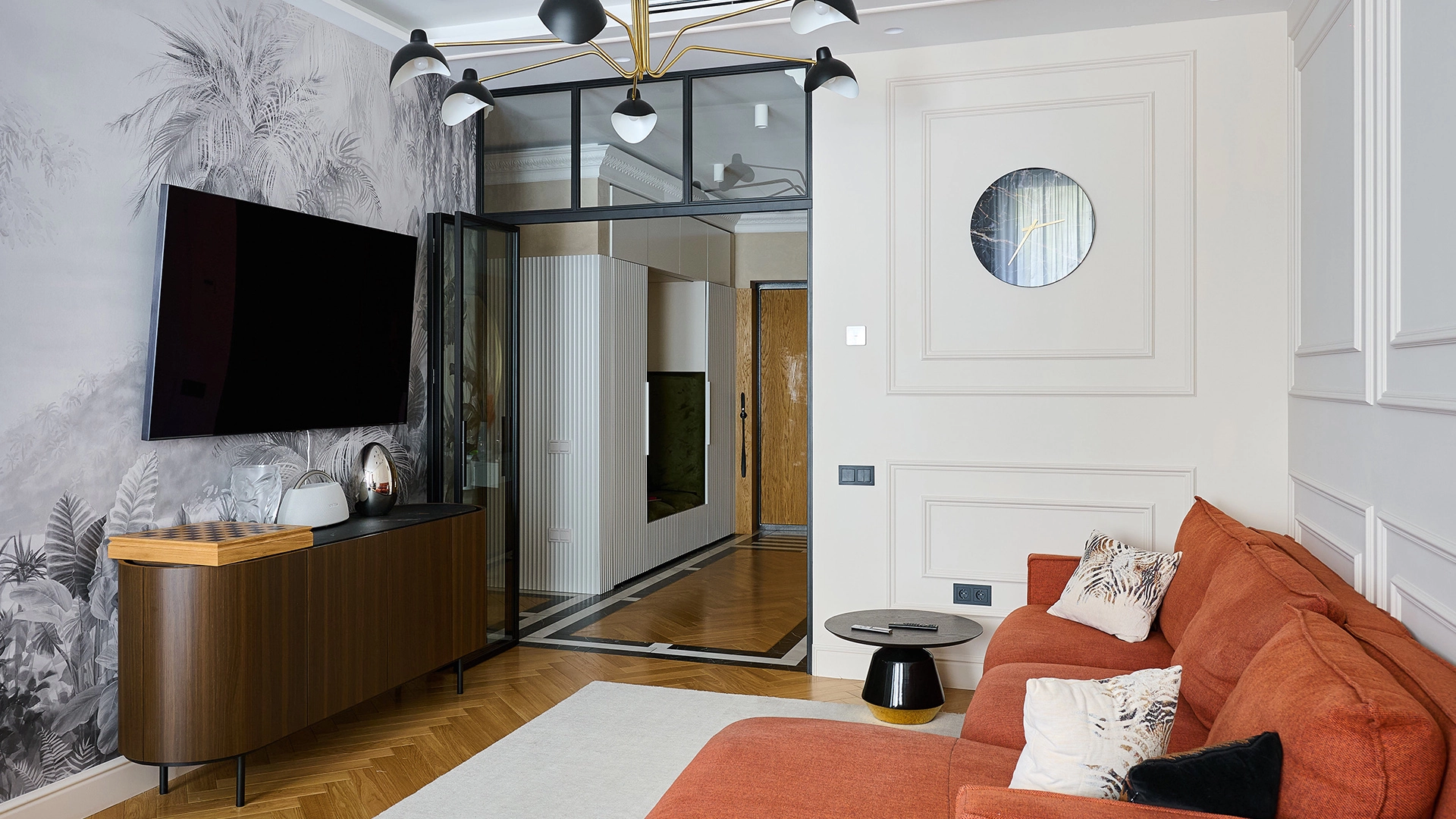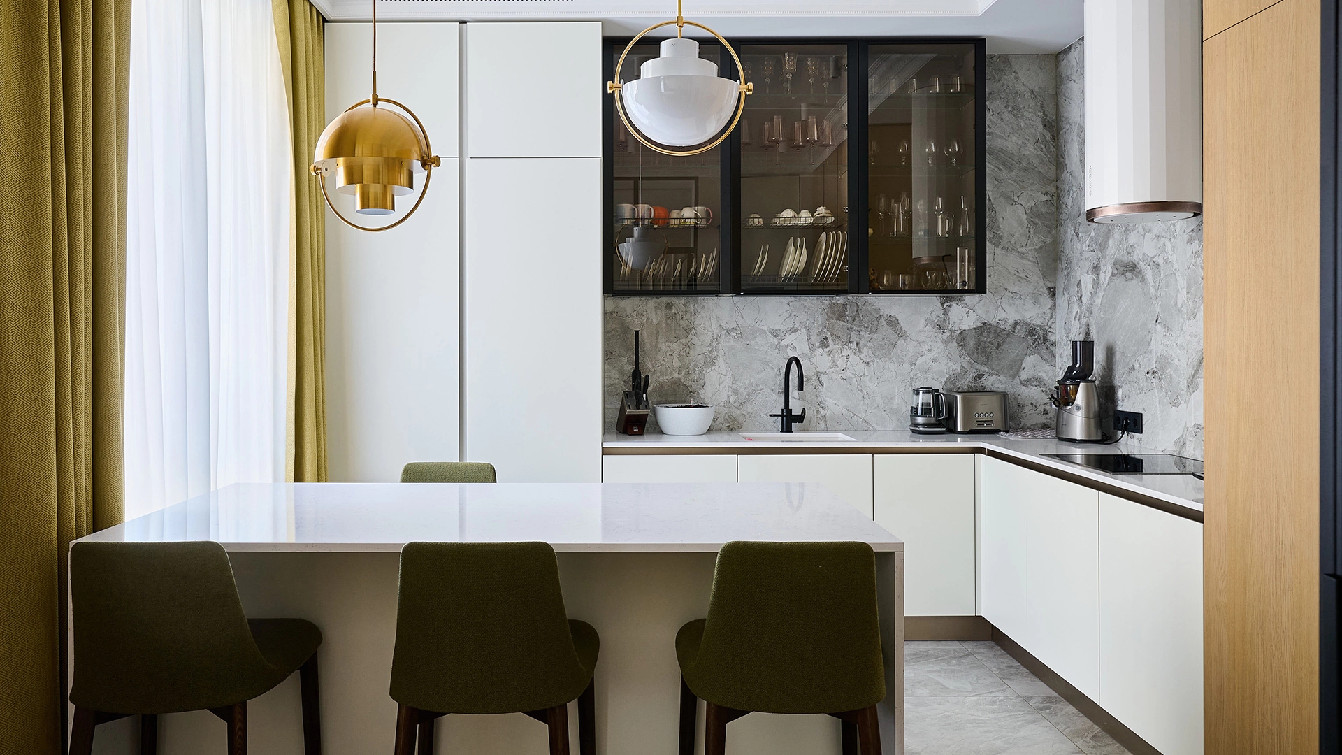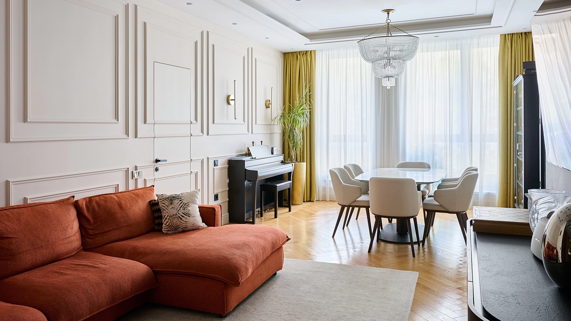 Spacious three-bedroom apartment with total area of 156 m² in the complex of premium class club houses Barrin House in Khamovniki. Bright modern interior, high ceilings, panoramic floor-to-ceiling windows. There is a living room with dining area, a kitchen with an island and a wine cabinet, a master bedroom with a large dressing room, an ironing room, a bathroom with a bathtub, a shower and two sinks. Second bedroom with three windows, office or additional bedroom, bathroom, laundry room, storage room, hall.