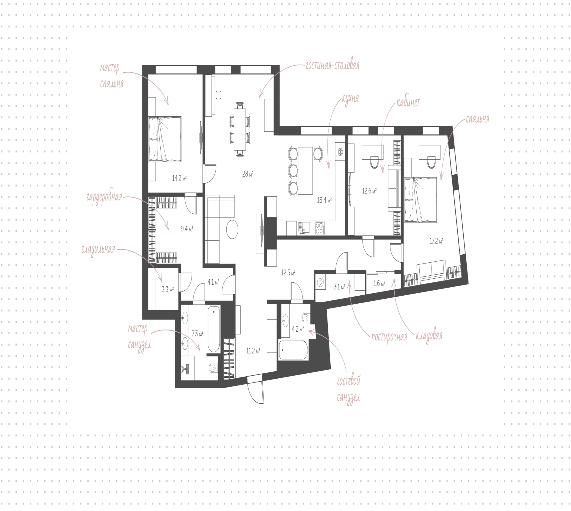 Apartment c 3 спальнями, 156 м² в ЖК Barrin House, 3 этаж