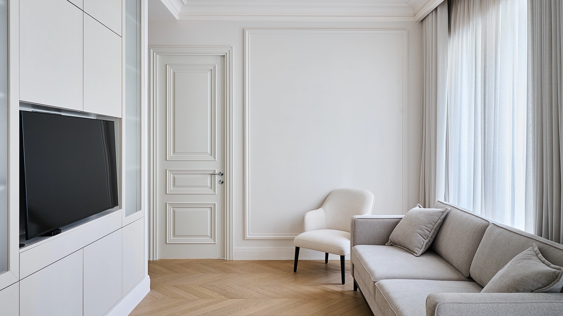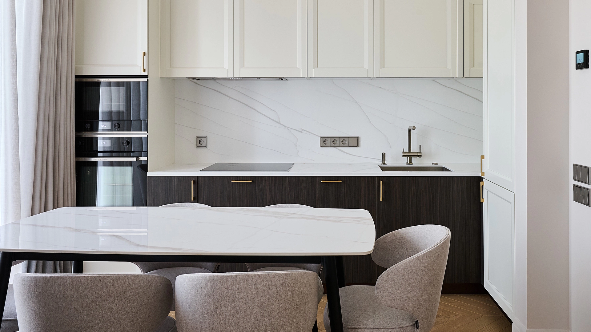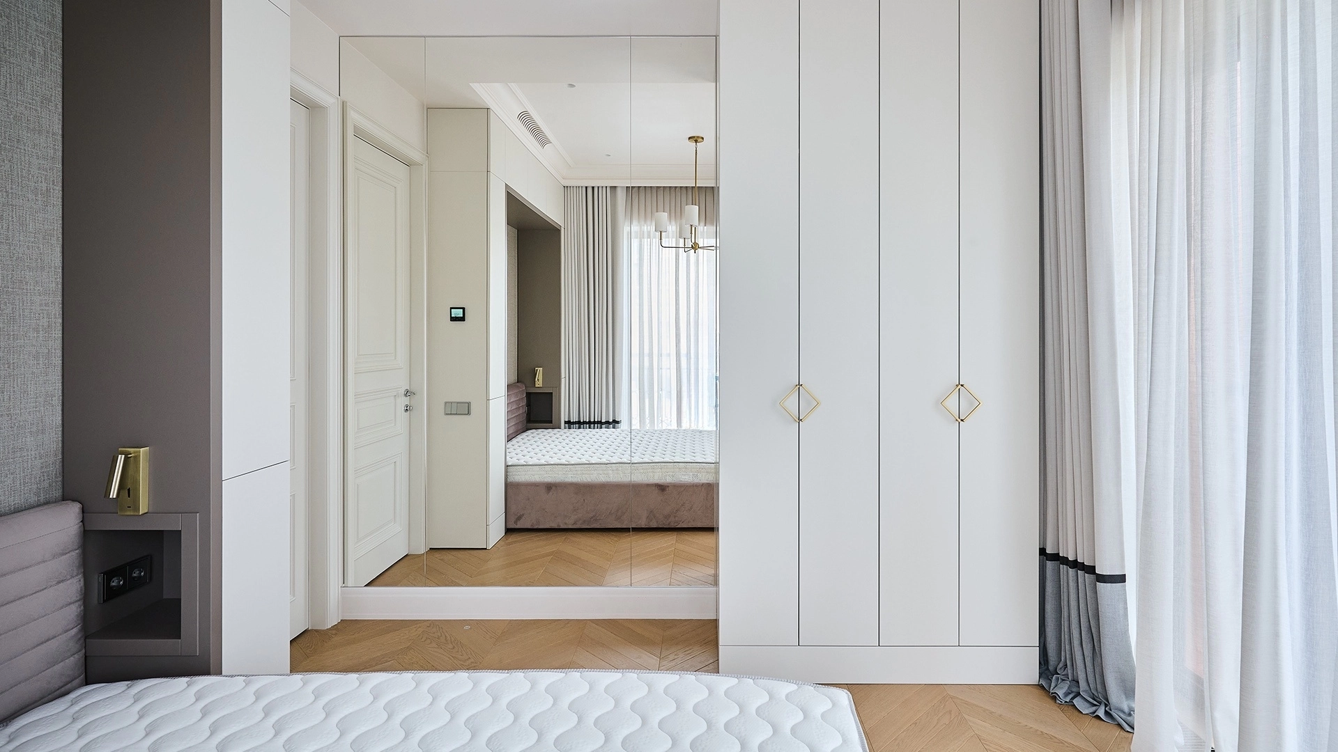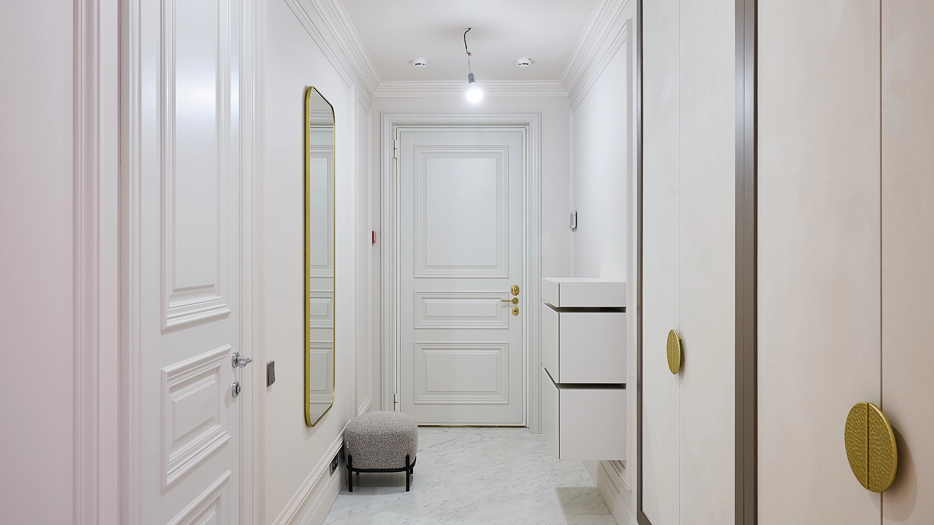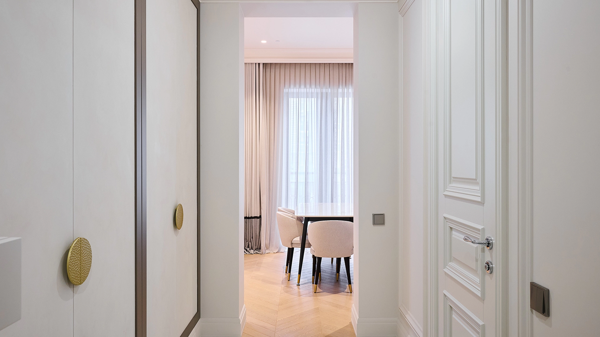 Two-bedroom apartments with total area of 63 m² in the complex of club houses "Dolgorukovskaya, 25". The corner apartment is located on the third floor in the building 2. The bright interior is decorated in the style of modern classics. High ceilings, panoramic floor-to-ceiling windows, lots of natural light. Layout: spacious kitchen-living room, two bedrooms, two bathrooms, dressing room, hall. The windows overlook two sides, a private courtyard and the street.