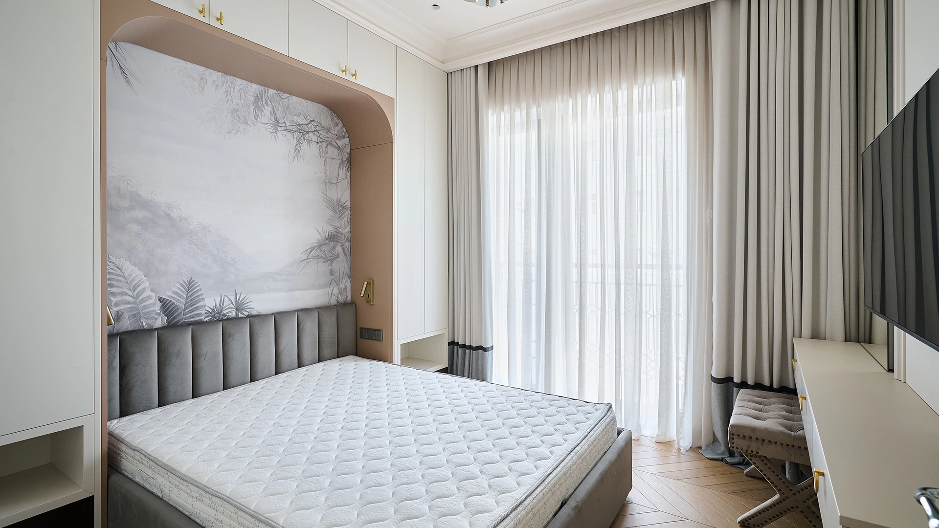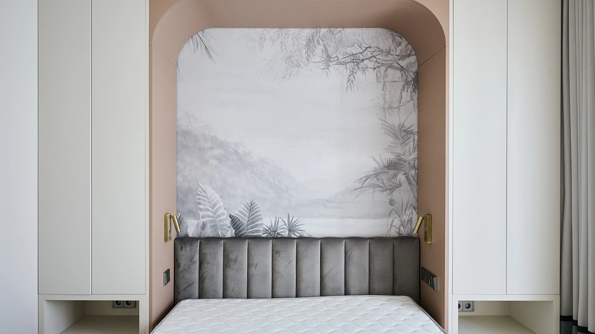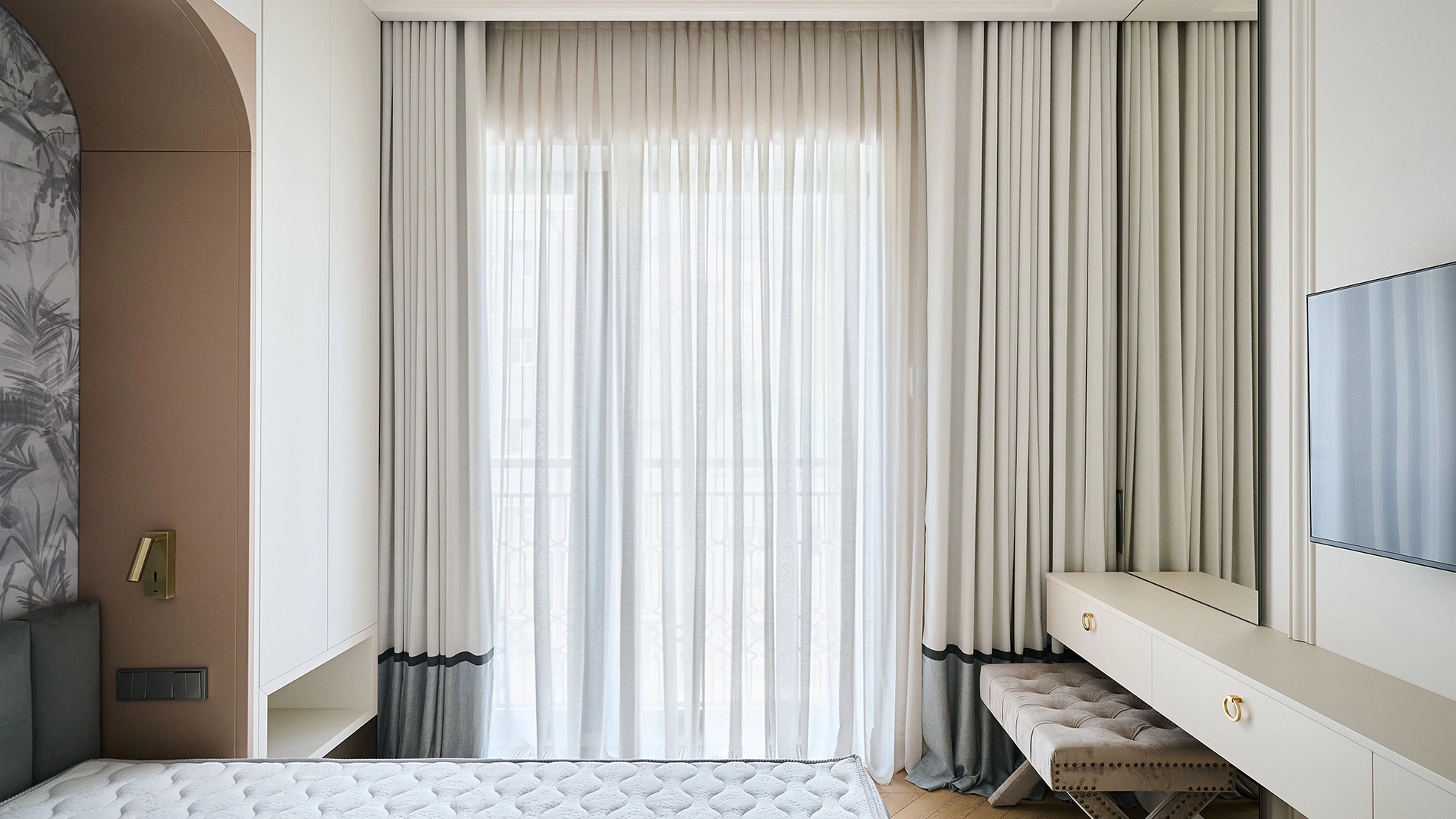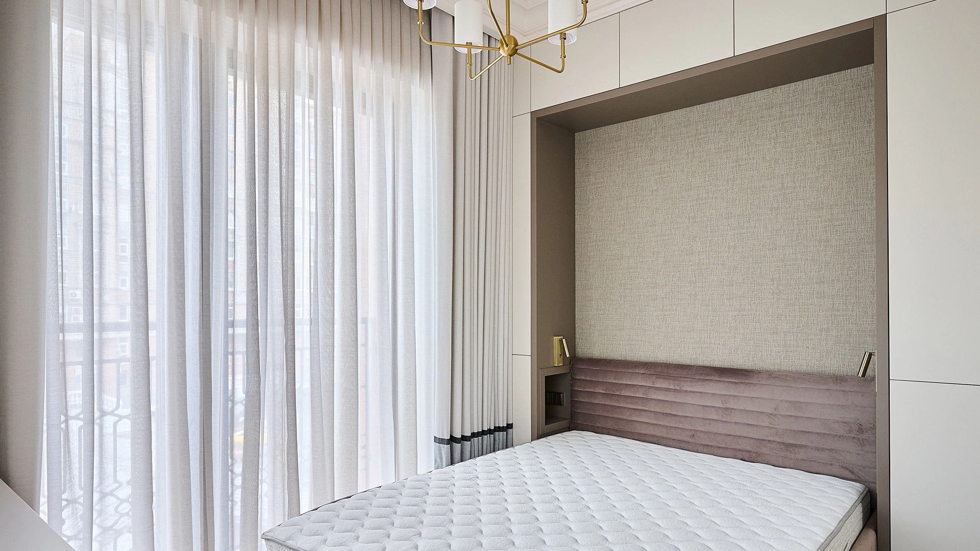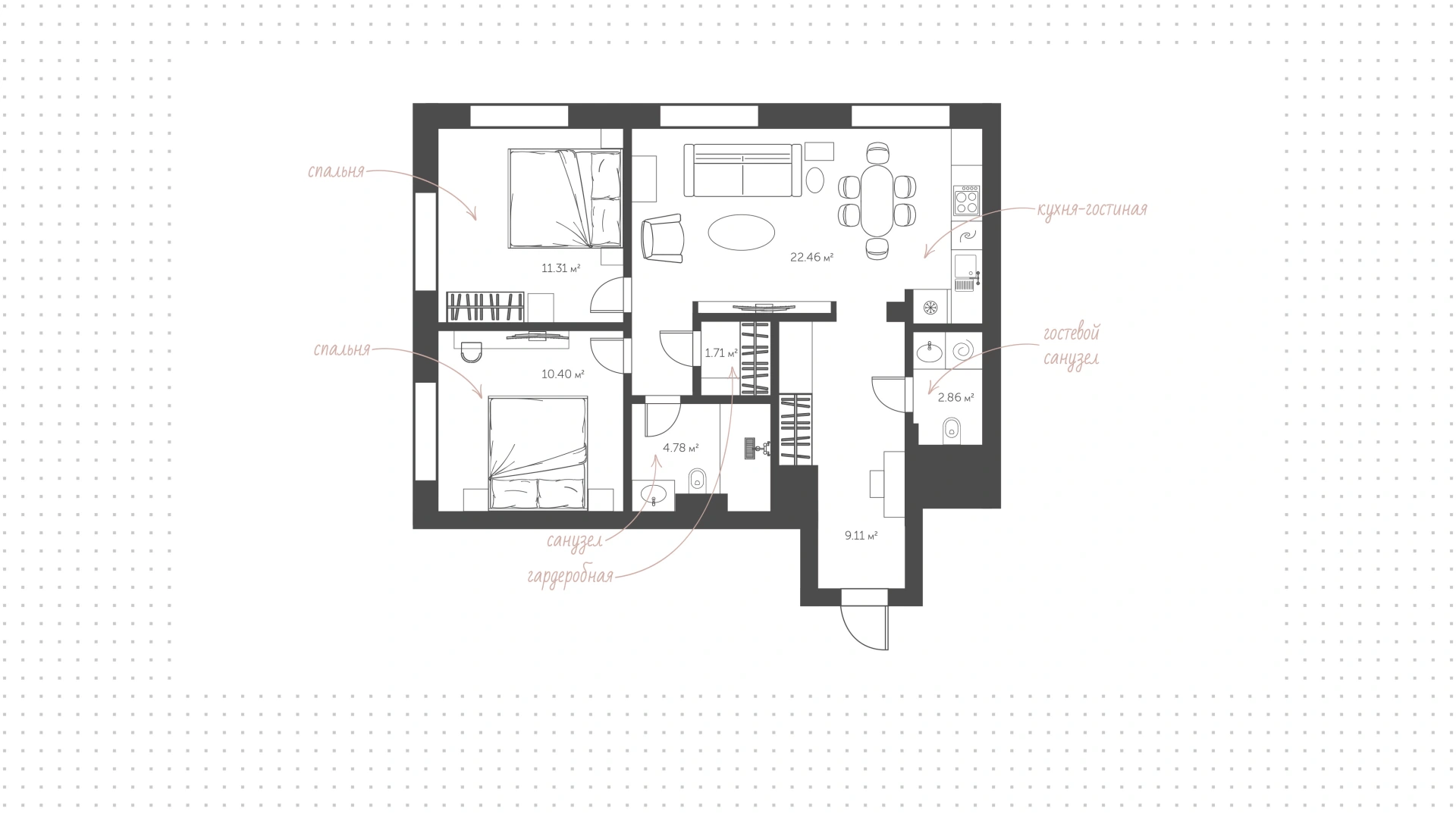 Two-bedroom apartments with total area of 63 m² in the complex of club houses "Dolgorukovskaya, 25". The corner apartment is located on the third floor in the building 2. The bright interior is decorated in the style of modern classics. High ceilings, panoramic floor-to-ceiling windows, lots of natural light. Layout: spacious kitchen-living room, two bedrooms, two bathrooms, dressing room, hall. The windows overlook two sides, a private courtyard and the street.
