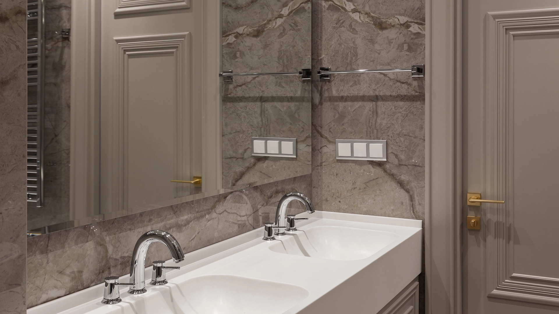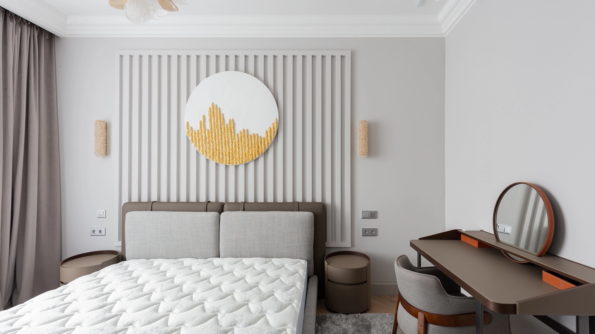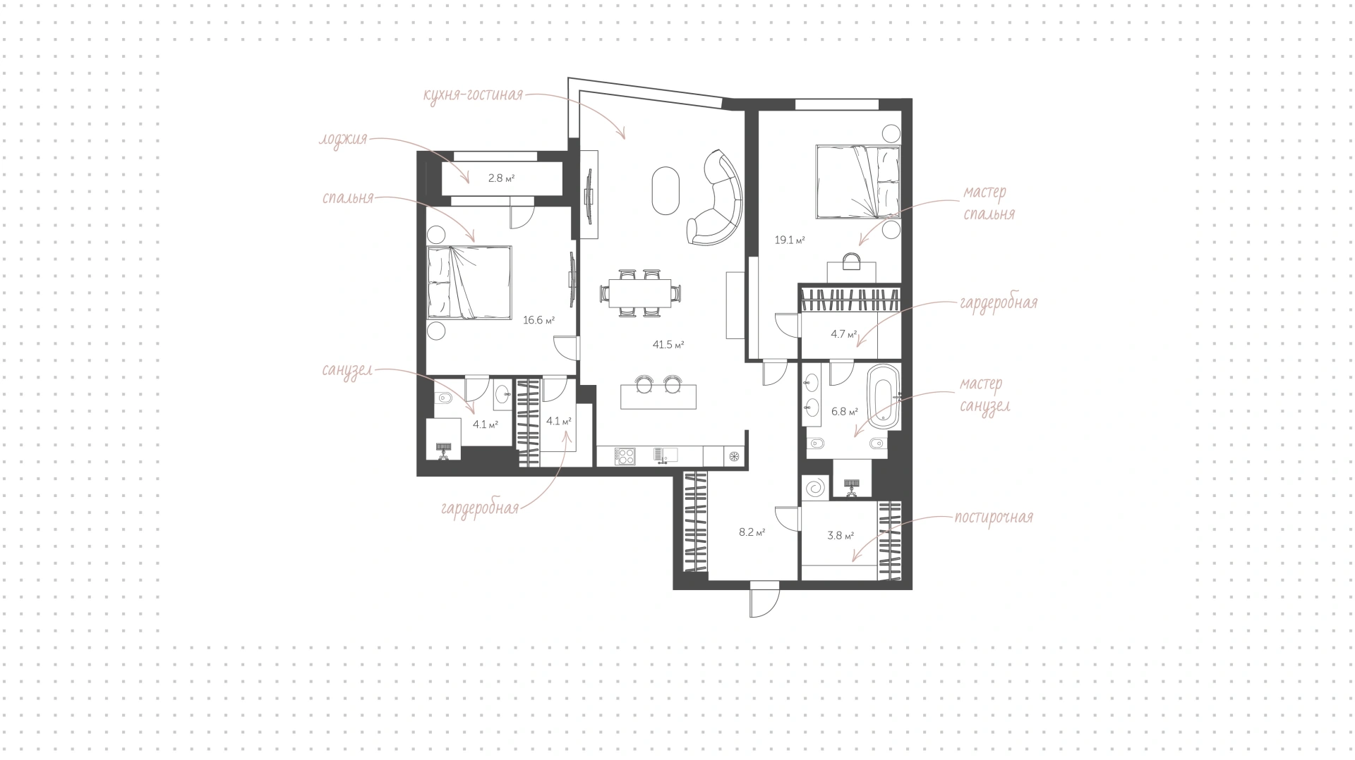 Functional layout includes a spacious kitchen-living room with dining area, master bedroom with its own bathroom and dressing room, second bedroom with its own bathroom, dressing room and access to the loggia, laundry room and hall. Thanks to panoramic glazing, the space is filled with natural light and warmth, with views of the city and Moscow City towers.