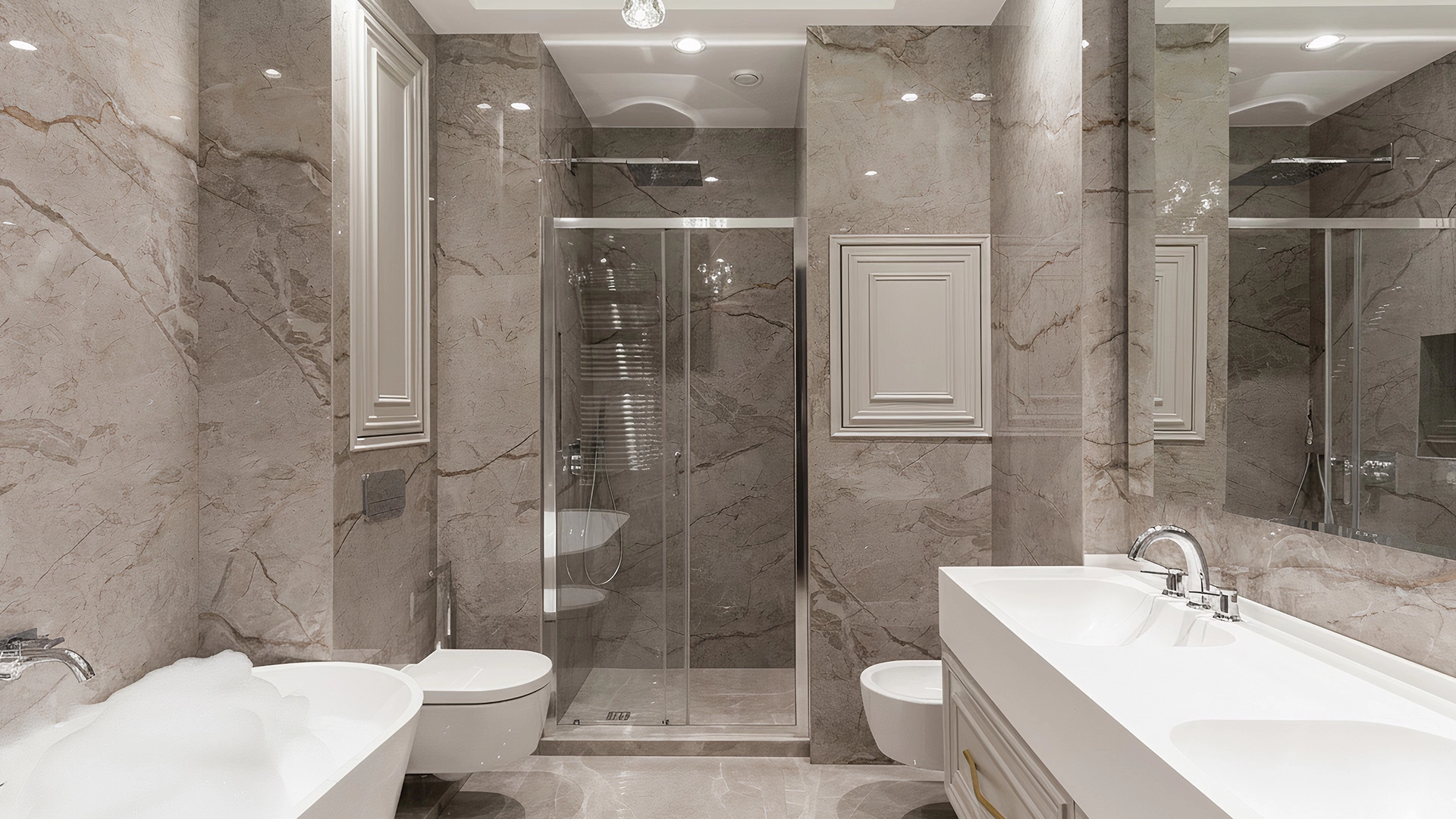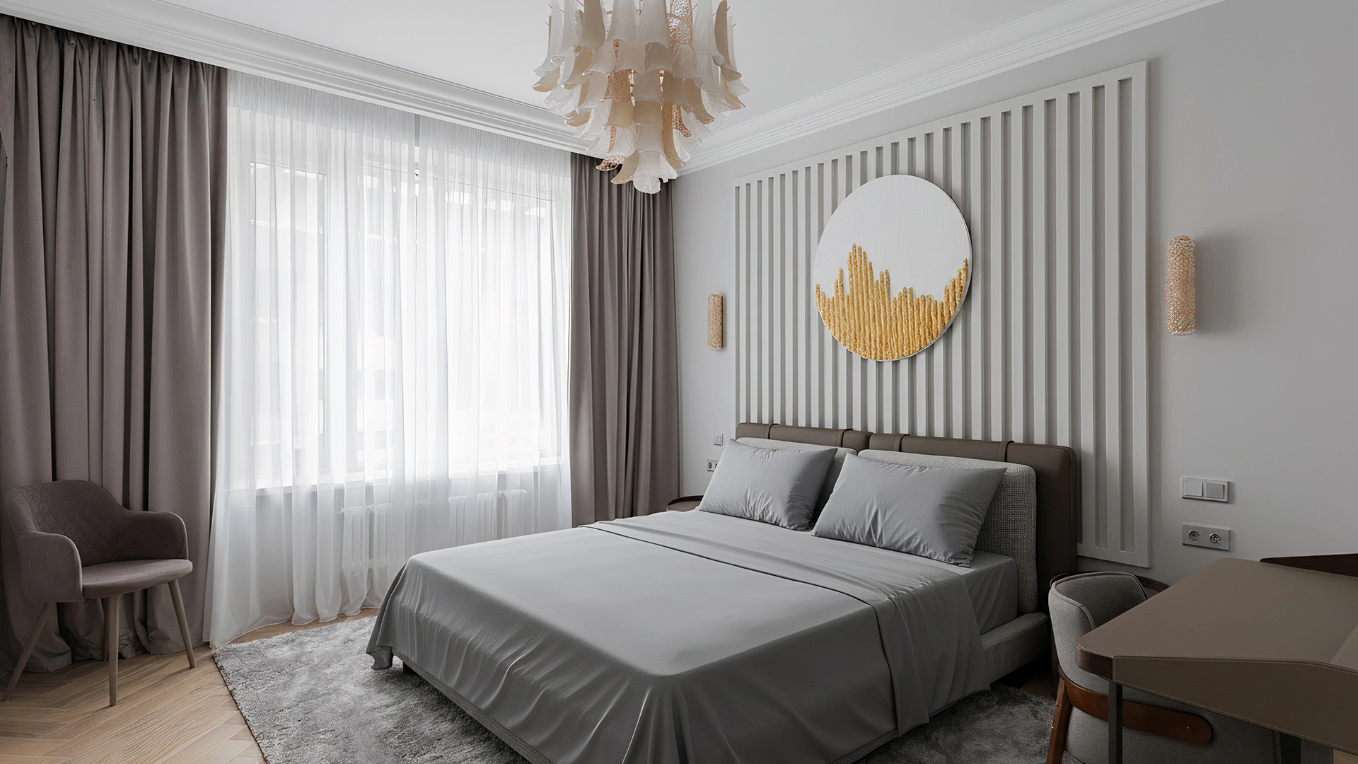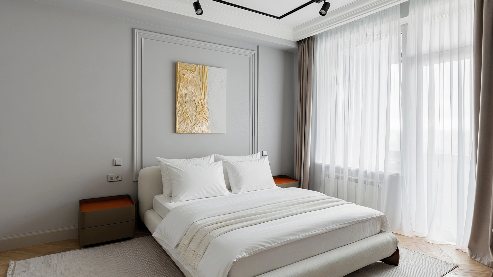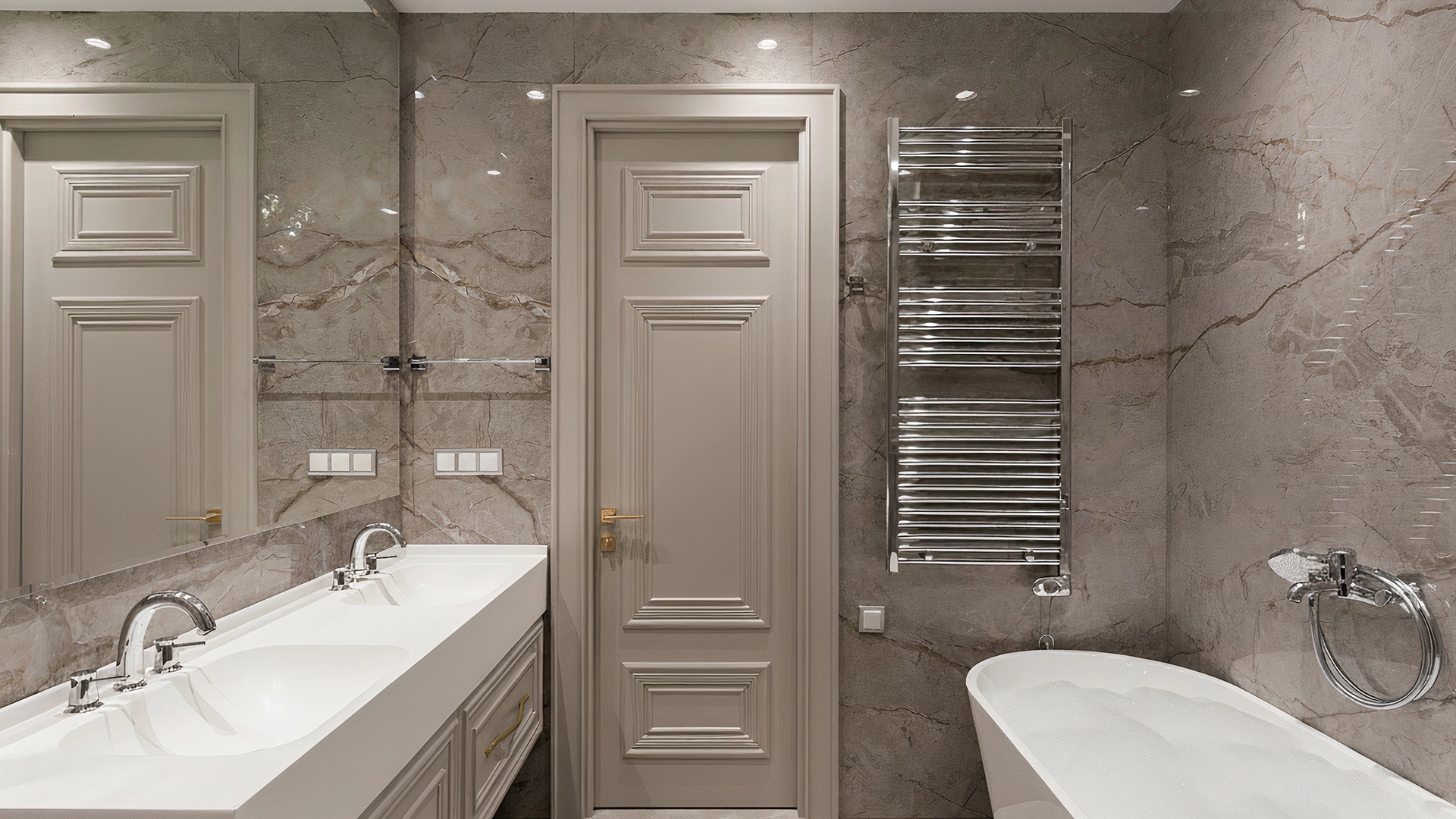 Functional layout includes a spacious kitchen-living room with dining area, master bedroom with its own bathroom and dressing room, second bedroom with its own bathroom, dressing room and access to the loggia, laundry room and hall. Thanks to panoramic glazing, the space is filled with natural light and warmth, with views of the city and Moscow City towers.