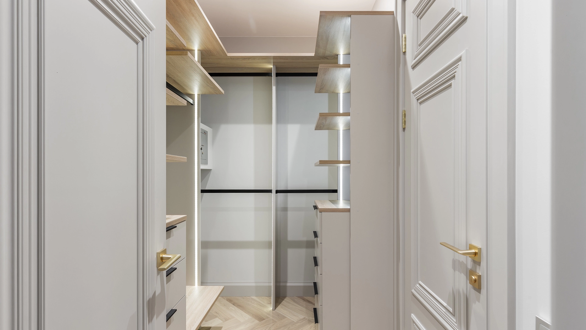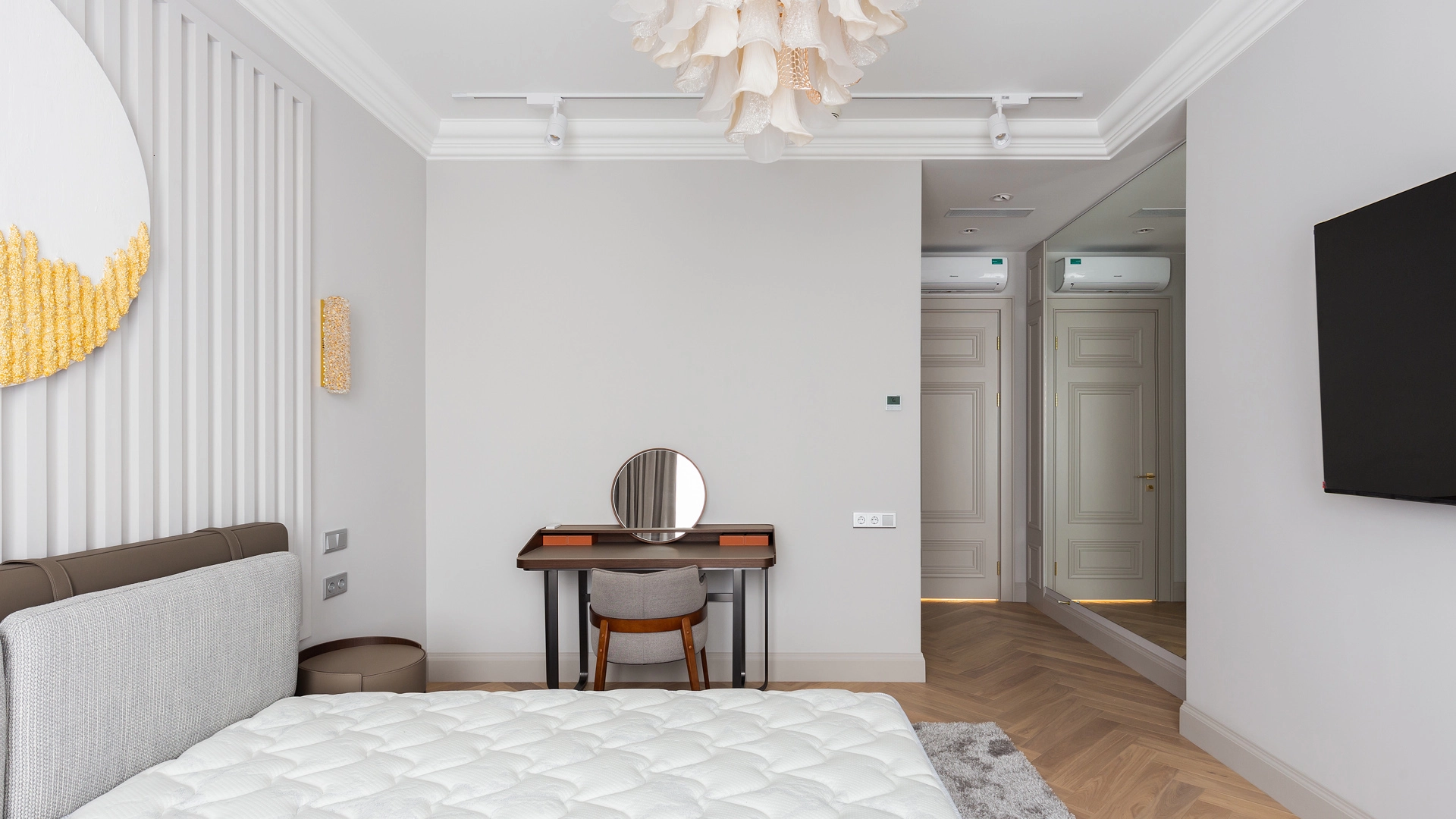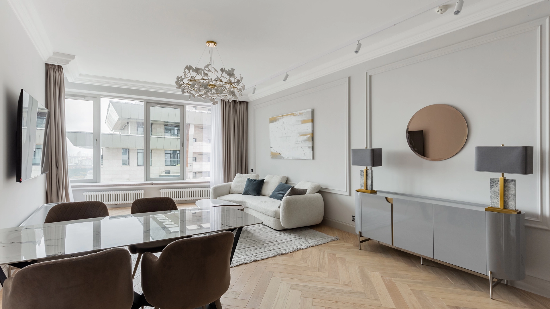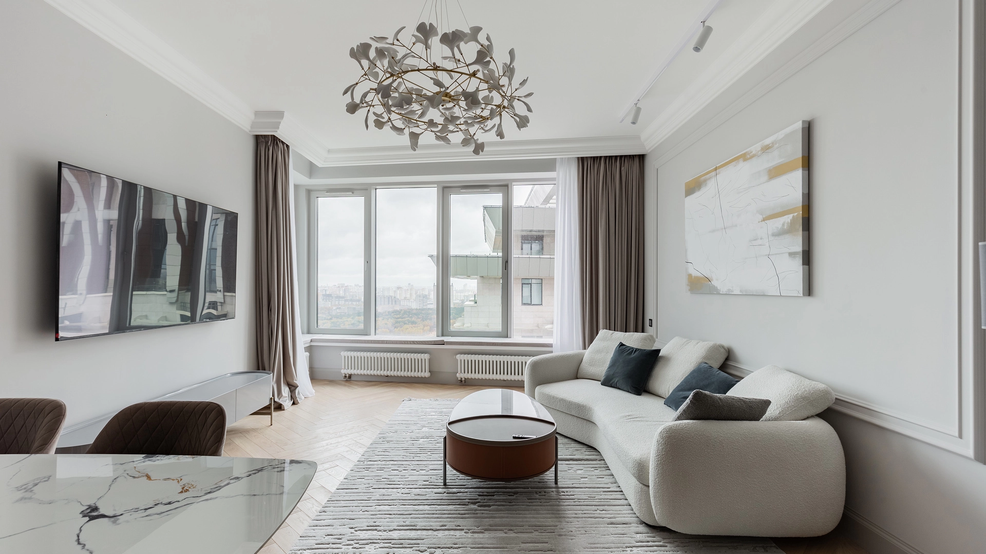 A two-bedroom apartment in the premium-class complex "Setun Valley". The apartment with total area of 112 m² is located on the 36th floor of the building B. The apartment is finished in neoclassical style according to the individual project. The interiors are decorated with decorative moldings, paintings and designer chandeliers. Different lighting scenarios are thought out, split-system is installed. The apartment is fully furnished, the kitchen is equipped with built-in appliances Miele.