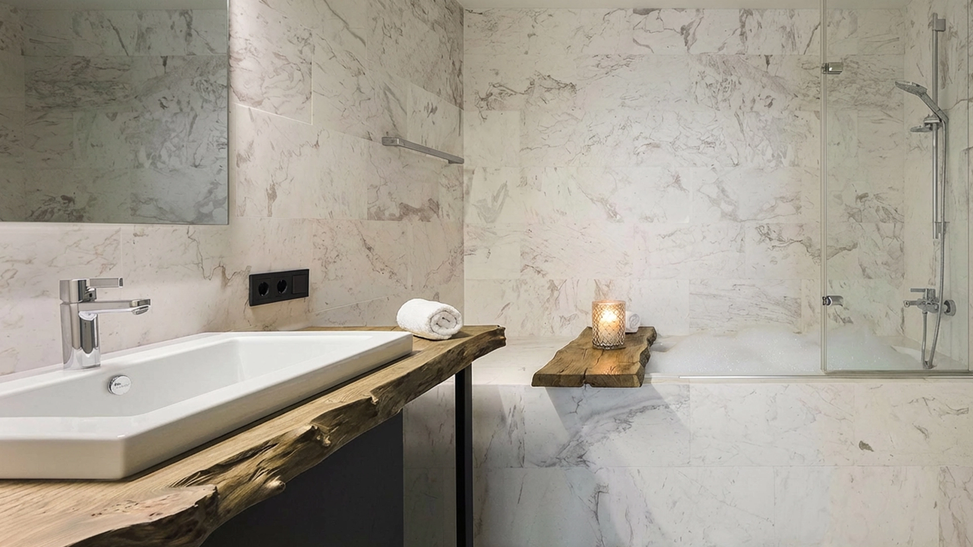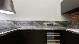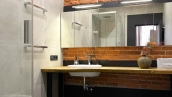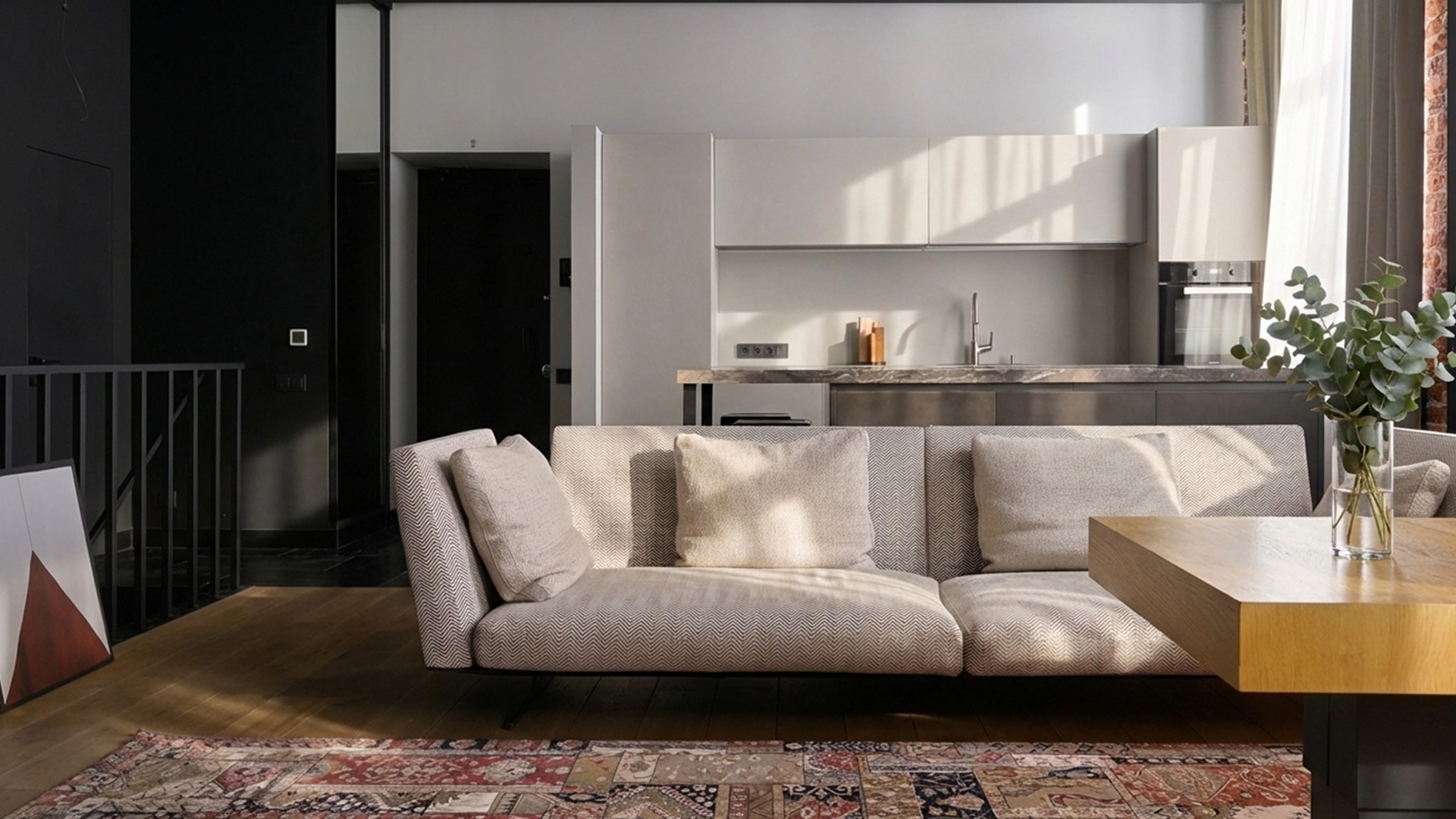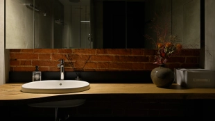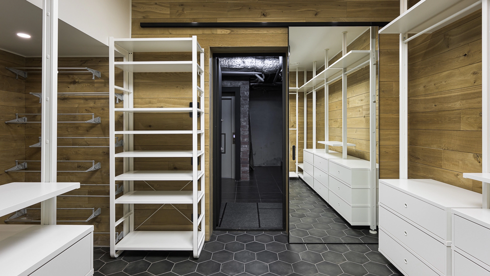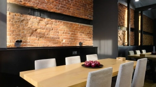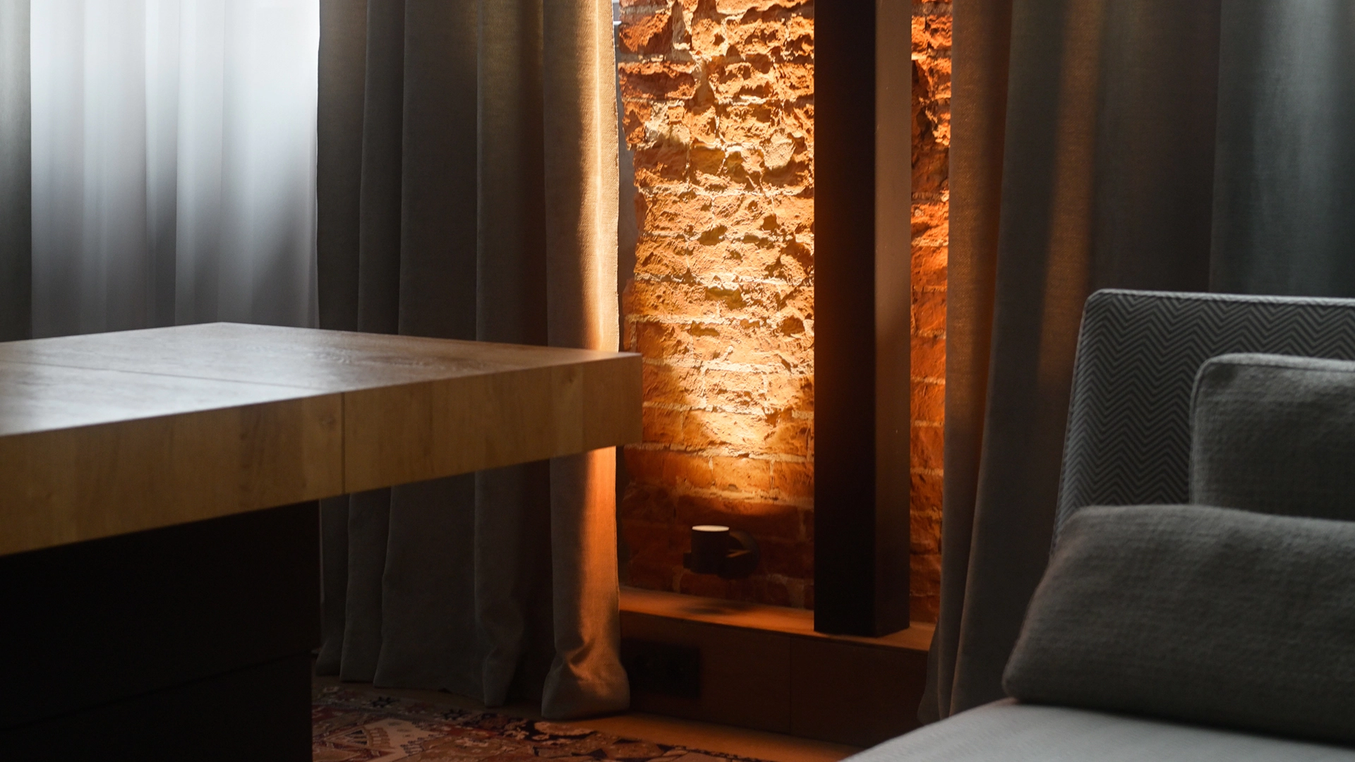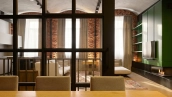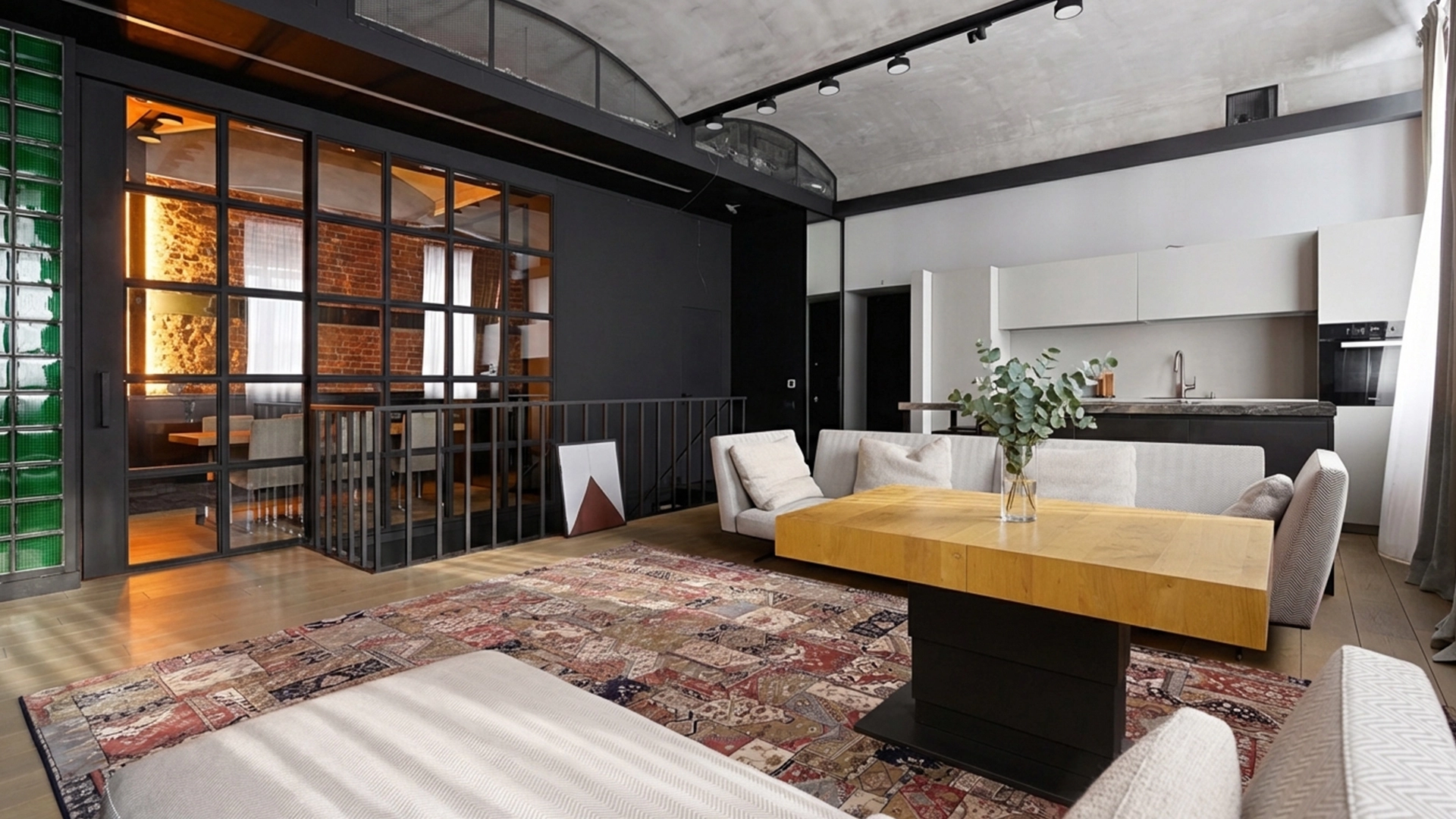 Two-level apartments with patio in the premium club complex "Kadashevskie Palaty" in the center of Moscow. Interior design in loft style with vaulted ceilings. The finishes include stained wood, natural stone, marble countertops, antique brick with hand-formed stamps.