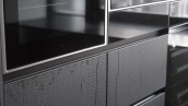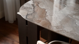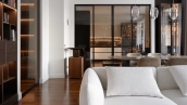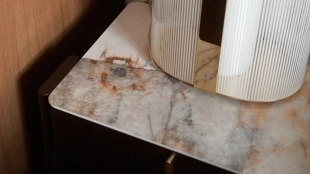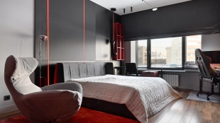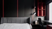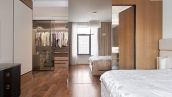 Wall panel in the master bedroom in veneer, leather and bronzed glass. Bedroom furniture: Bogacho and Lavsit beds, Living chest of drawers, Catalan Italia nightstands, Natuzzi Italia armchairs, Calligaris carpet.