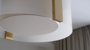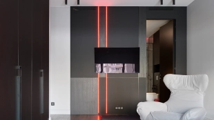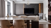 In the living room there is a BoConcept sofa, LG OLED 77 TV and a built-in library made to order - veneer, glass, decorative brass inserts. The TV zone and accent wall are by Modulnova.