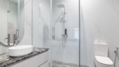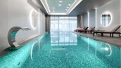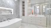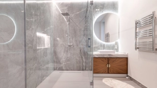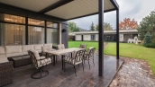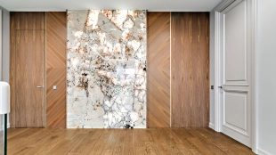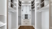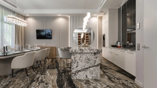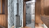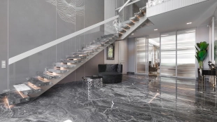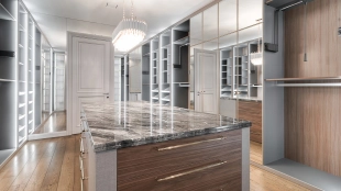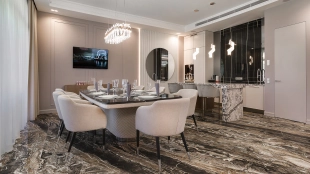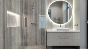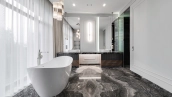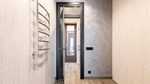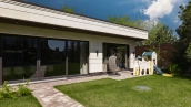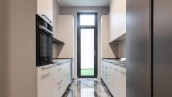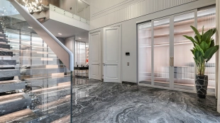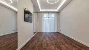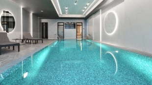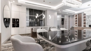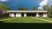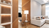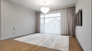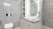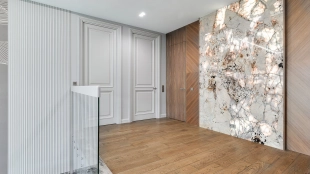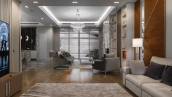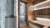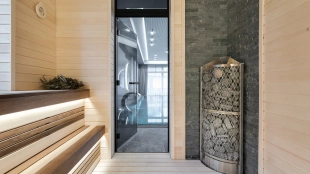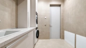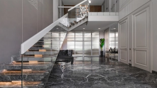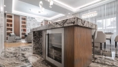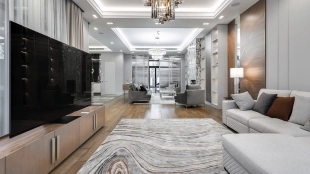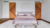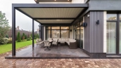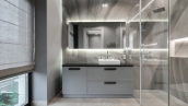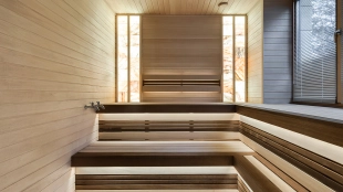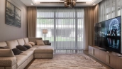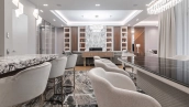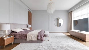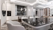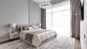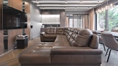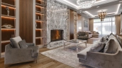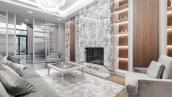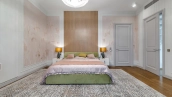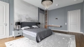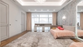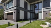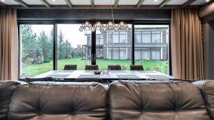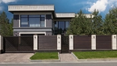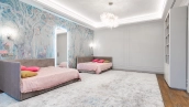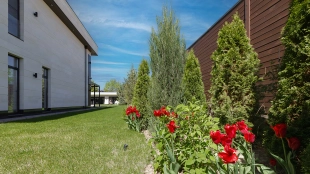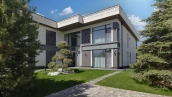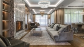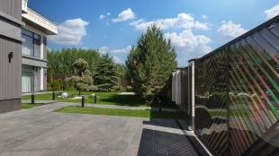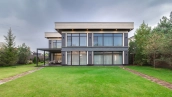 The country mansion with the area of 1015 m² is built on a spacious field plot of 20 hectares. The facade of the building with panoramic windows is designed in a modern style and decorated with backlighting. The interior is finished in milky and light gray tones combined with wood and stone textures and furnished with furniture. There are 6 bedrooms, a living room with a fireplace, a working kitchen, a dining room, a gym, a swimming pool, a sauna and a terrace. In the contour of the house there is a garage. Next to the house there is a guest house with recreation area and sauna. There are paved paths and coniferous trees on the lawn.