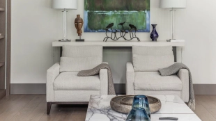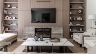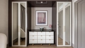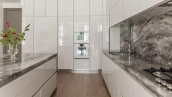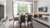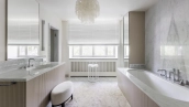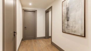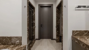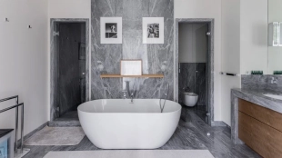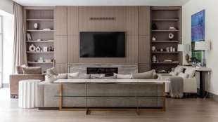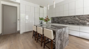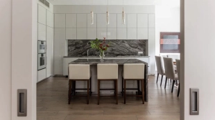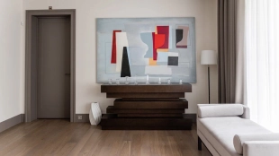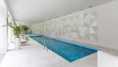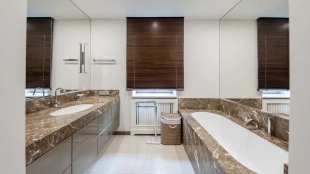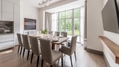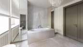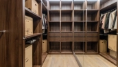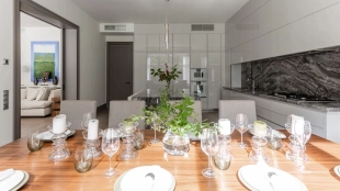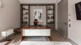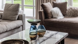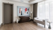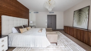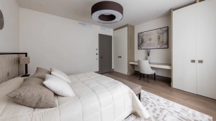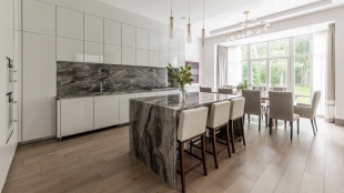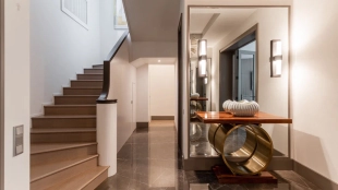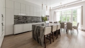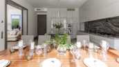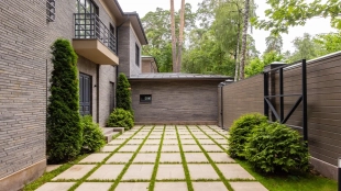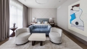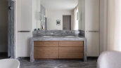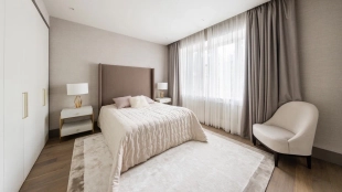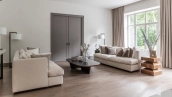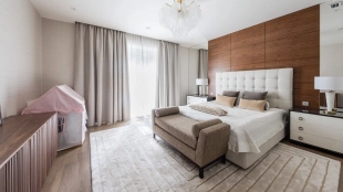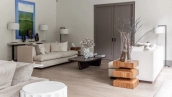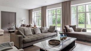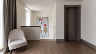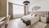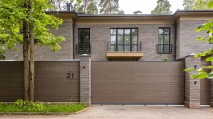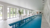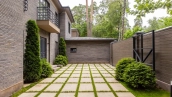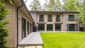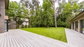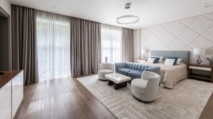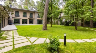 The 765 m² country residence is located on a well-maintained plot of 15 hectares surrounded by forest. The facade in modern style with large windows is clad in gray-beige tones. The interior in stone and wood textures supports the modern style of the building. On the first floor there is a spacious living room with fireplace, sofa group and access to the terrace. Next to it is an equipped kitchen with a large dining area. In the spa area you can relax in the swimming pool and sauna. Around the garage is planned a block for staff and a laundry room. On the second floor there are 4 bedrooms including a master-block with two dressing rooms and a bathroom.