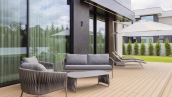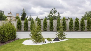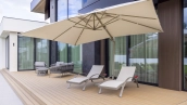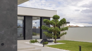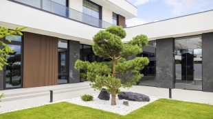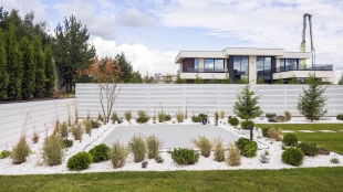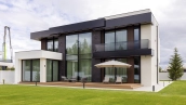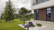 In the mansion planned a spacious kitchen-living room, 4 bedrooms, 5 dressing rooms and a winter garden. In addition designed terraces, for which used a wooden covering from the Swedish manufacturer CM Decking BARK. There is a built-in garage and a carport for 2 cars. As part of the landscape design on the site sown lawn and paved paths with installed street lighting.