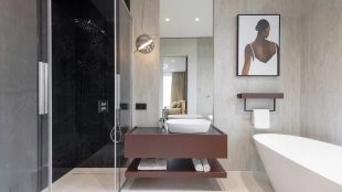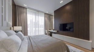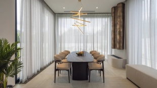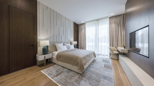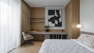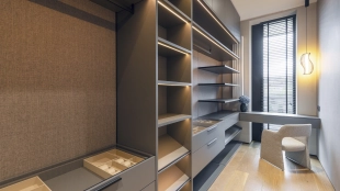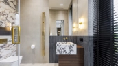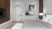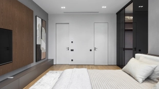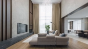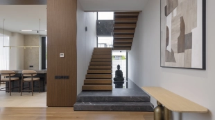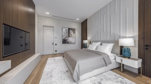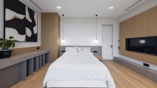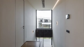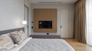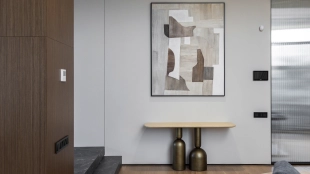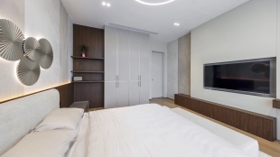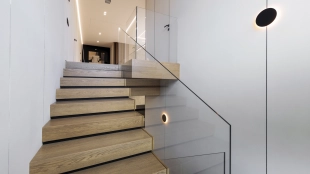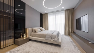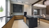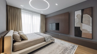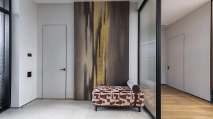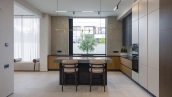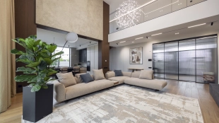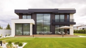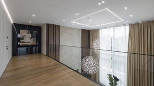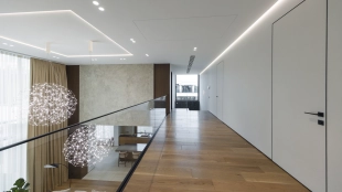 This 505 m² cottage with swimming pool is located on a 16 hectare plot. The minimalistic facade is clad with Italian Laminam porcelain stoneware and German StoMarlit plaster, and decorated with Canadian oak panels and backlighting. The house is filled with air and sunlight thanks to the second light and panoramic glazing. The interior is in light colors and complemented with stylish furniture, quality appliances and sanitary ware.