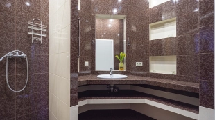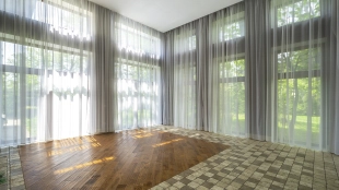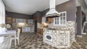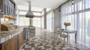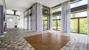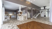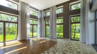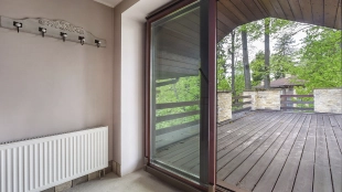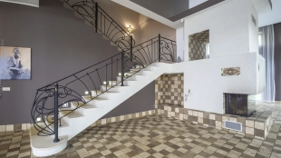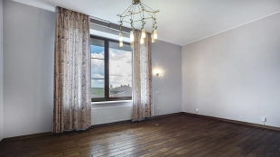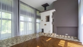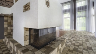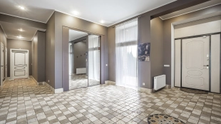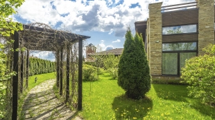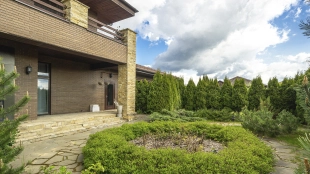 This 478 m² country house is located on a 25 hectare field plot with a beautiful view of the cultural monument "Berg Manor Water Tower". The facade with large windows and Frank Lloyd Wright style lighting is clad in brown clinker bricks and decorated with stone textured tiles. The cozy interior is made in calm colors, it remains only to complement it with comfortable furniture.