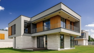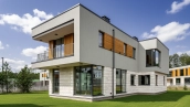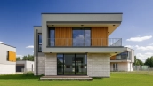 The country house with an area of 357 m² is built on a field plot of 14 hectares. The facade is made in a modern style and is faced with white plaster, clinker tiles and decorated with wood inserts. The cottage is presented without finishing, which allows you to realize an individual design project. The plot with a lawn is surrounded by a hedge.