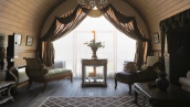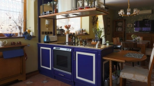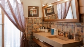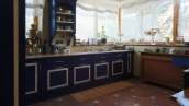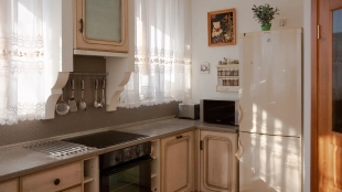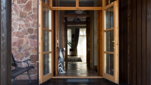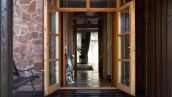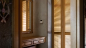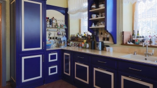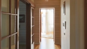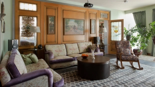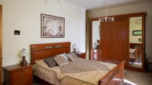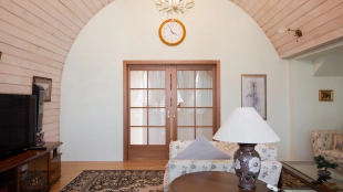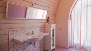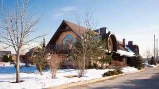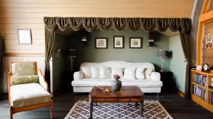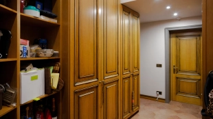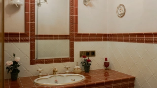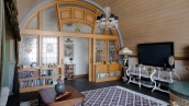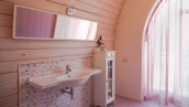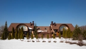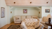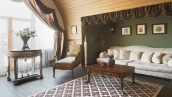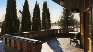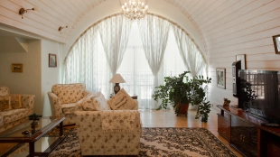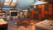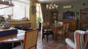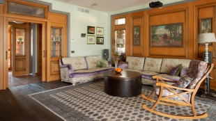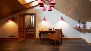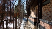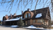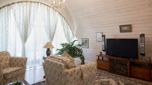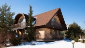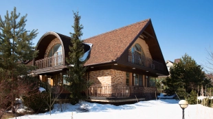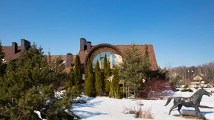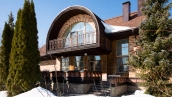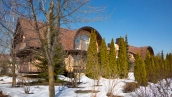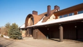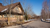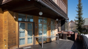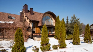 The spacious country house with an area of 739 m² is built on a 9.7 hectare plot. The facade of the building is faced with clinker bricks of different shades of brown, decorated with imitation masonry and illumination. Warm colors, wood texture, ornaments and elements of classic style prevail in the interior decoration. The layout divides the residence into 2 blocks, each of which has a separate entrance, its own garage for 1 car and a large terrace. The house has 5 bedrooms, living rooms with fireplaces, kitchen-dining rooms, a study and a movie theater. The plot is landscaped, paved paths, planted coniferous trees.