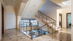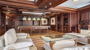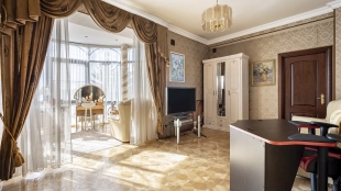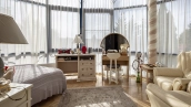 The country complex with a total area of 4200 m² is located on a spacious plot of 1.2 hectares on the bank of the Moskva River. All buildings are completed with furniture, household appliances and sanitary ware. The facade of the main house of 800 m² is made in neoclassical style, complemented by panoramic glazing and decorated with stucco, rustovka, columns and balustrade. The three-storey mansion has a living room with fireplace, a dining room with second light and access to the terrace, 6 bedrooms, a wine cellar and a sauna. For ease of movement between floors in the residence is equipped with an elevator.