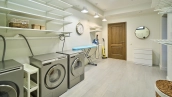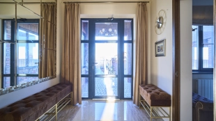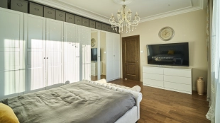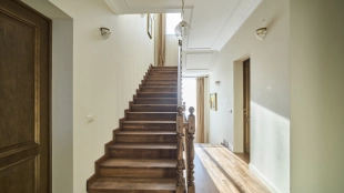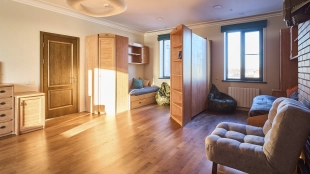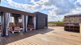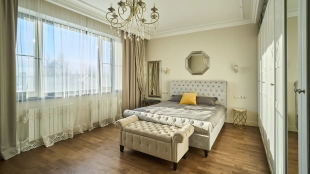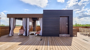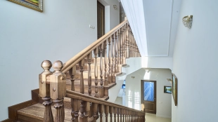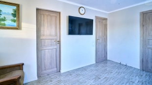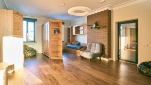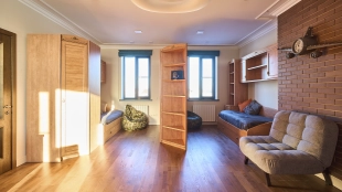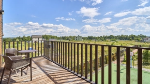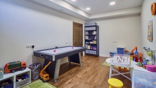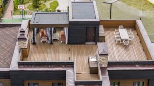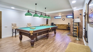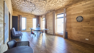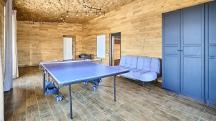 The layout includes a spacious living room-kitchen-dining room for family dinners and reception of guests, a convenient for work office, 3 bedrooms, a gym with table tennis, a fireplace room with billiards, karaoke and professional acoustics, as well as a children's playroom with air hockey and toys. On the 150 m² operated roof there is a comfortable recreation area with panoramic views of nature. In addition, the house has a garage for 2 cars.