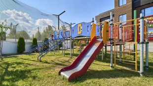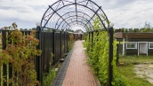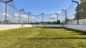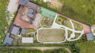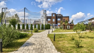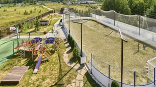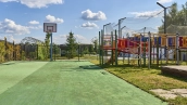 basketball court, children's playground with a sandpit, a dog enclosure with lighting and fencing, a pergola for barbecues and a patio, ideal for evening gatherings by the fire. The landscaping includes a lawn, trees and shrubs, paved paths, street lighting and a garden for privacy and recuperation.