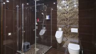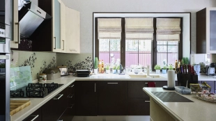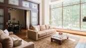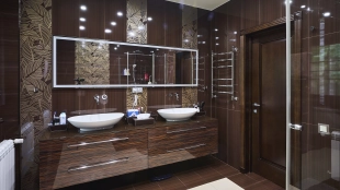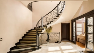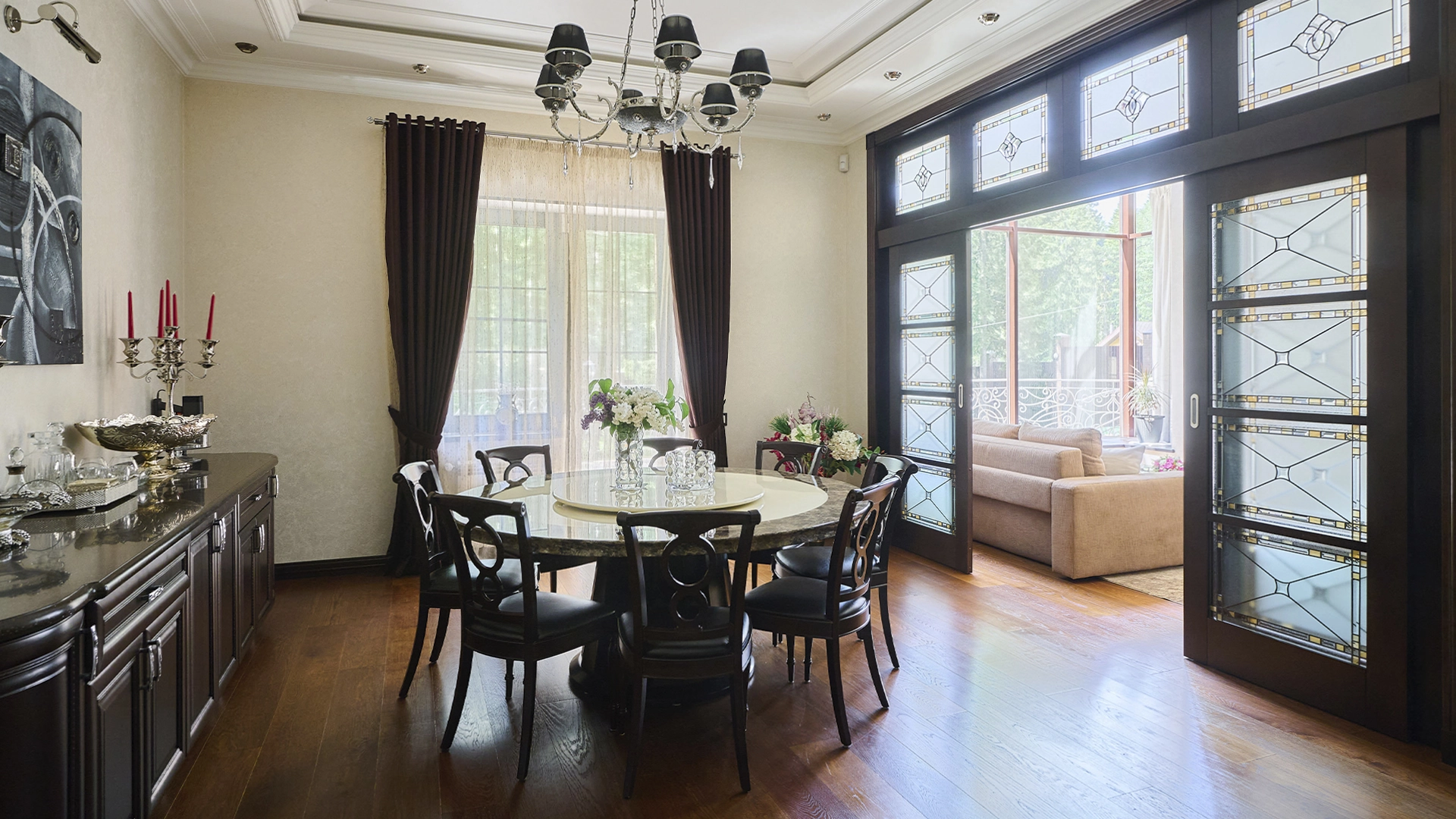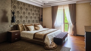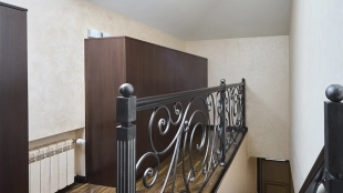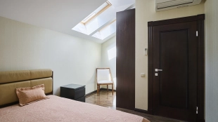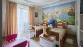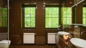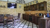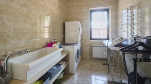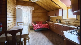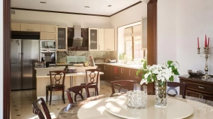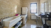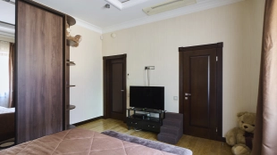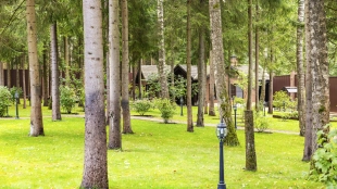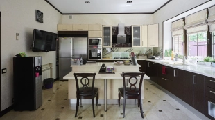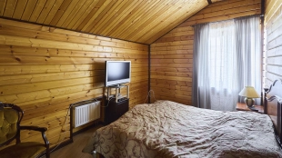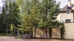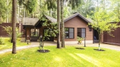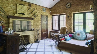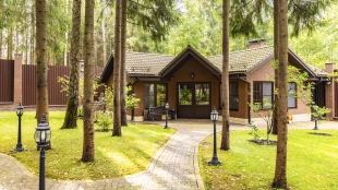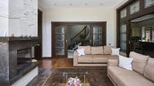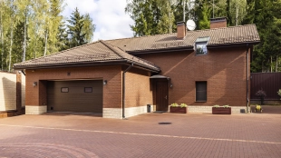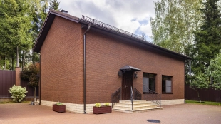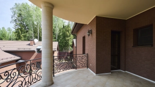 The country cottage with an area of 381 m² is located on a picturesque plot of 13.5 hectares surrounded by forest. The facade is made in European style, faced with noble red brick and tiles with stone texture on the basement, and decorated with elegant columns and wrought iron elements. The modern interiors are decorated in light colors with an emphasis on high quality materials. The house is fully equipped with comfortable furniture, household appliances and sanitary ware, and air conditioning system is installed for perfect microclimate.