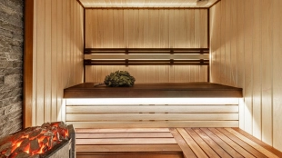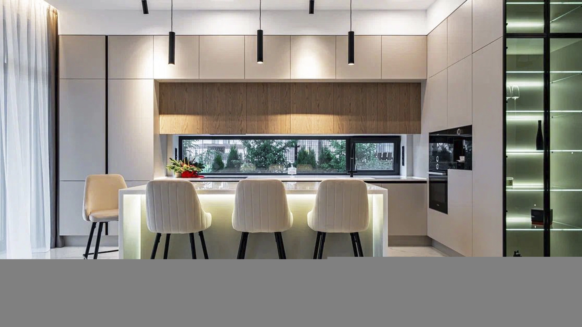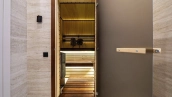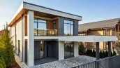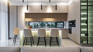 The country cottage of 310 m² is located on a 6 hectare plot in a quiet upper part of the settlement. The modern facade, harmoniously combining stone and wood textures, looks especially spectacular in the evening thanks to stylish architectural lighting. Panoramic windows open up picturesque views of the lake and fill the interior spaces with sunshine, visually expanding them.