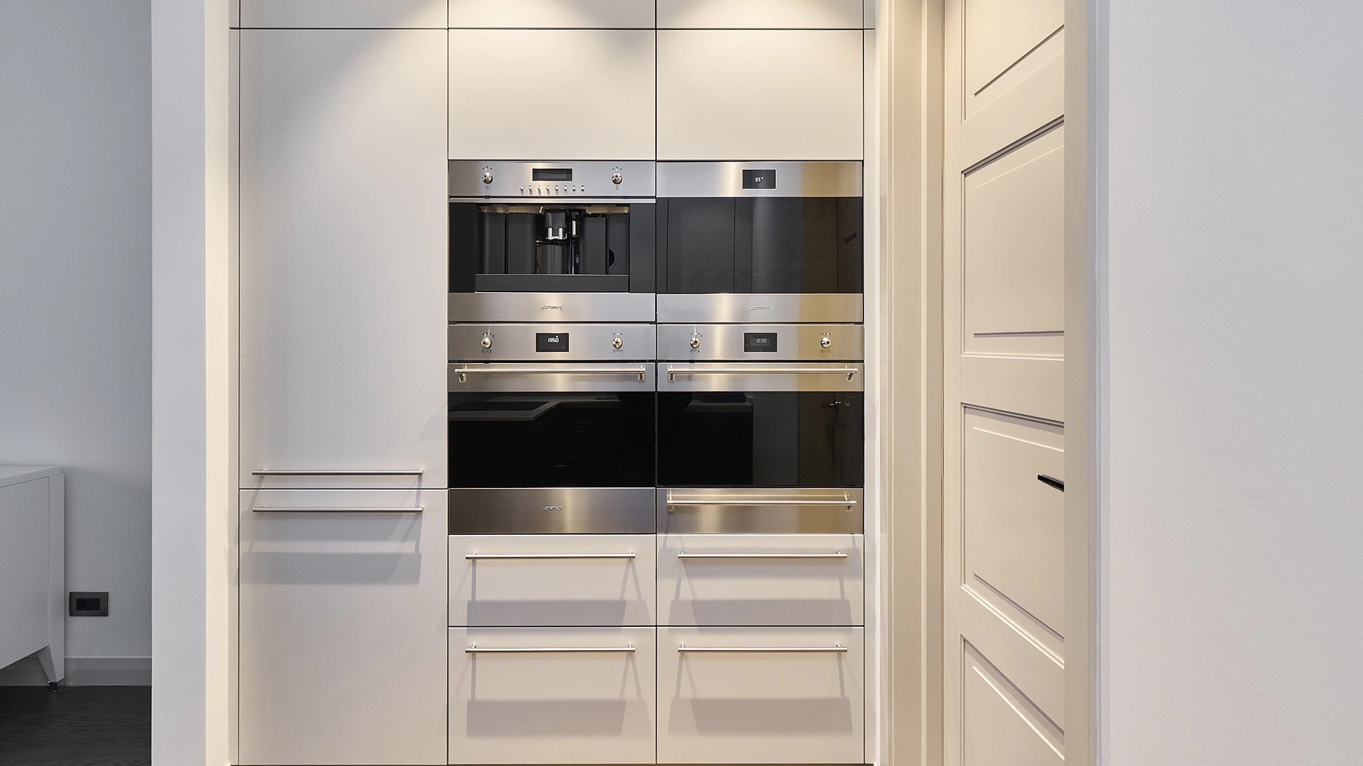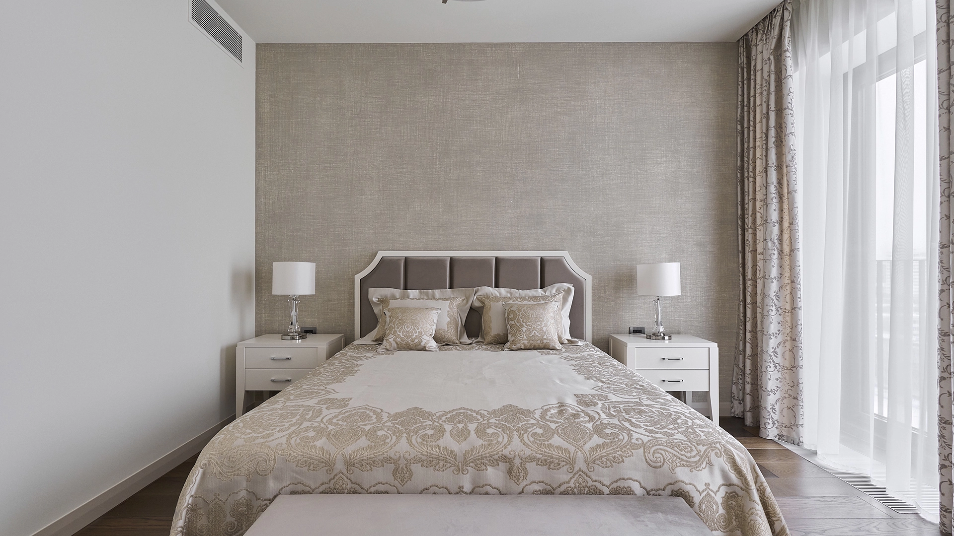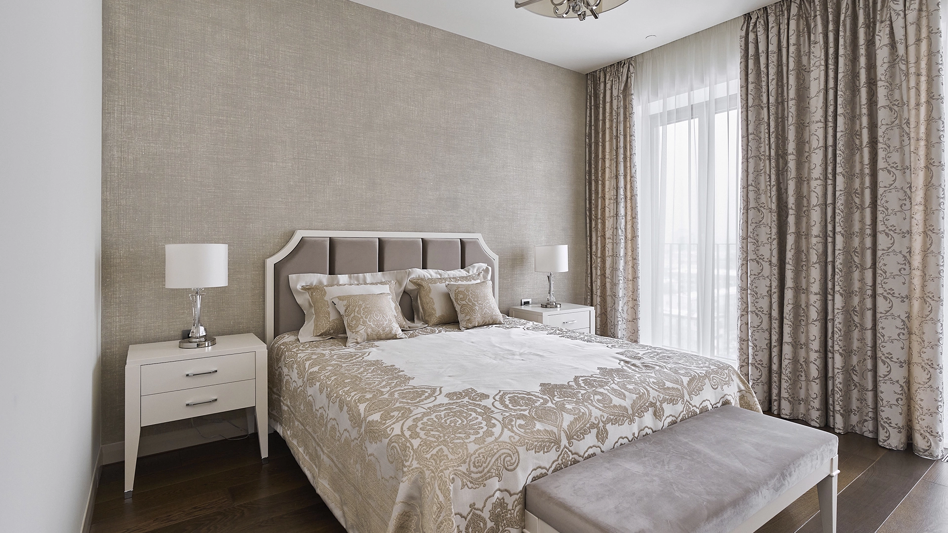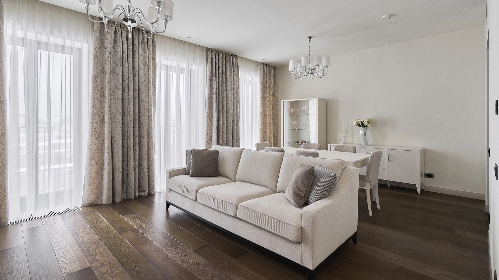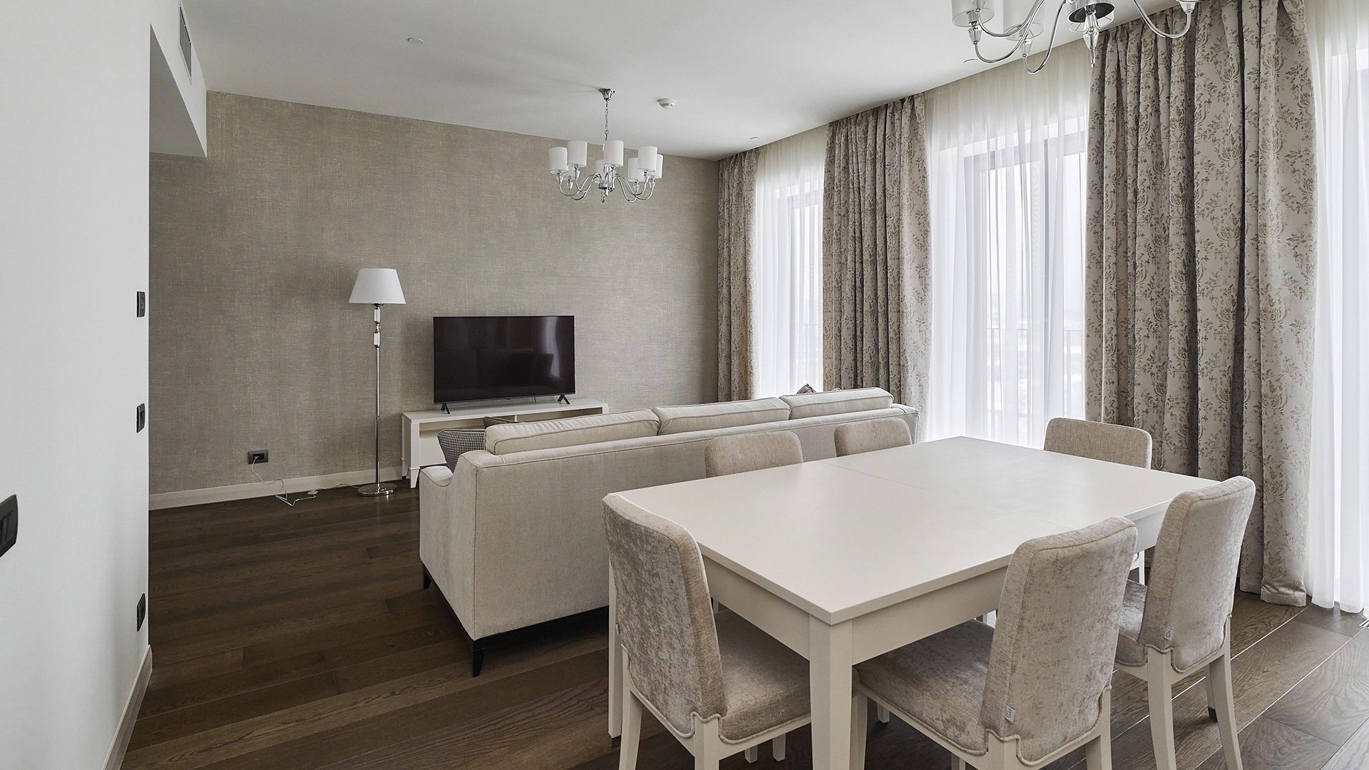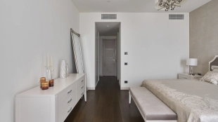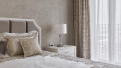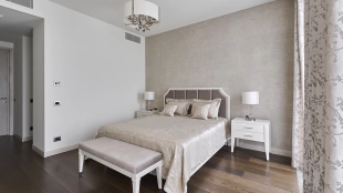 View apartments in the premium-class complex "VTB Arena Park" near Petrovsky Park. Designer finishing in pleasant light beige colors, the interior is decorated in the style of modern classics. Panoramic windows in combination with high ceilings fill the space with light. Layout: kitchen-living room, bedroom, bathroom, guest toilet, dressing room, laundry room, hall. The apartment is fully equipped with furniture and modern appliances. The windows offer views of the city panorama. The residents of the complex have access to the services of Hyatt Regency Moscow hotel.
