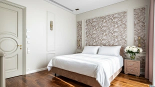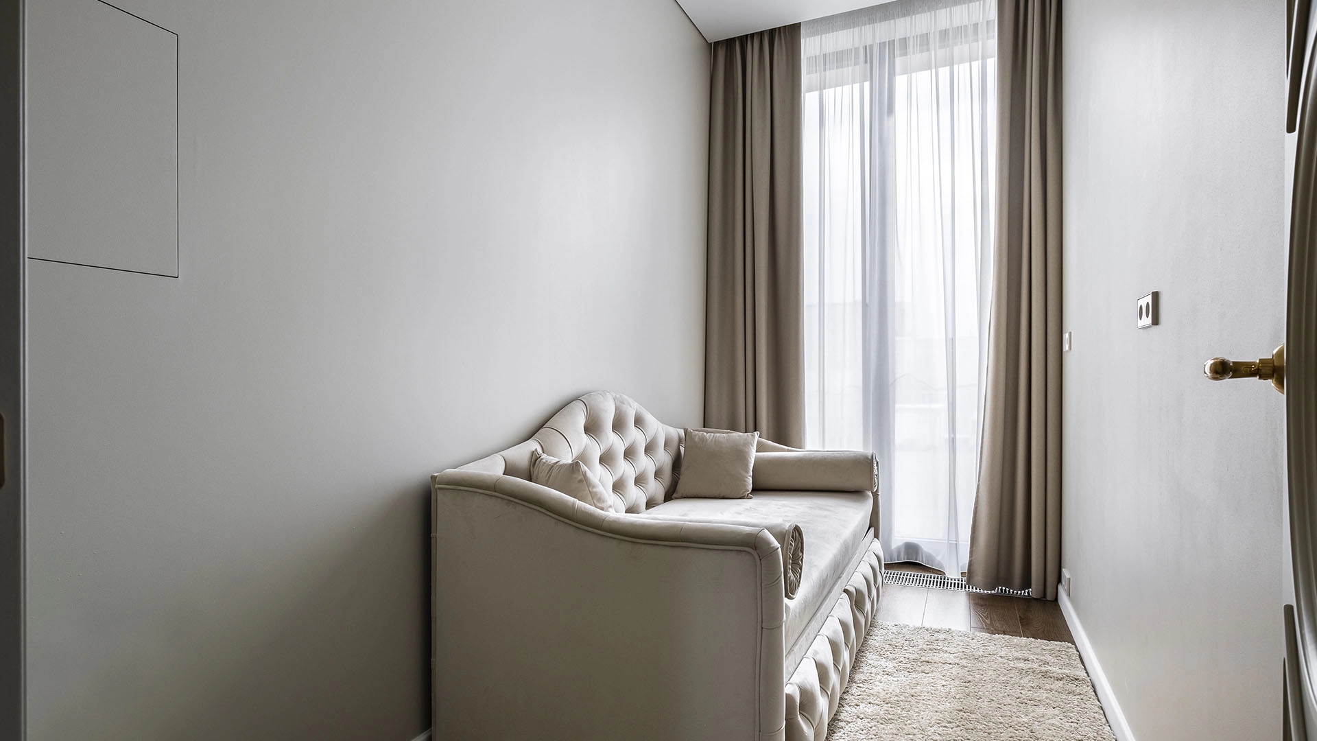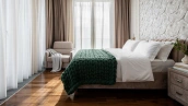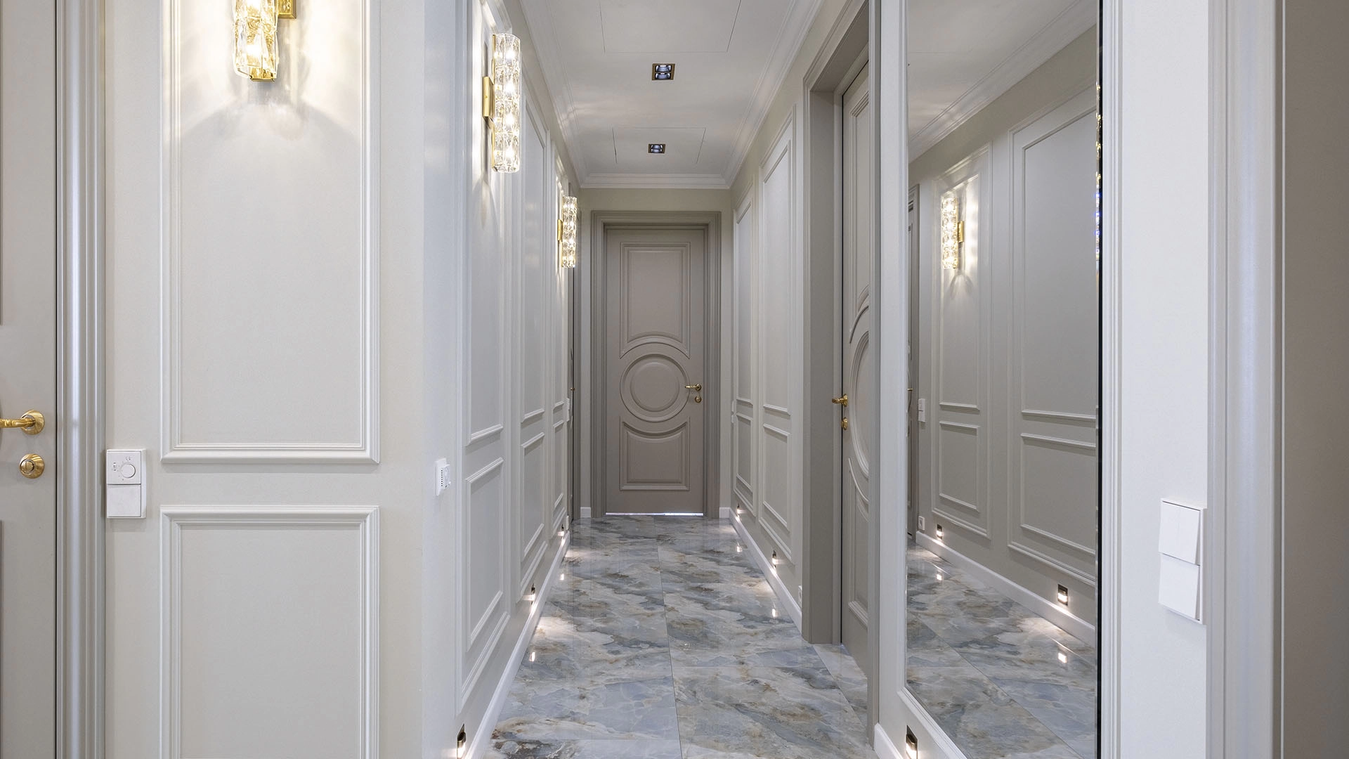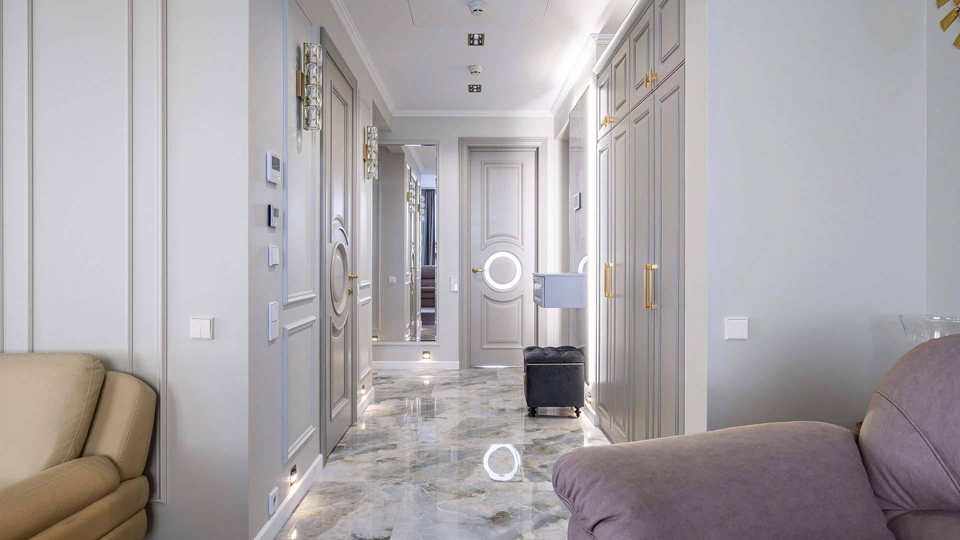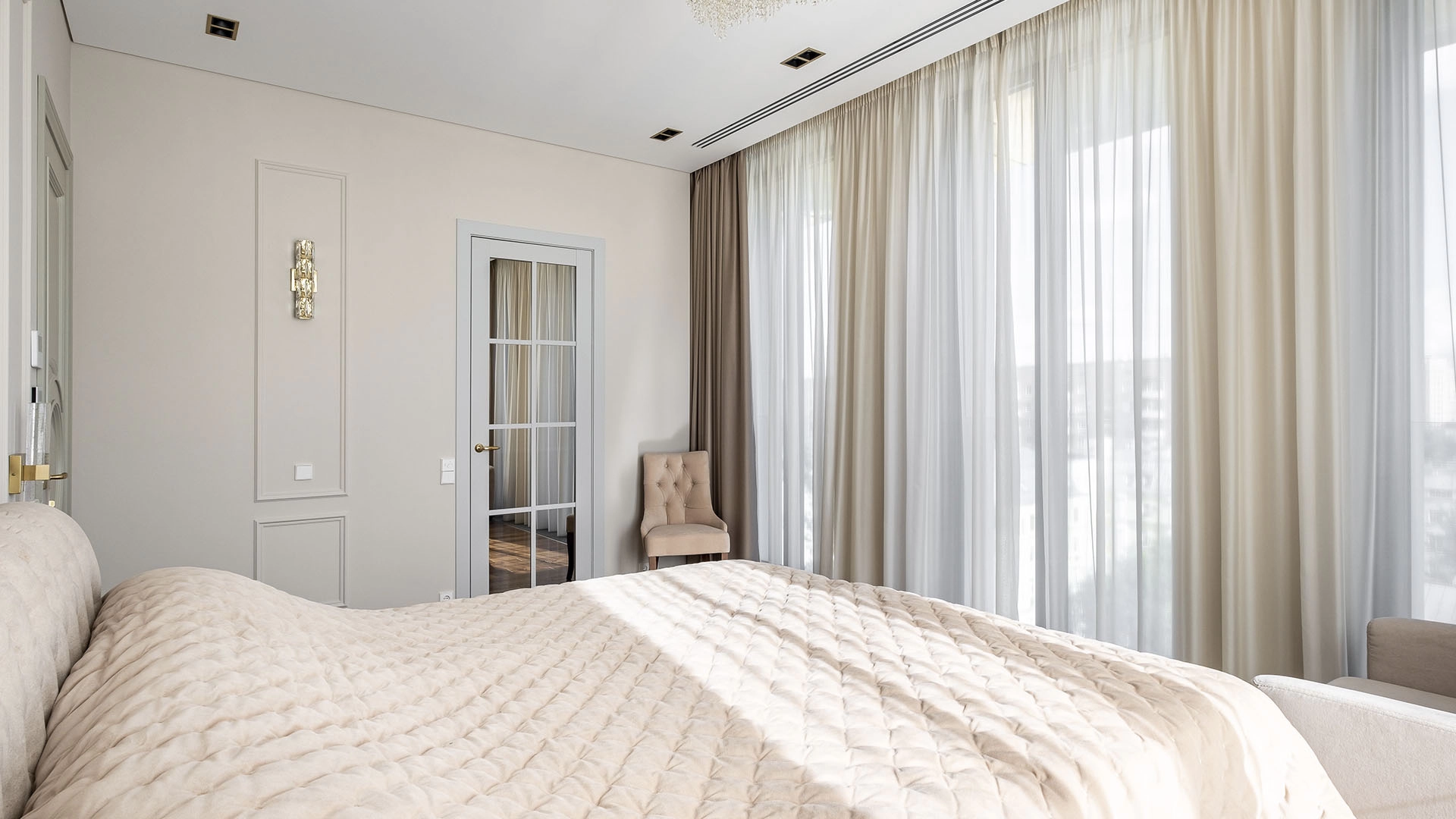 Spacious 3-bedroom apartment with total area of 125 m² in White Khamovniki complex. The interior is decorated in laconic light colors. The flooring is made of natural oak parquet Siberian Floors Prime. The bathroom has Archskin Pietra di Savoia Perla porcelain stoneware, a natural stone sink and Dornbracht Vaia faucets.