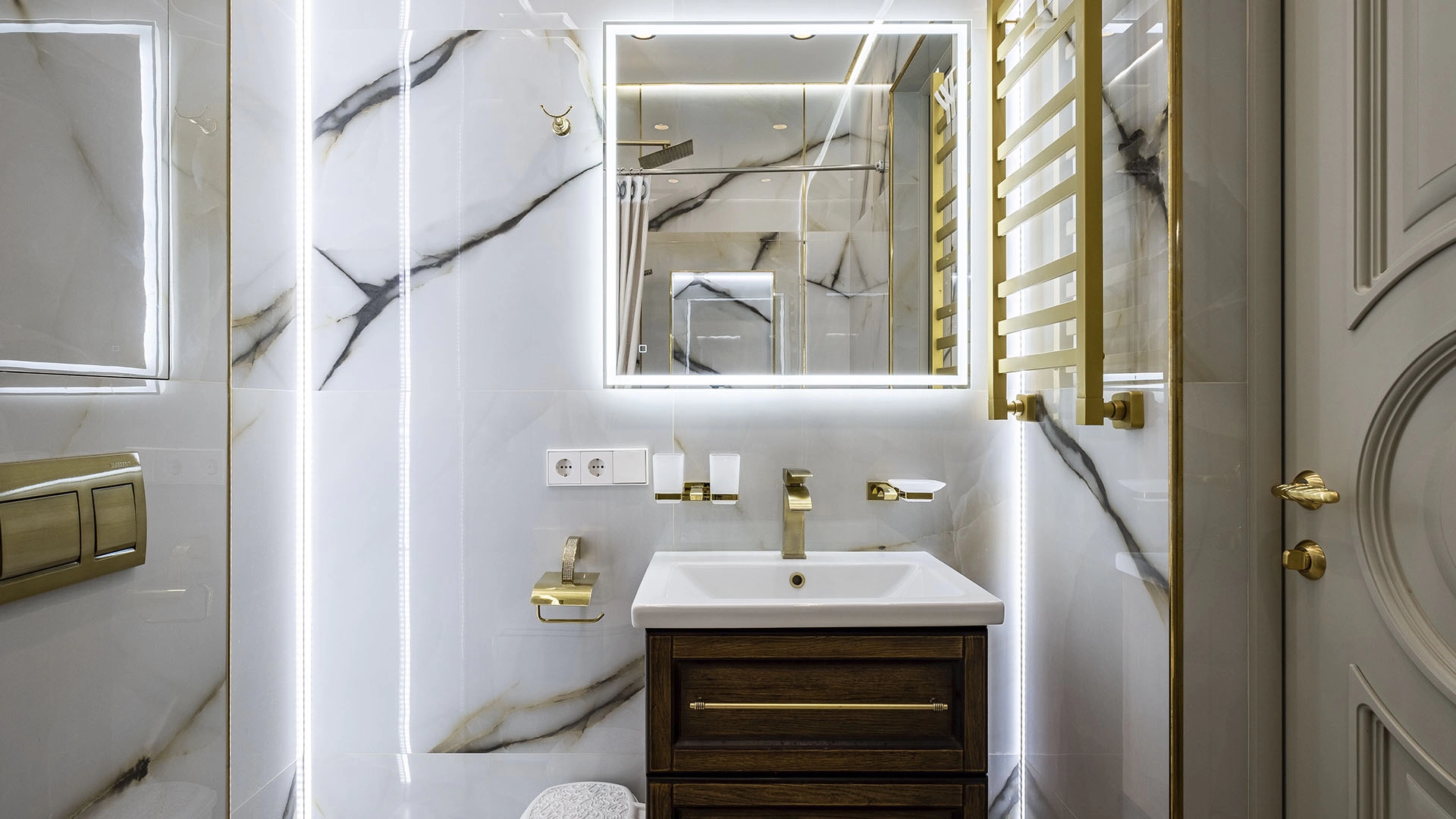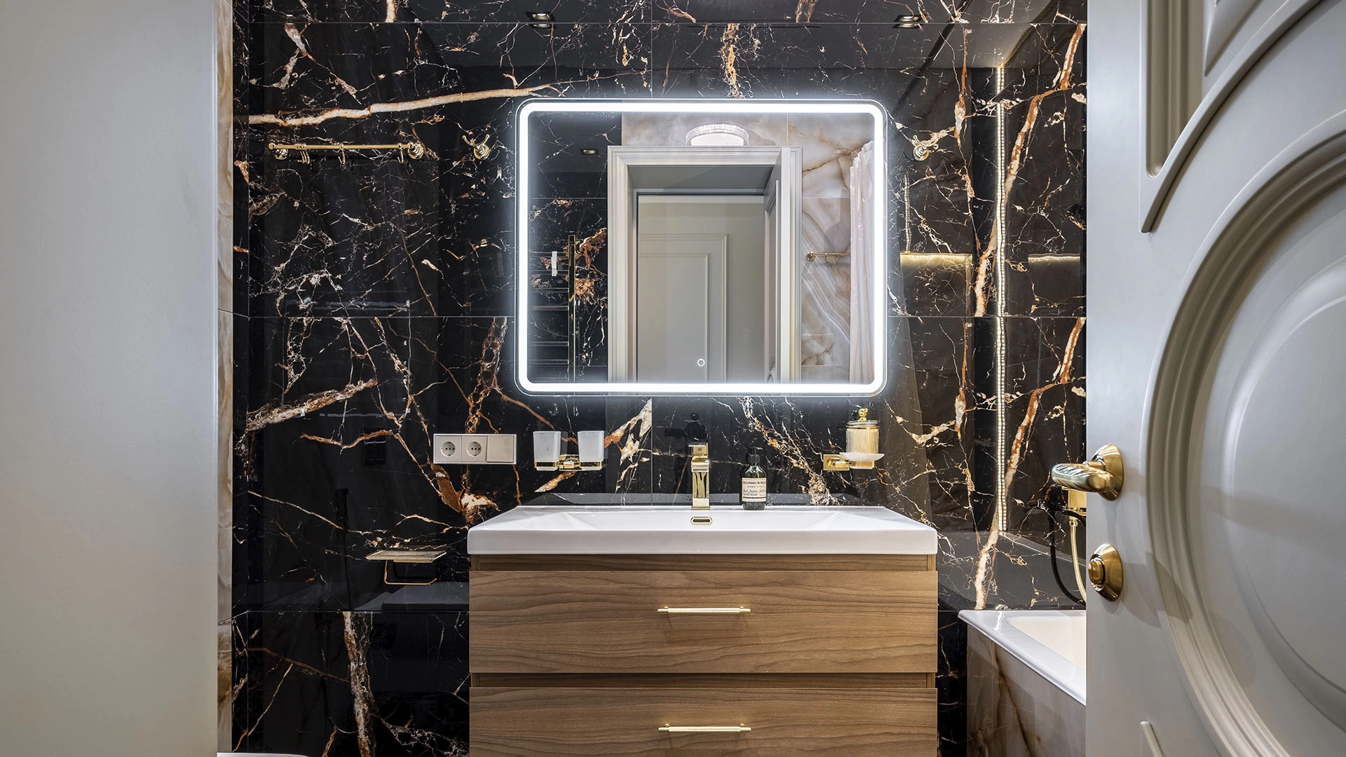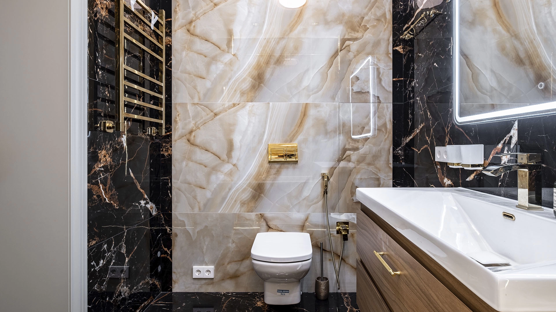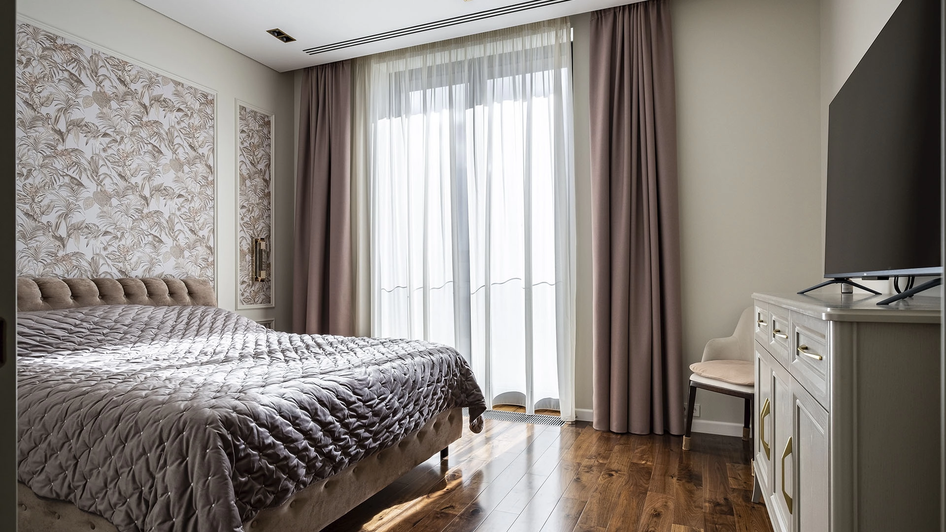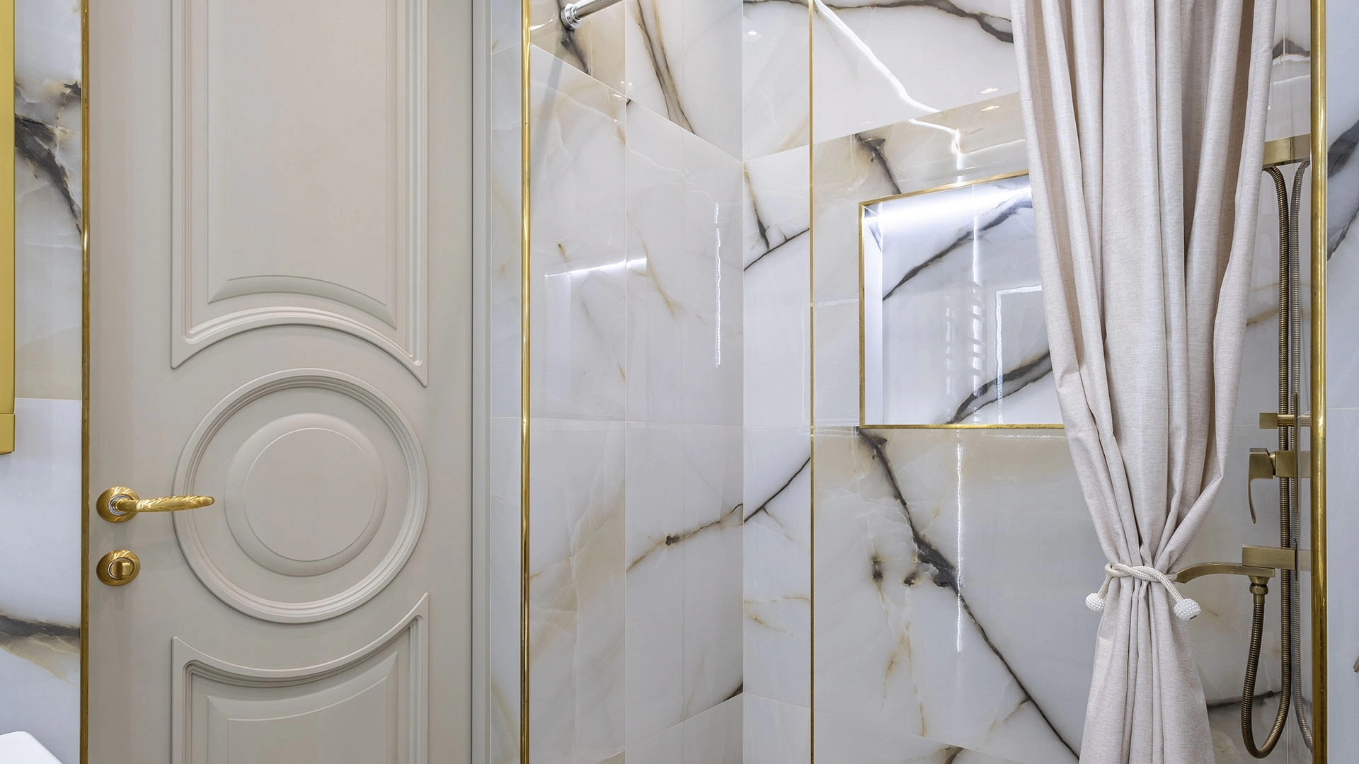 Spacious 3-bedroom apartment with total area of 125 m² in White Khamovniki complex. The interior is decorated in laconic light colors. The flooring is made of natural oak parquet Siberian Floors Prime. The bathroom has Archskin Pietra di Savoia Perla porcelain stoneware, a natural stone sink and Dornbracht Vaia faucets.