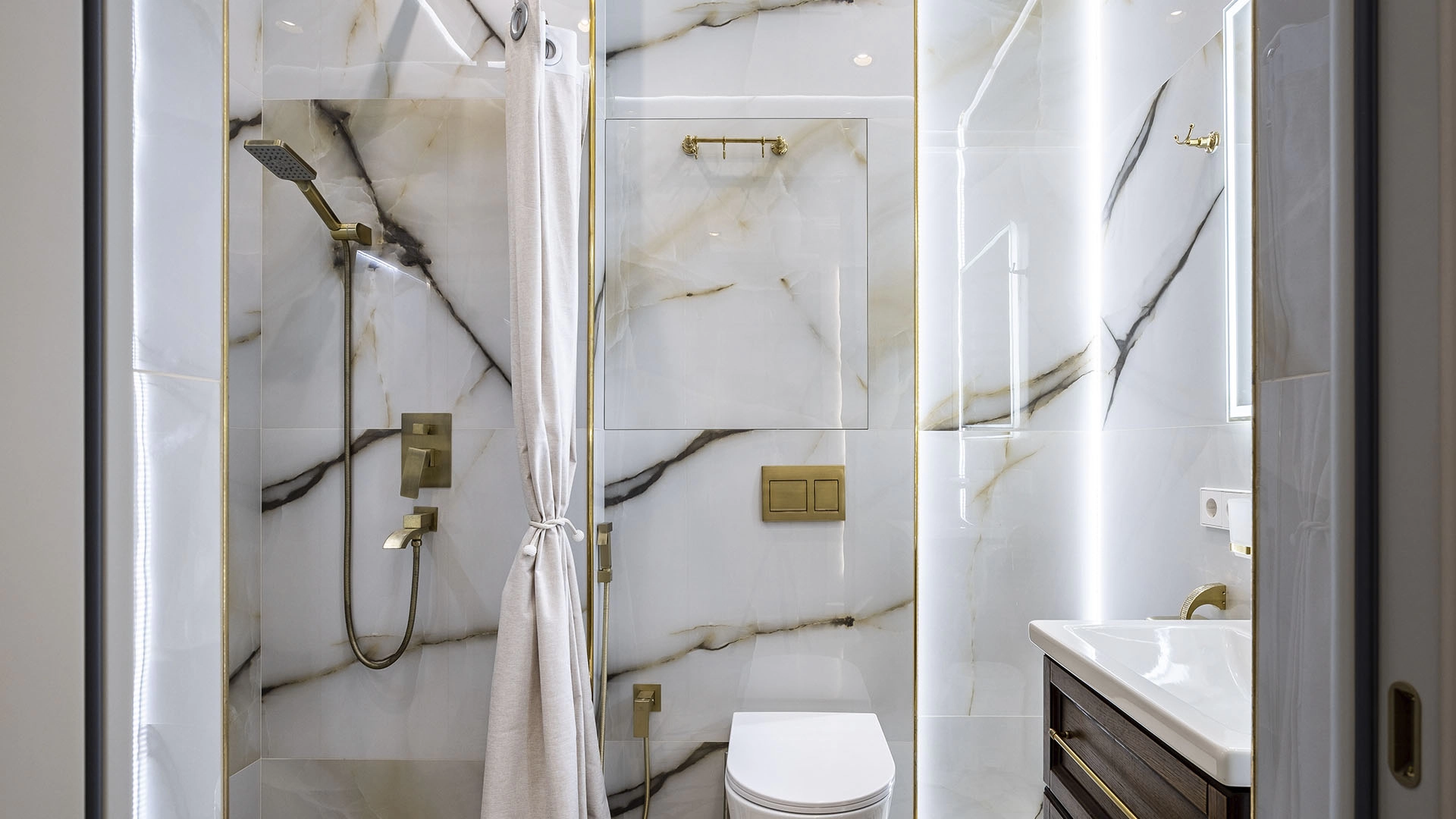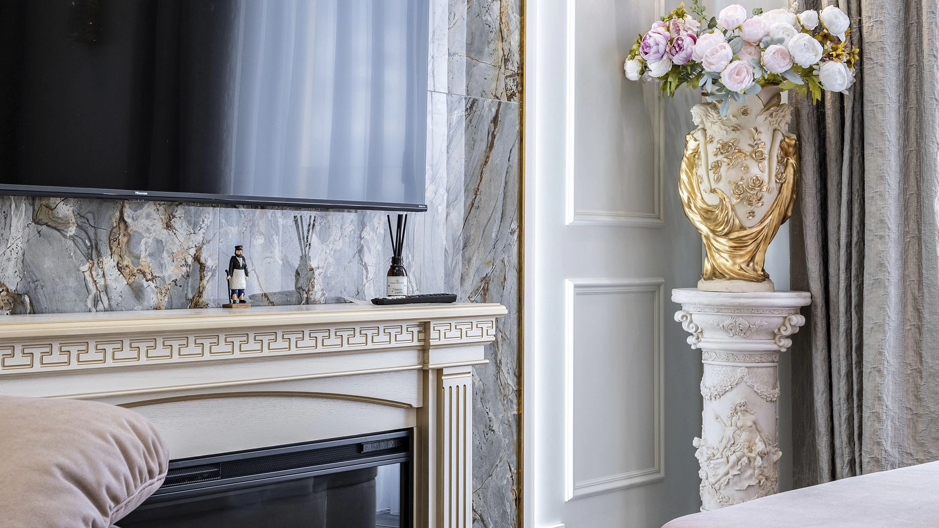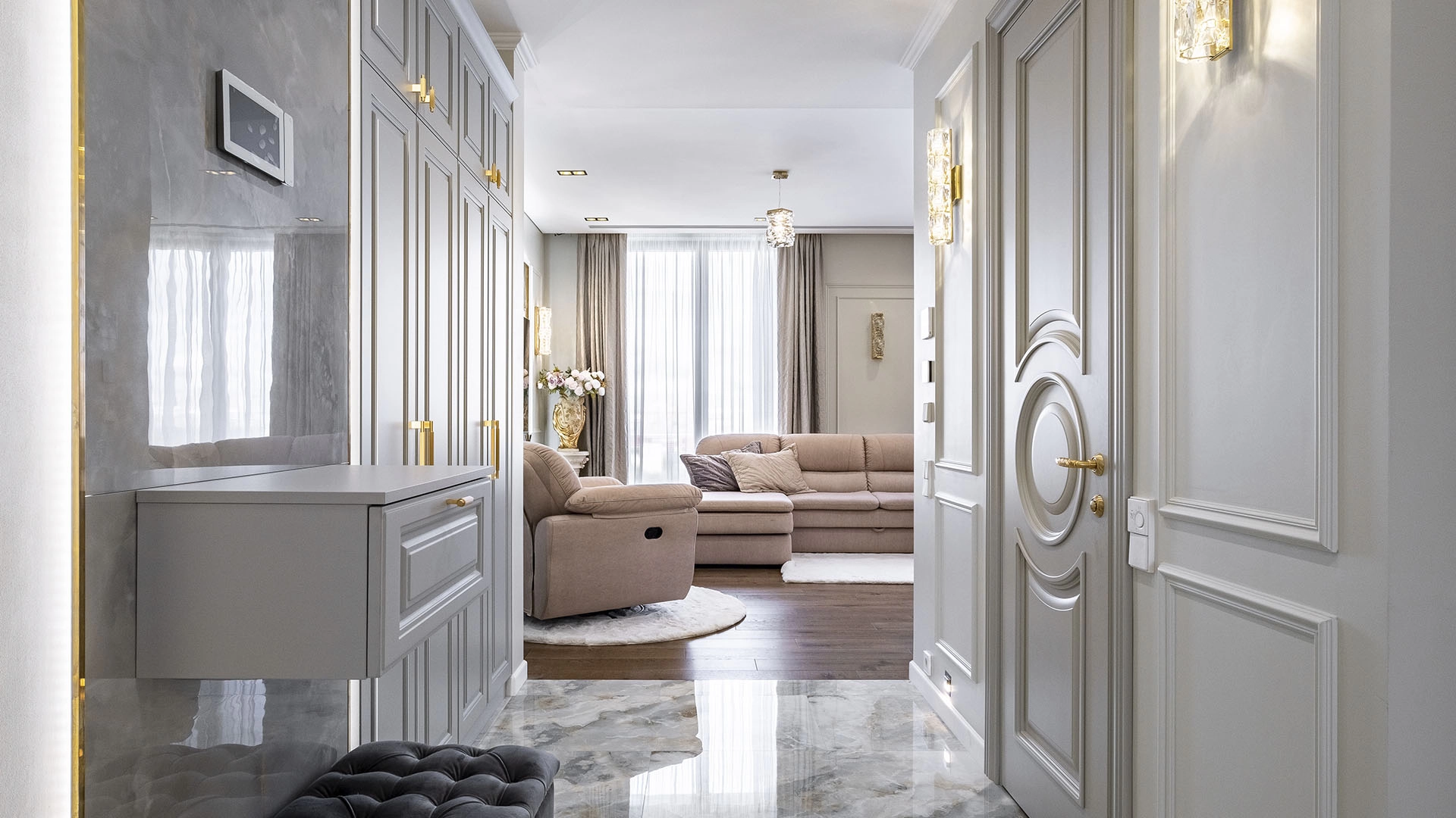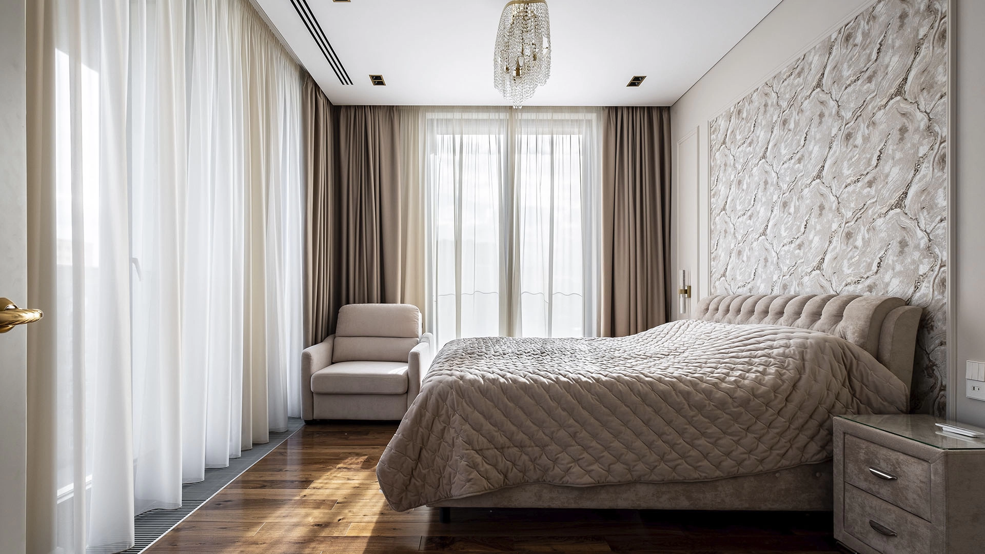 Spacious 3-bedroom apartment with total area of 125 m² in White Khamovniki complex. The interior is decorated in laconic light colors. The flooring is made of natural oak parquet Siberian Floors Prime. The bathroom has Archskin Pietra di Savoia Perla porcelain stoneware, a natural stone sink and Dornbracht Vaia faucets.