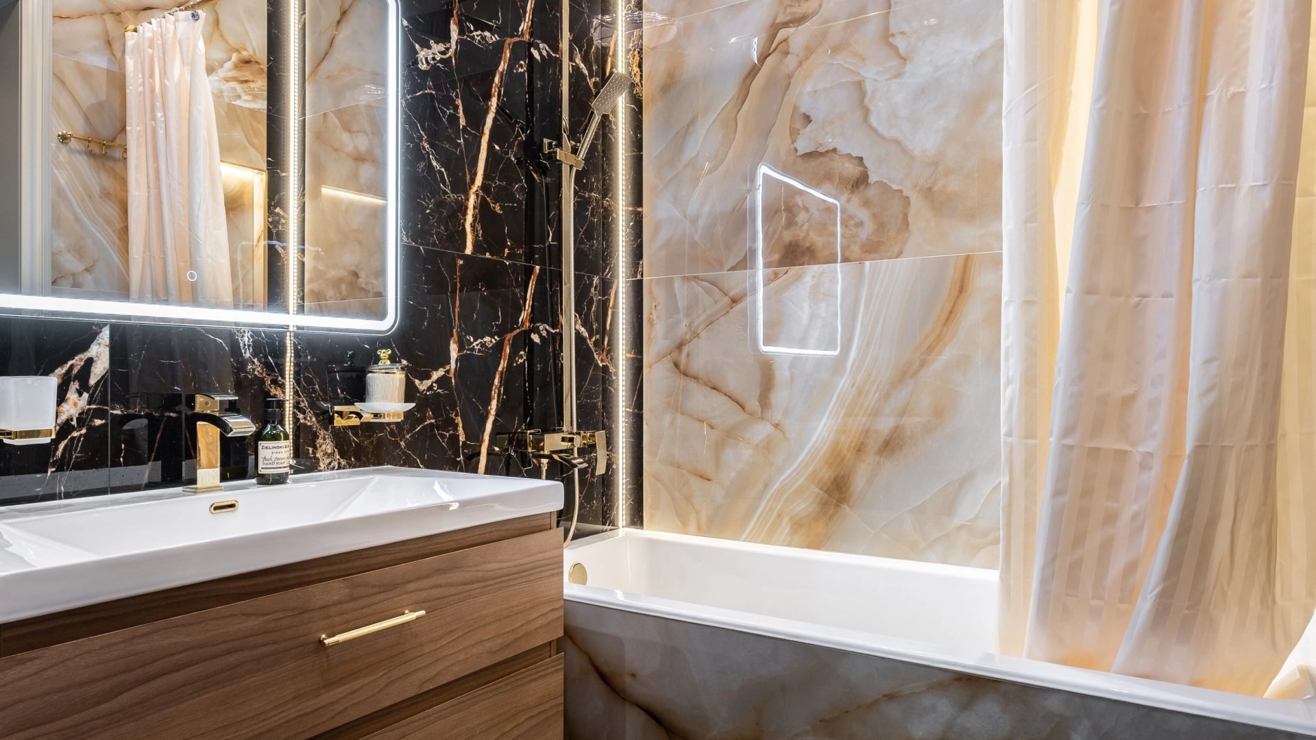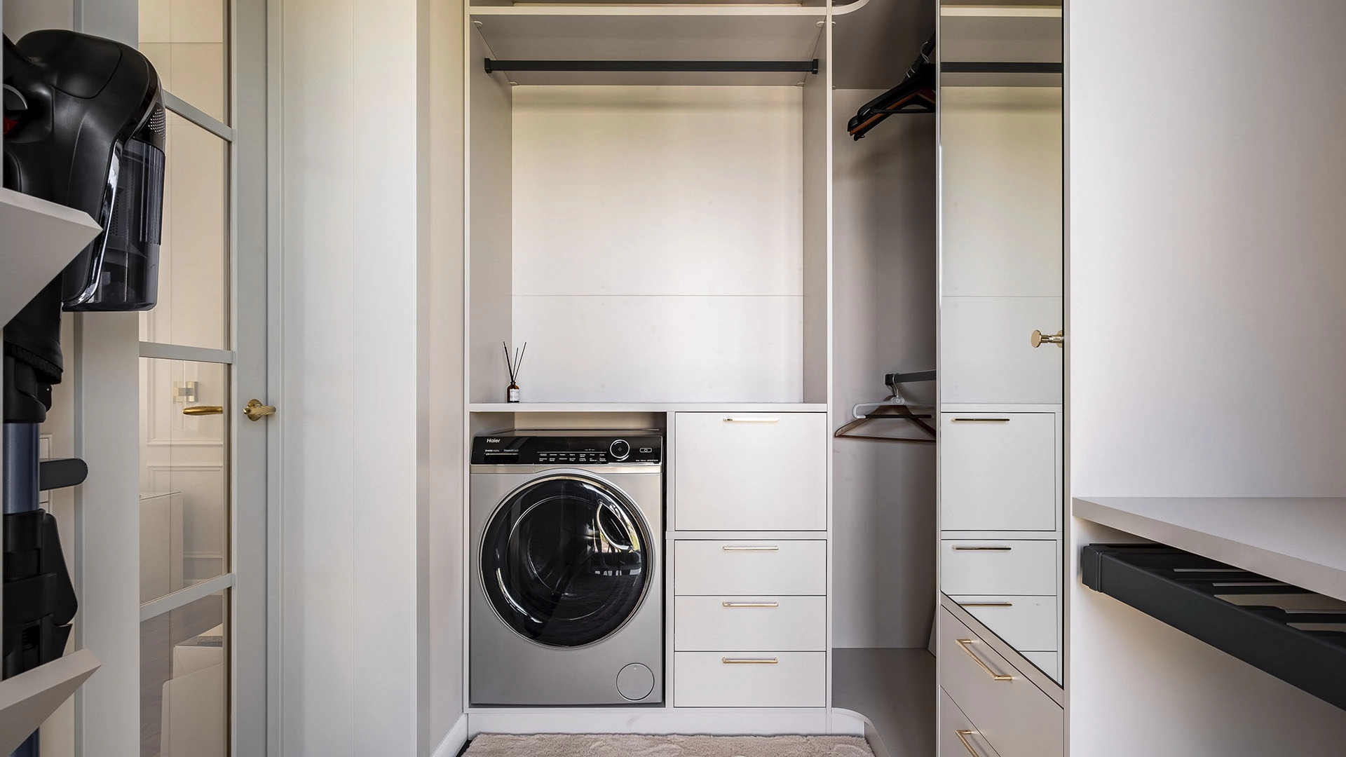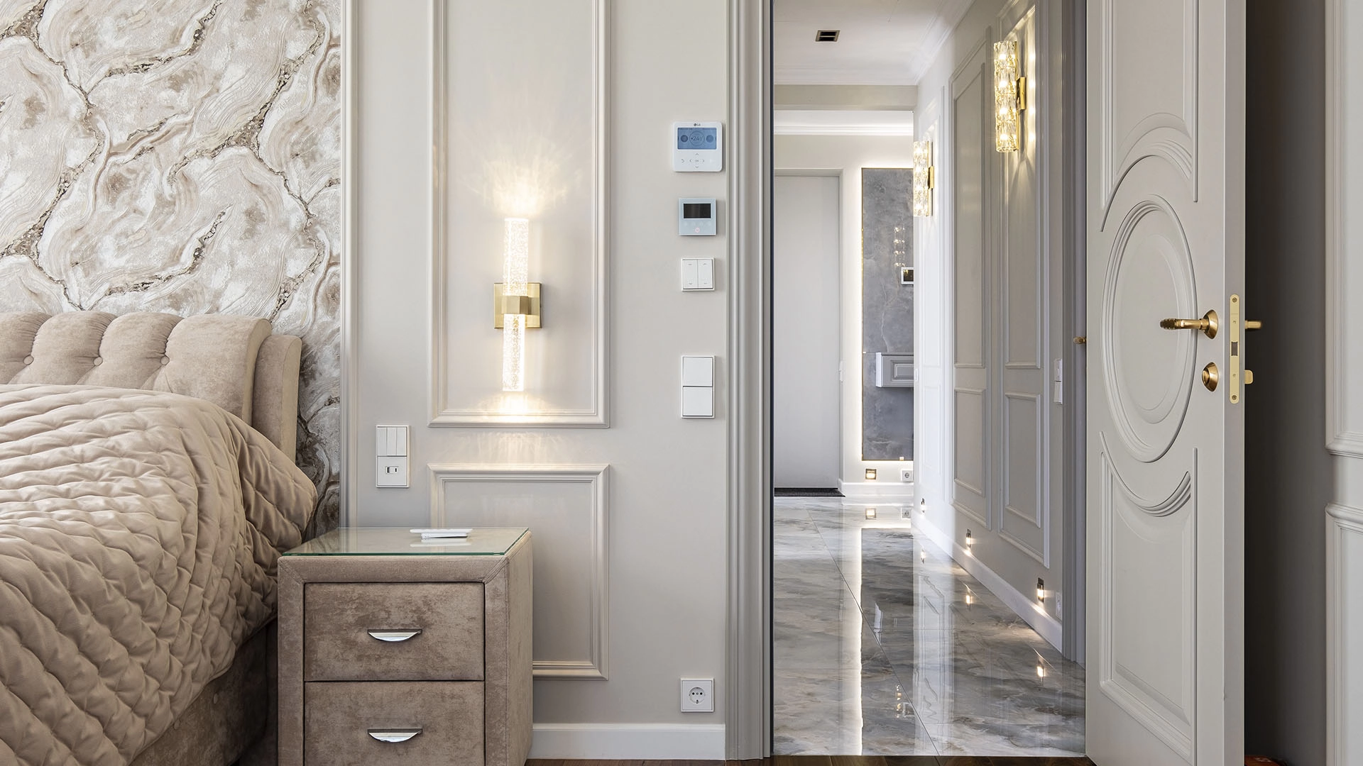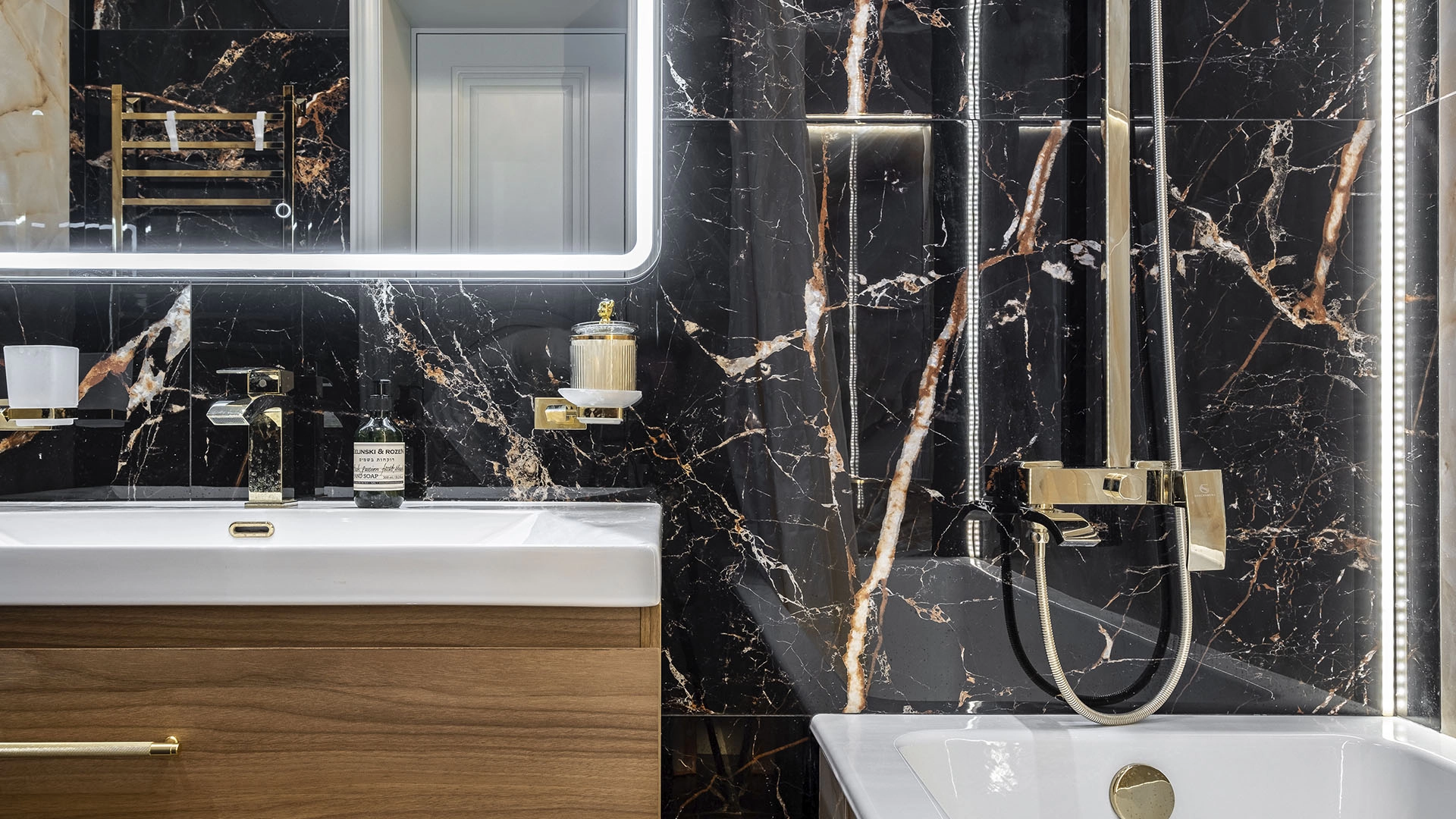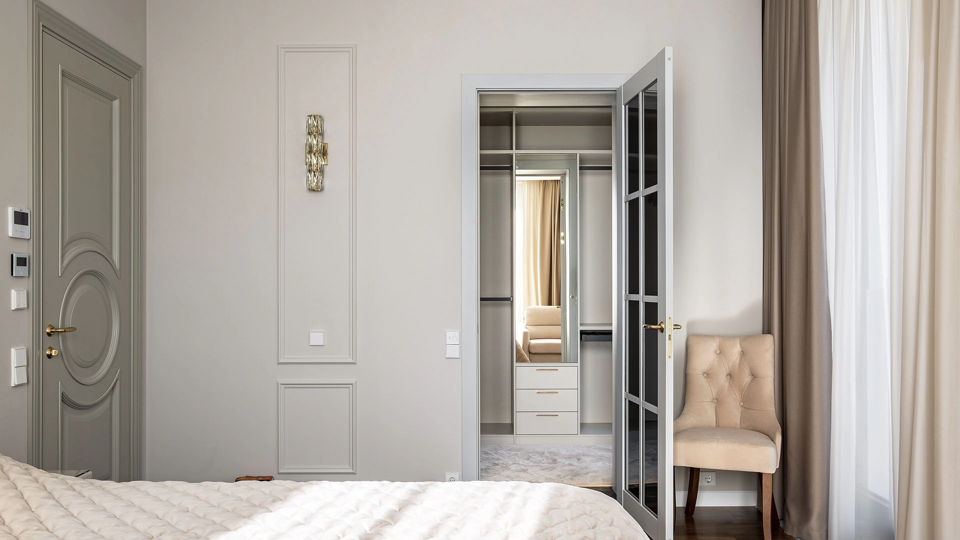Spacious 3-bedroom apartment with total area of 125 m² in White Khamovniki complex. The interior is decorated in laconic light colors. The flooring is made of natural oak parquet Siberian Floors Prime. The bathroom has Archskin Pietra di Savoia Perla porcelain stoneware, a natural stone sink and Dornbracht Vaia faucets.