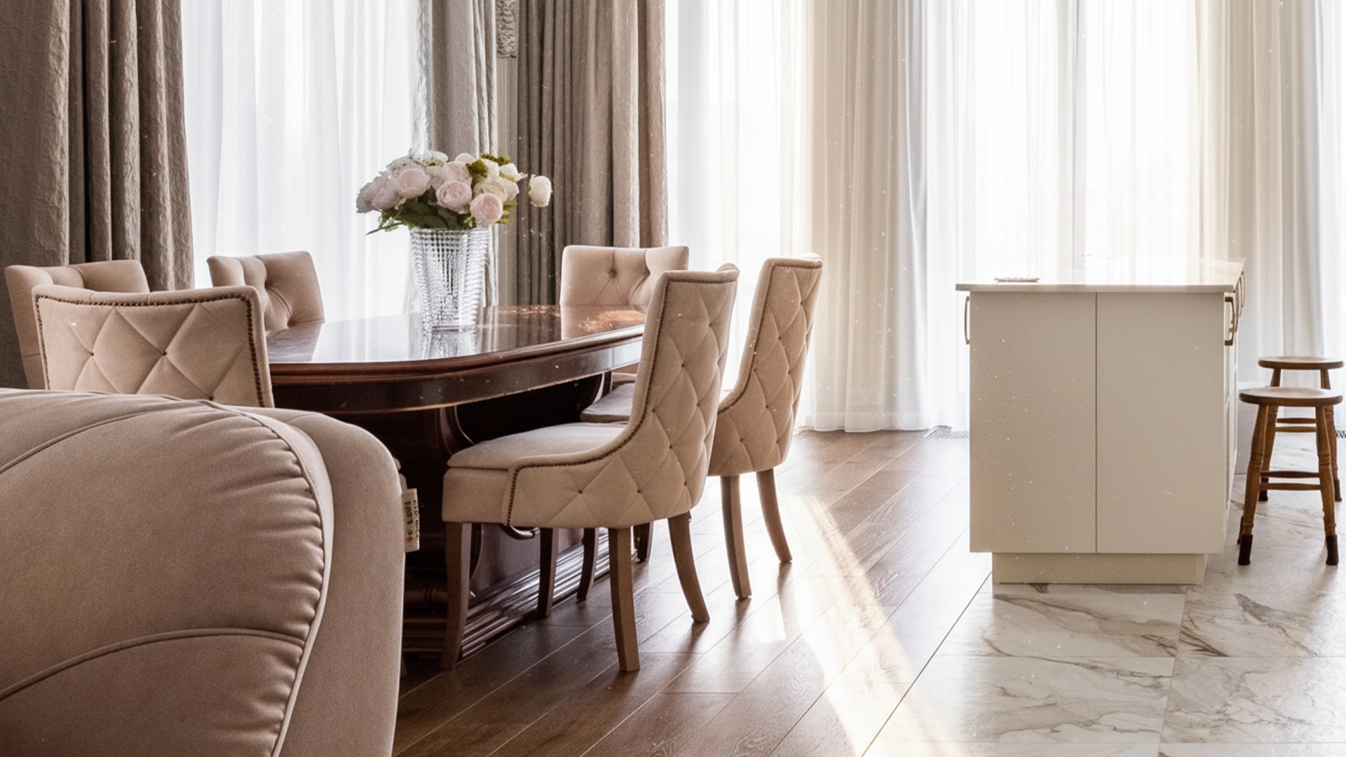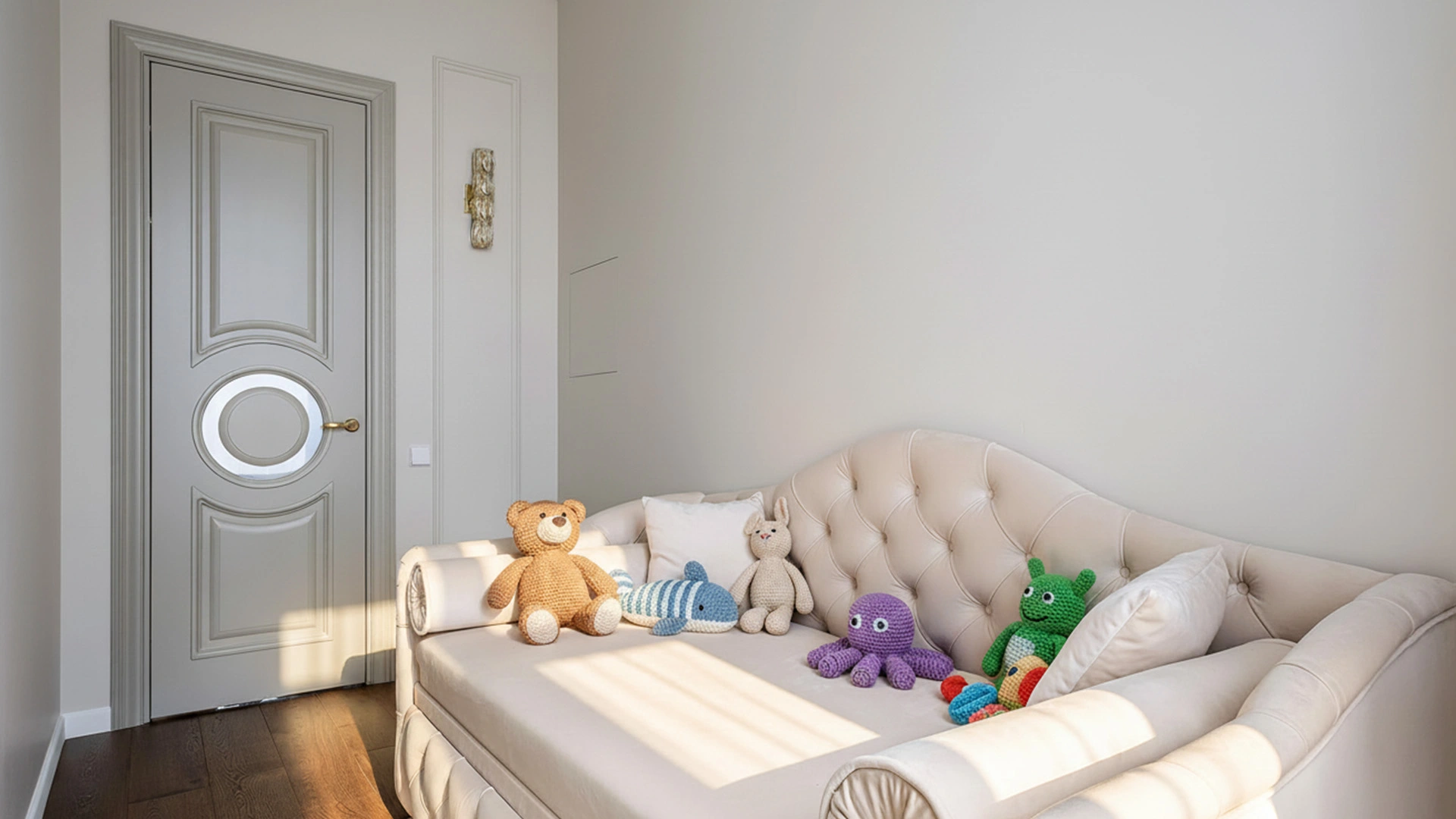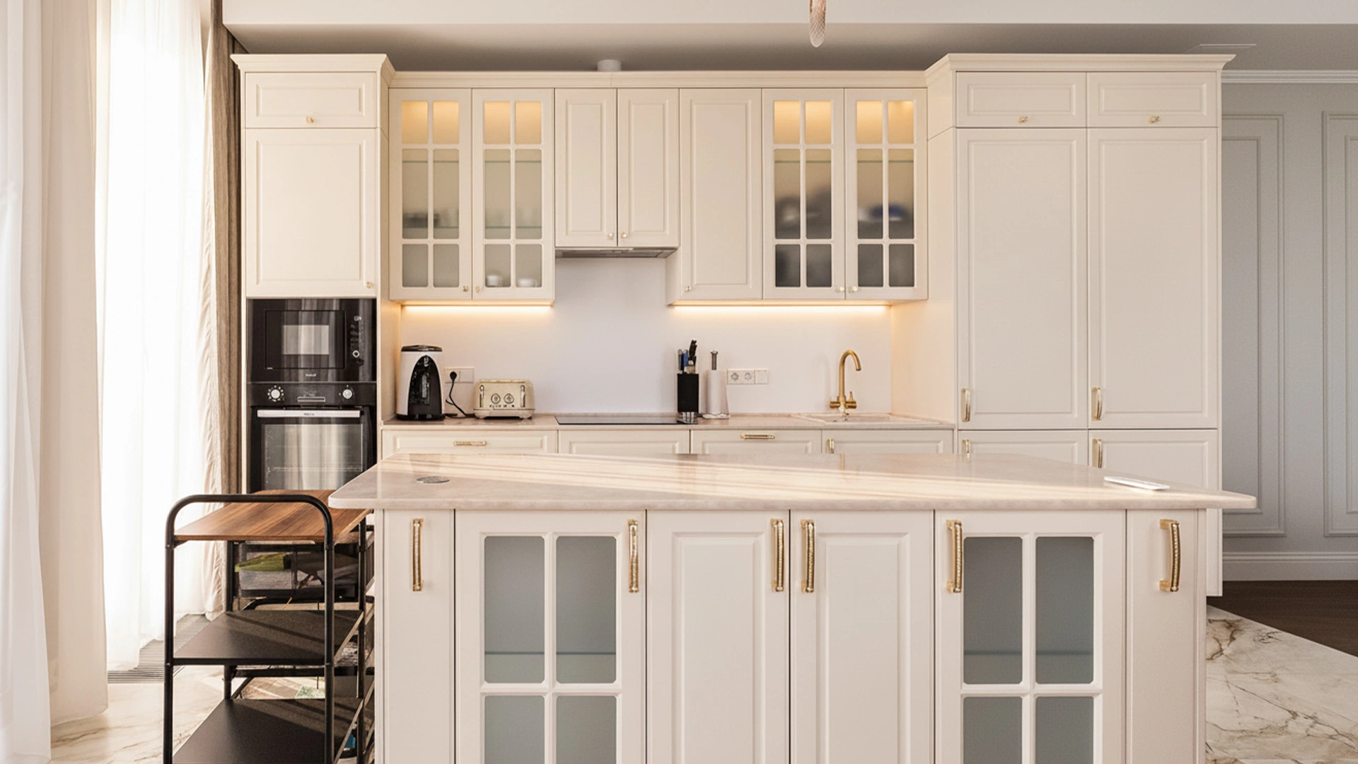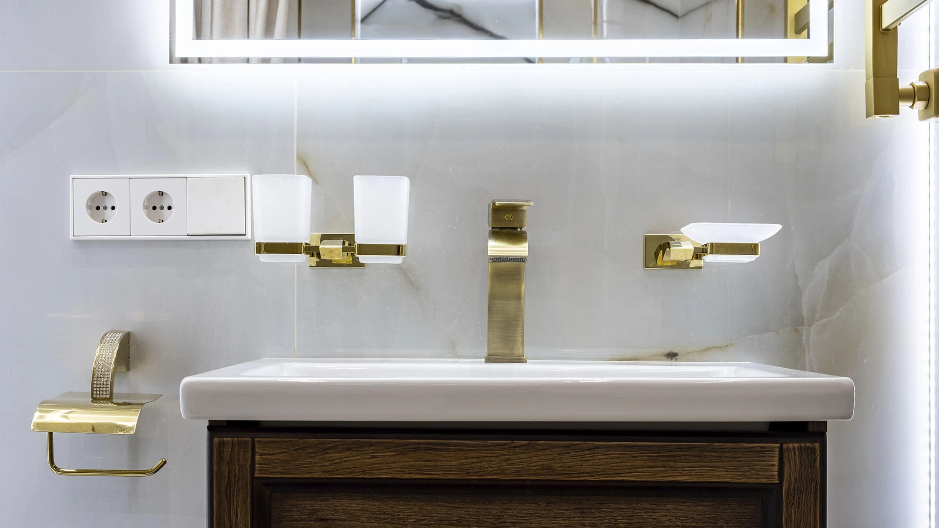 Spacious 3-bedroom apartment with total area of 125 m² in White Khamovniki complex. The interior is decorated in laconic light colors. The flooring is made of natural oak parquet Siberian Floors Prime. The bathroom has Archskin Pietra di Savoia Perla porcelain stoneware, a natural stone sink and Dornbracht Vaia faucets.
