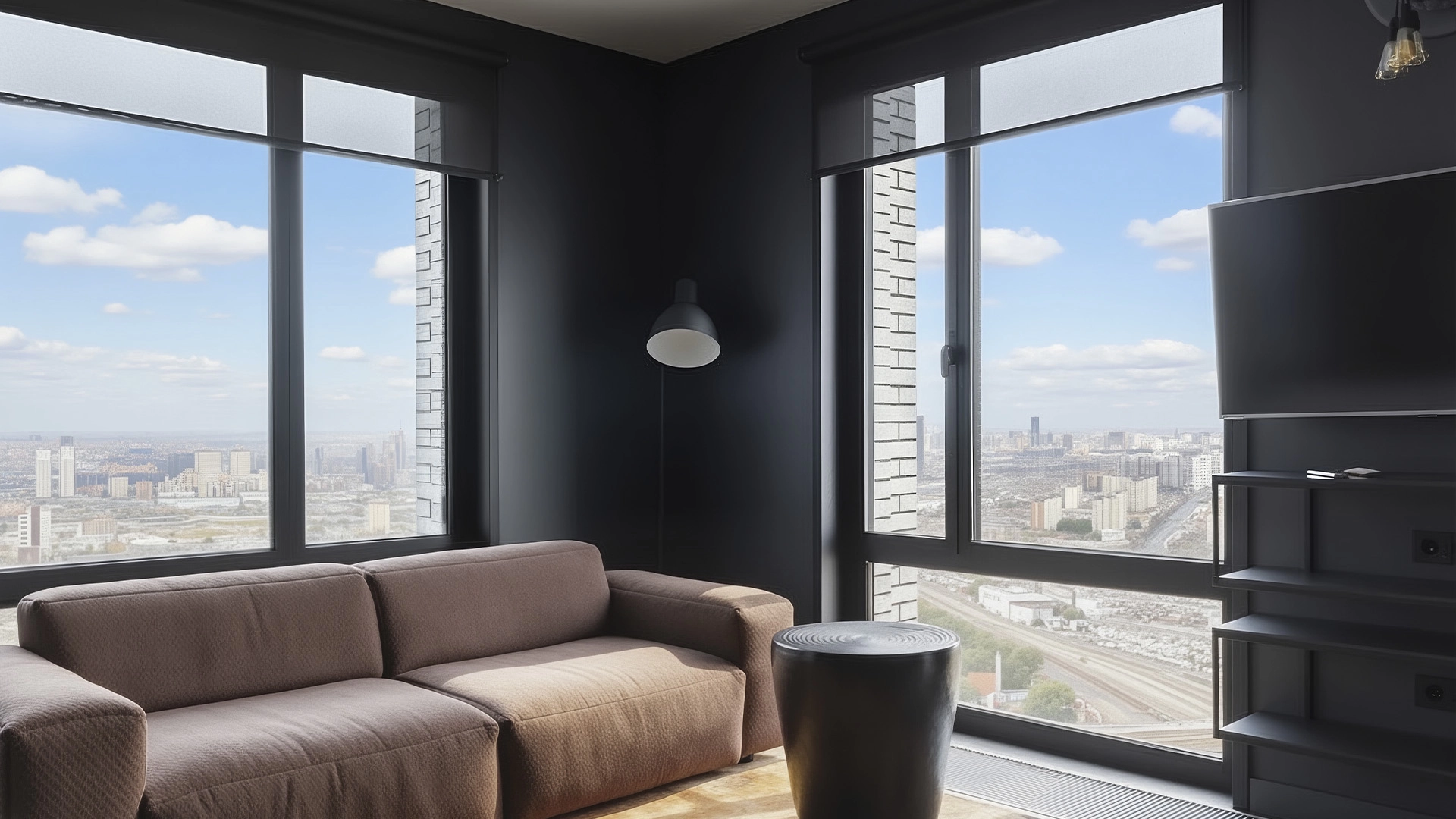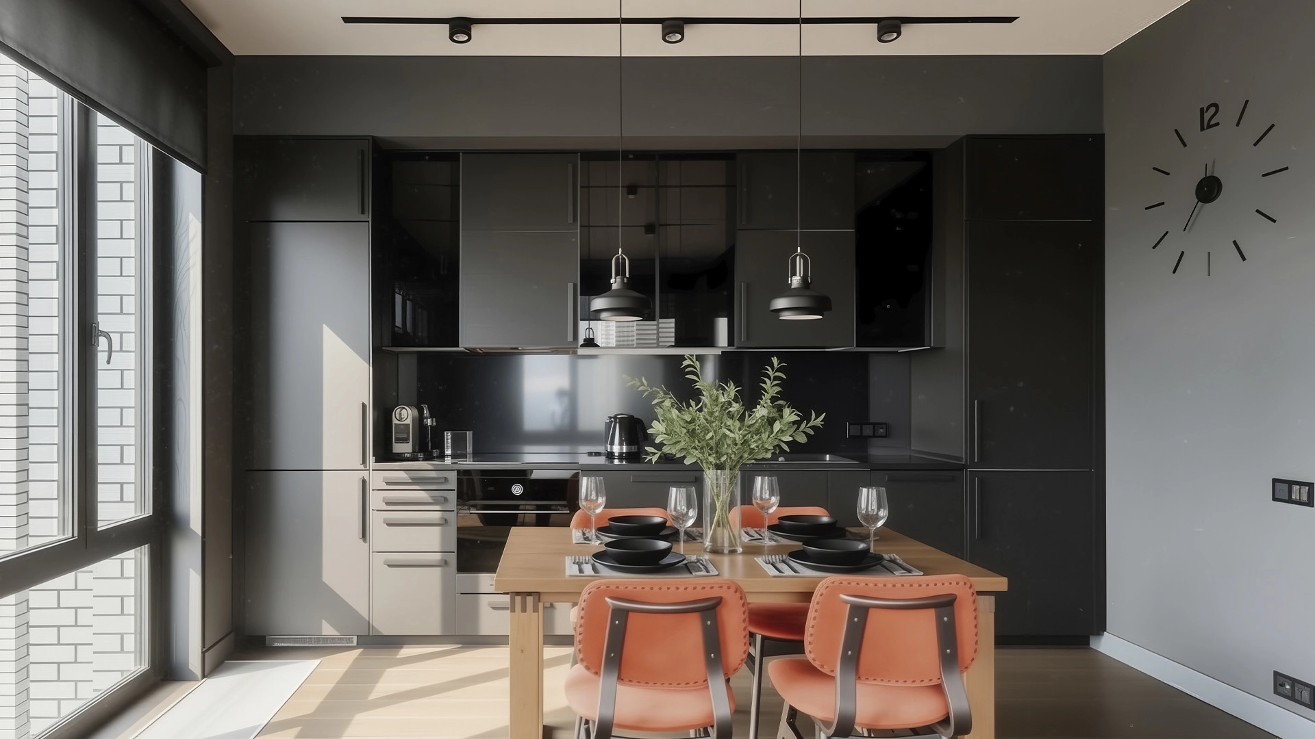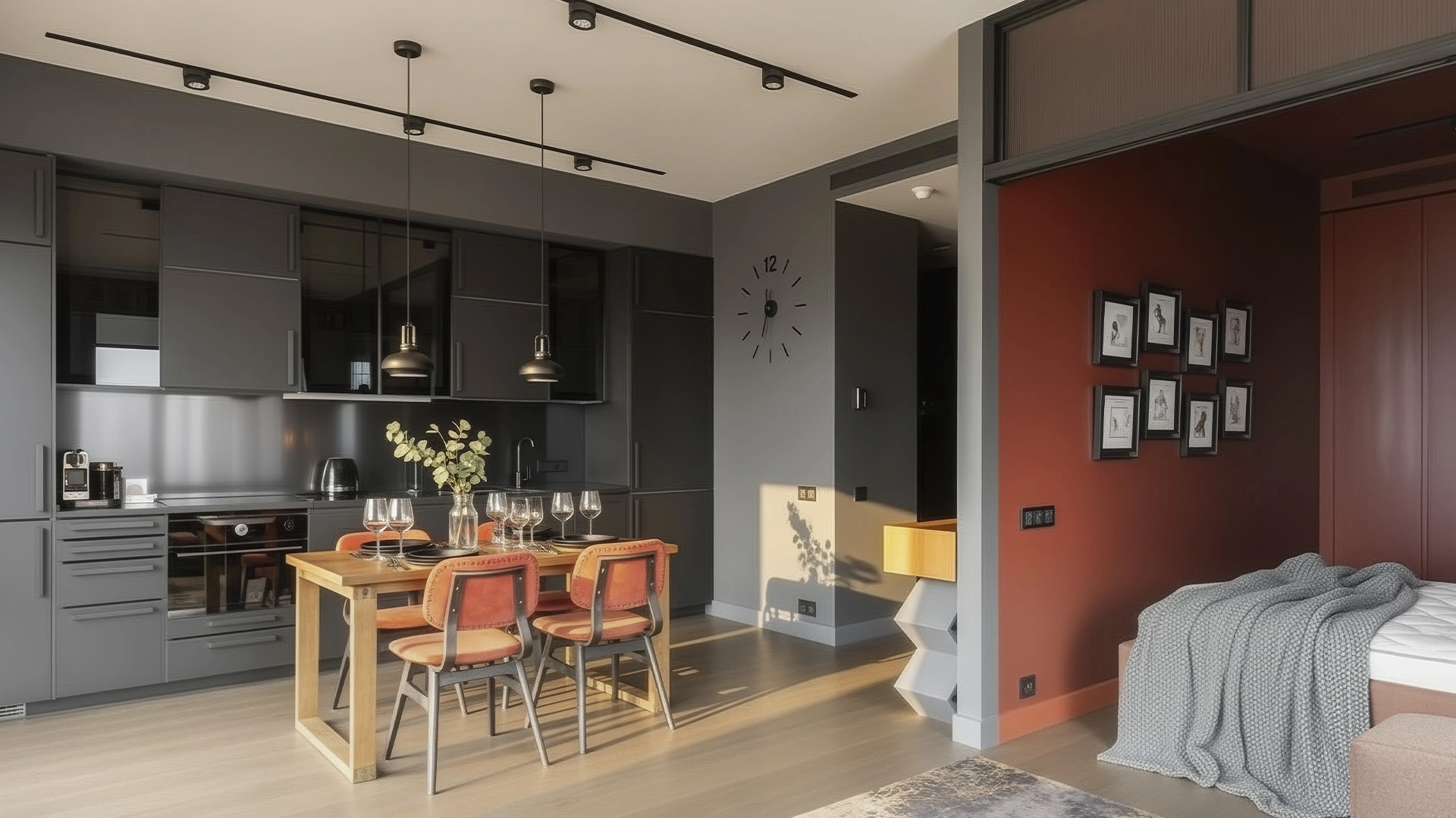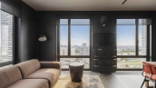 The design project of the apartment was published in the international magazine Elle Decor. Deep shades of graphite and charcoal give the interior nobility, and wine-terracotta and brown accents add warmth and coziness. All necessary furniture and appliances, including air conditioners, are installed for your comfortable stay. The layout includes a kitchen area, a lounge by the window, a bedroom area decorated with glass partitions and a bathroom with shower.