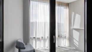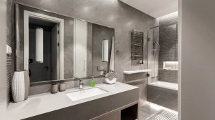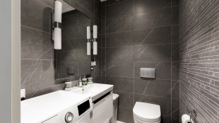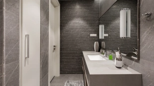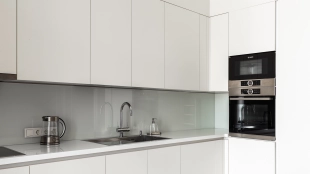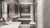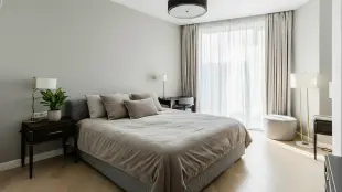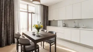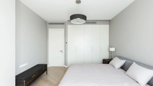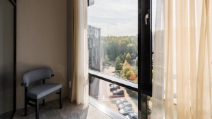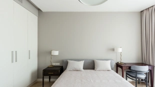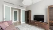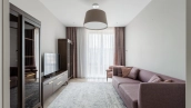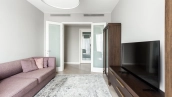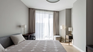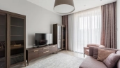 One bedroom apartment with total area of 76 m² in the premium-class complex "Skolkovo Park" on the seventh floor. It is finished in a modern style in laconic light colors. Thanks to panoramic windows and high ceilings, the space is filled with natural light. There is a living room, a kitchen with a dining area and access to the glazed loggia, a bedroom, a bathroom, a guest bathroom, a dressing room, a hallway. The apartment is fully furnished and equipped with household appliances. The windows overlook the landscaped courtyard-park.
