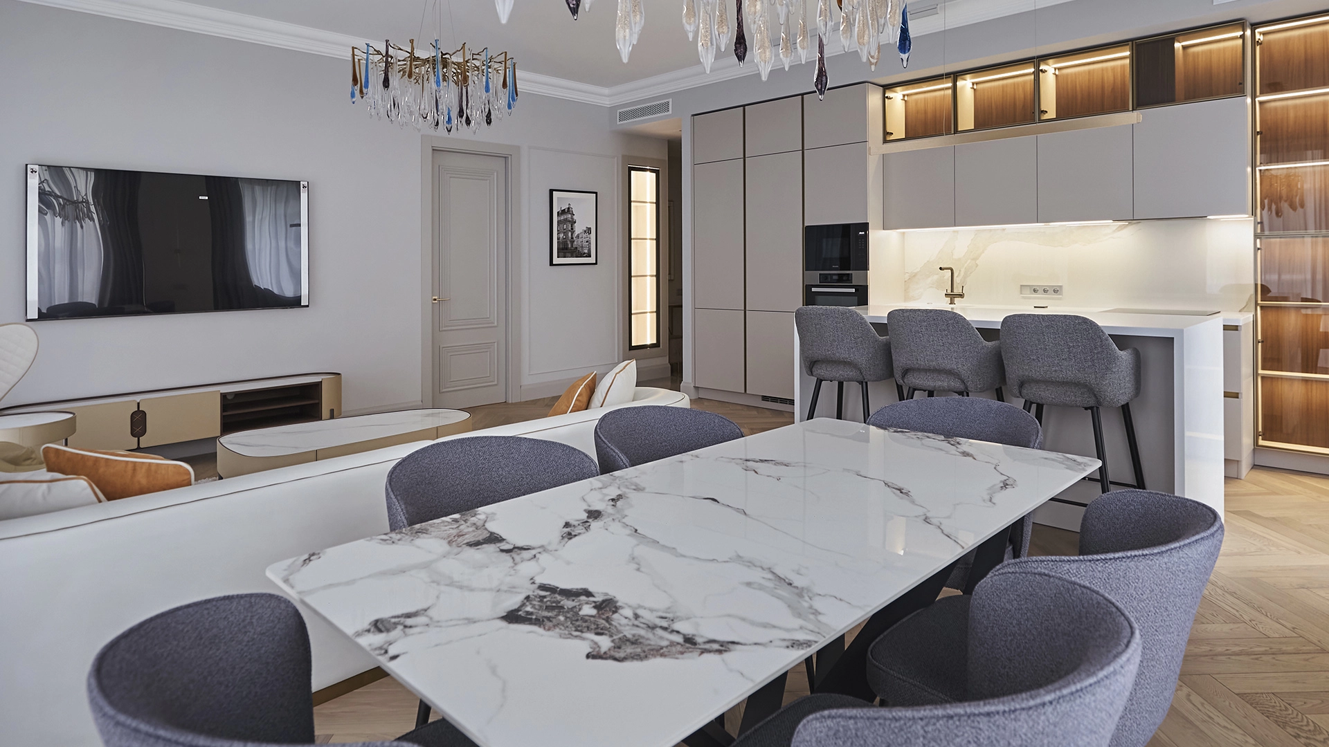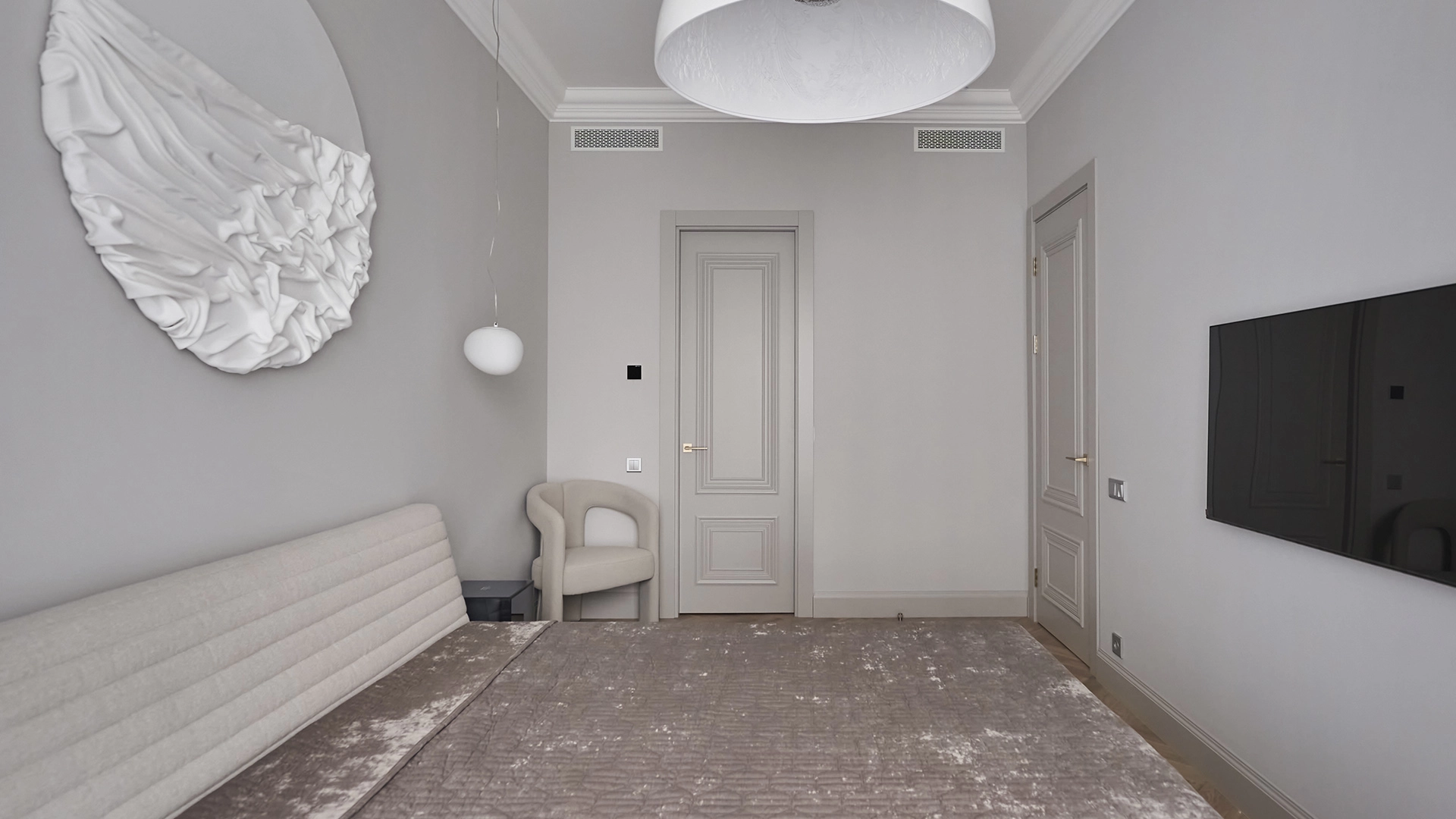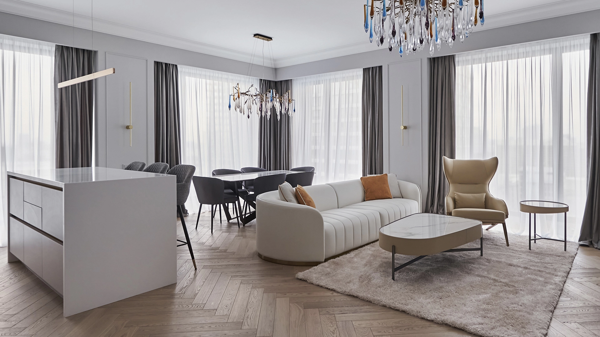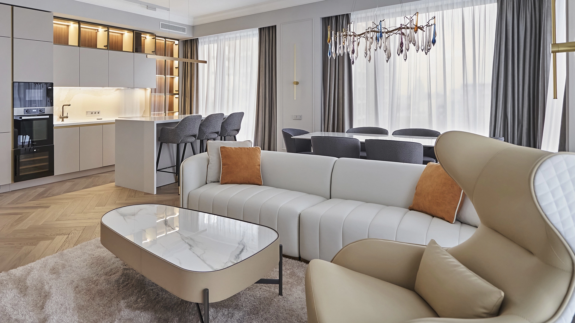 The apartment has a corner kitchen-living room, master bedroom with its own dressing room and bathroom, 2 bedrooms, dressing room, 2 bathrooms, hallway. Thanks to panoramic glazing and 3.1 meter high ceilings, the space is filled with air and natural light. The windows overlook the internal park.